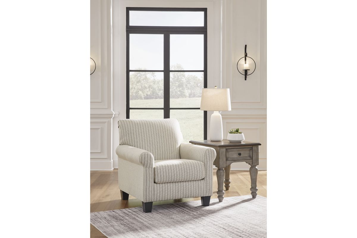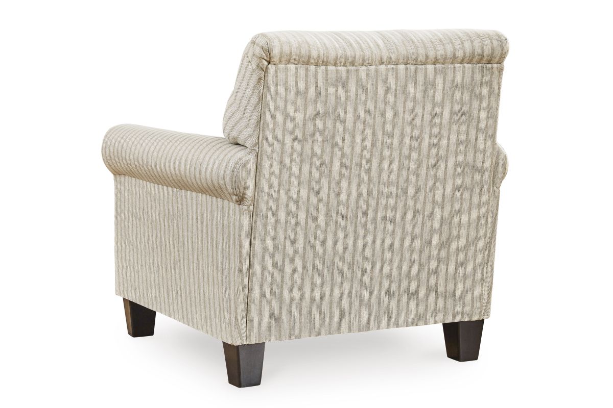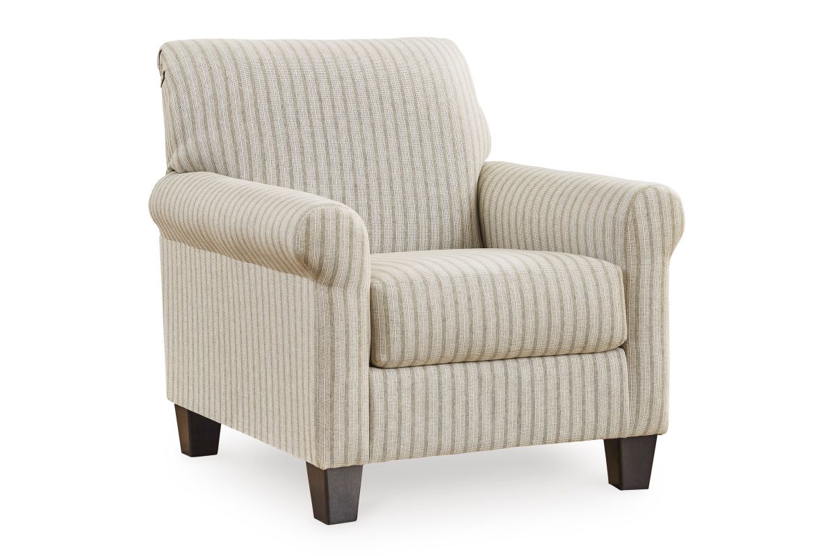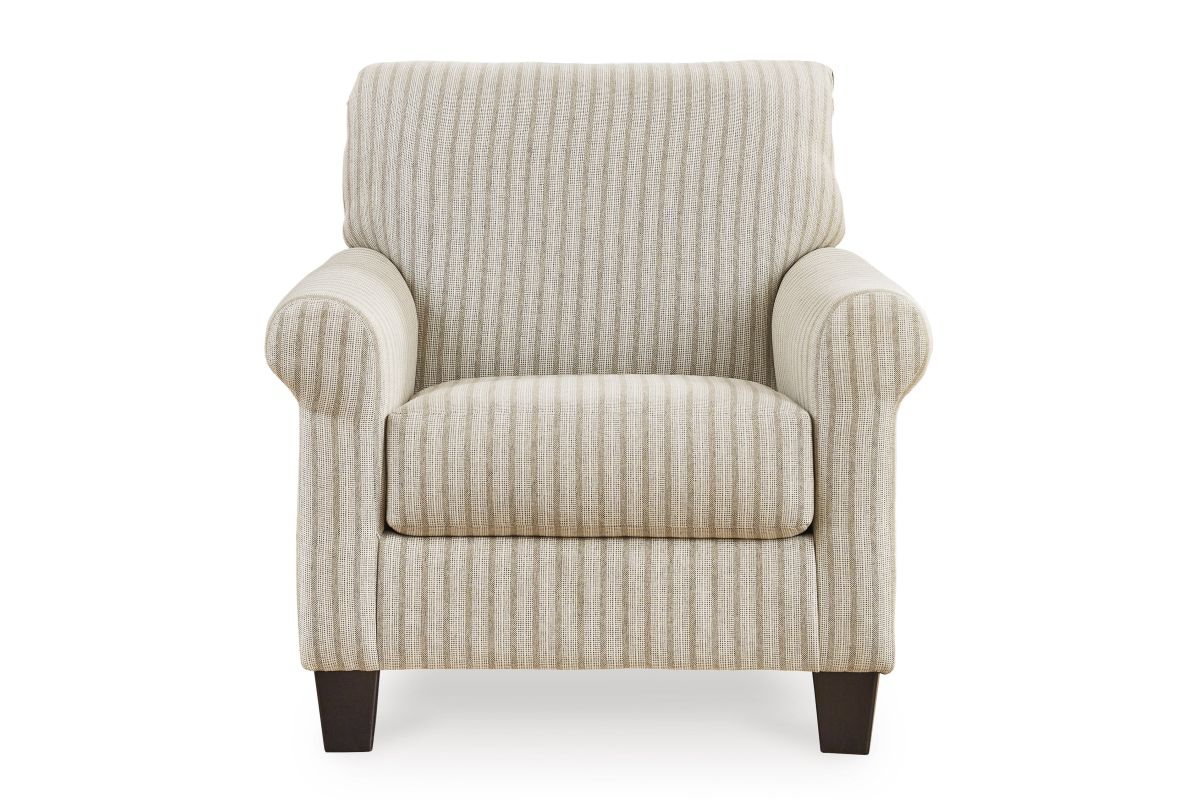 Seeking simple, transitional style? Enter this accent chair. Its commitment to carefree comfort is right at home with your relaxed living room aesthetic. A classic striped pattern elevates the everyday charm of the neutral fabric, while the deep, plush seat brings a cozy vibe to this chic piece.
