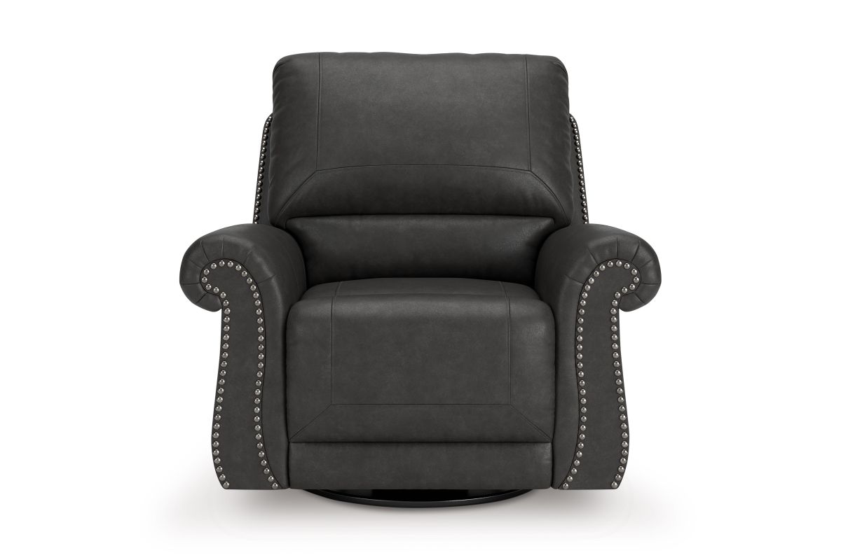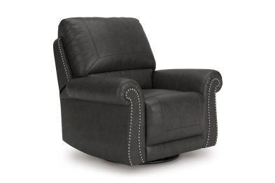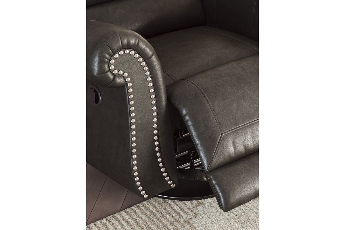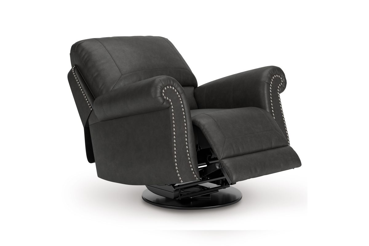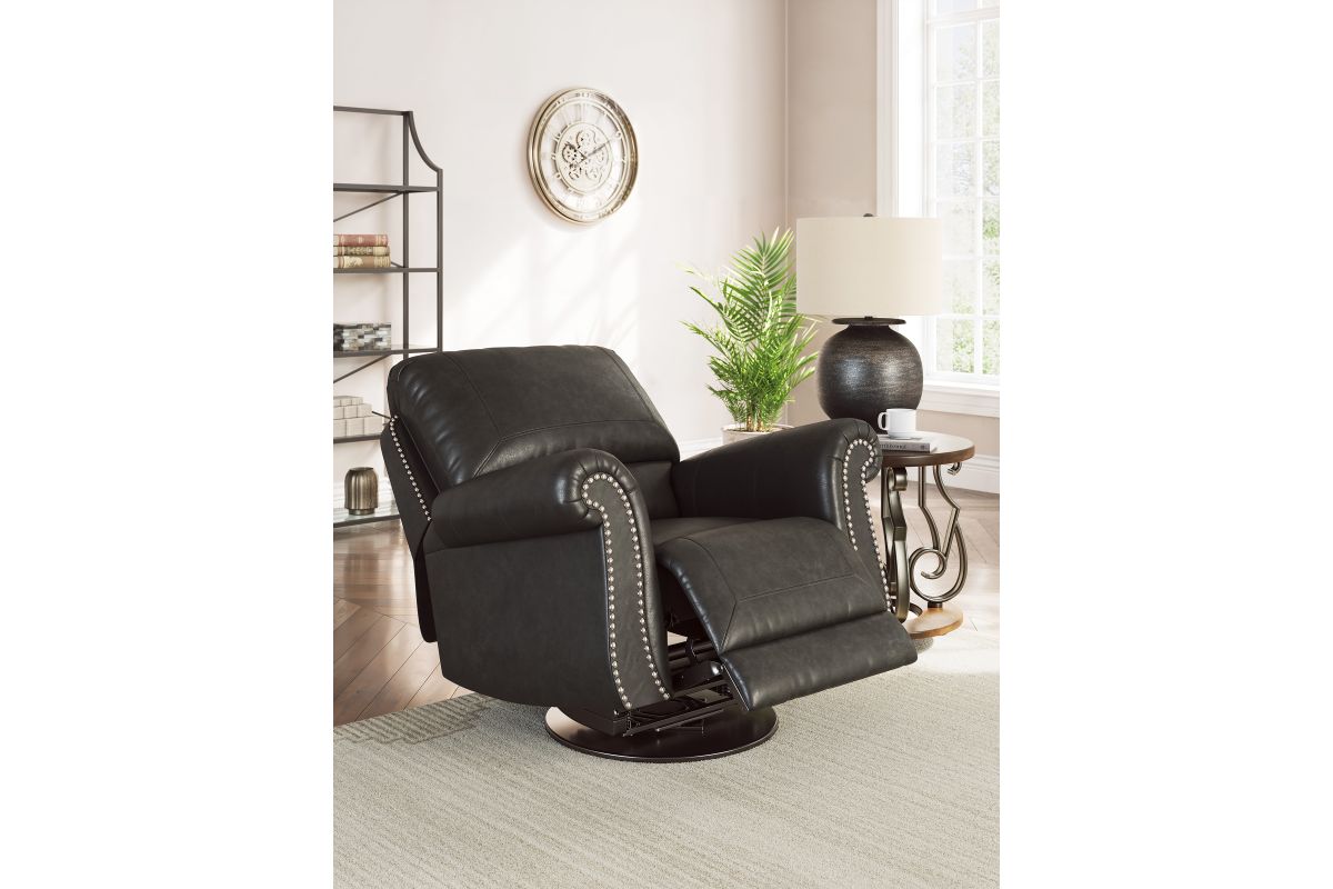 Everyone can have the best seat in the house with this swivel glider recliner. Its nailhead trim puts the finishing touches on the traditional roll arms you love. The recliner's comfy, durable cushions—wrapped in a rustic yet sophisticated faux leather—keep you feeling relaxed, while its turned legs show that style and quality flow from top to bottom. Plus the smooth reclining motion and 360-degree swivel keep you in the flow of conversation. Minimal assembly required.