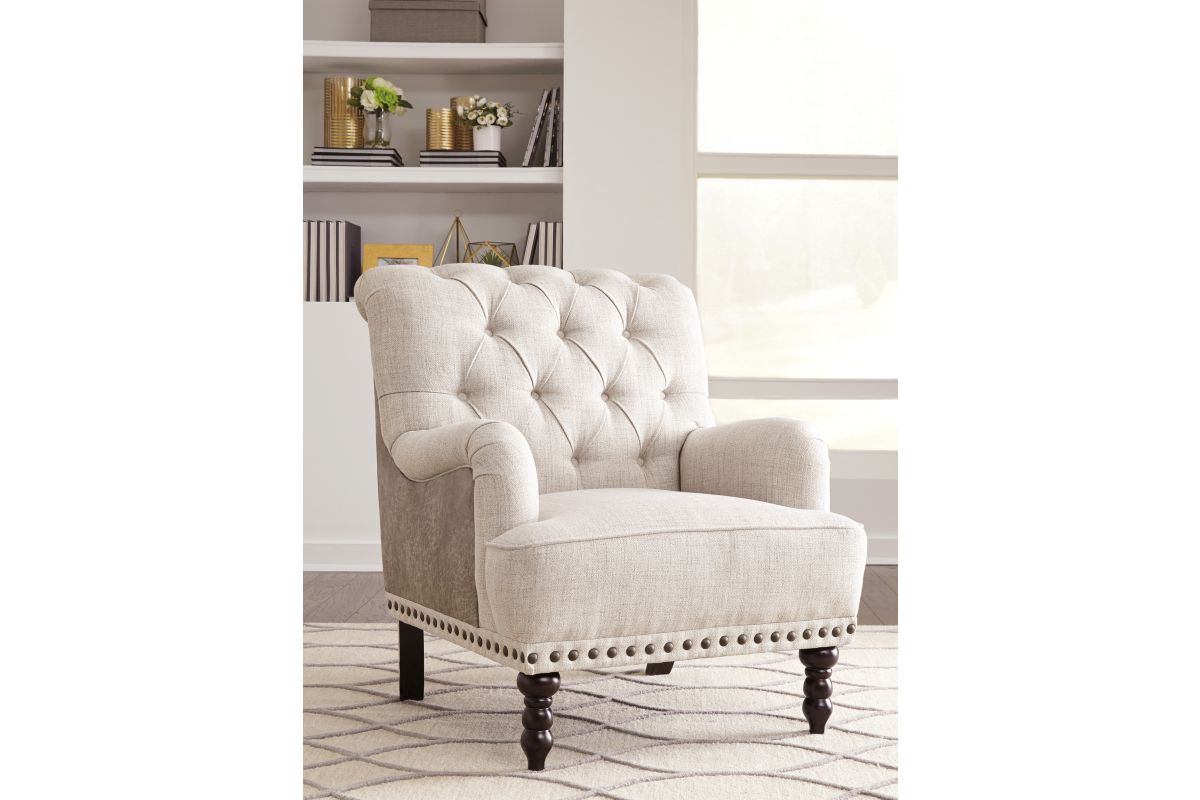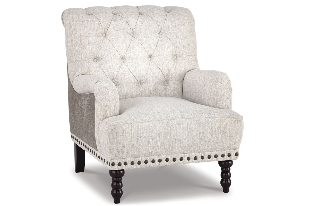Fresh and sophisticated. This accent chair with button tufting is a classy addition to your home. Inside-out design with linen weave fabric on the seating area and taupe faux leather on the back. Large nailhead trim ties the look together. Charles of London arms and turned bun feet make this a stylish heirloom piece. Assembly required.