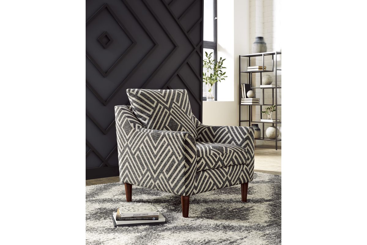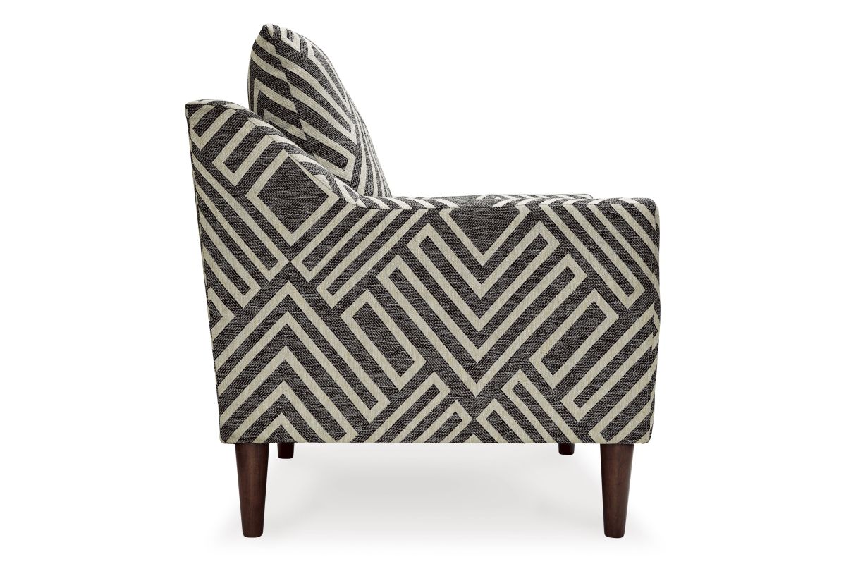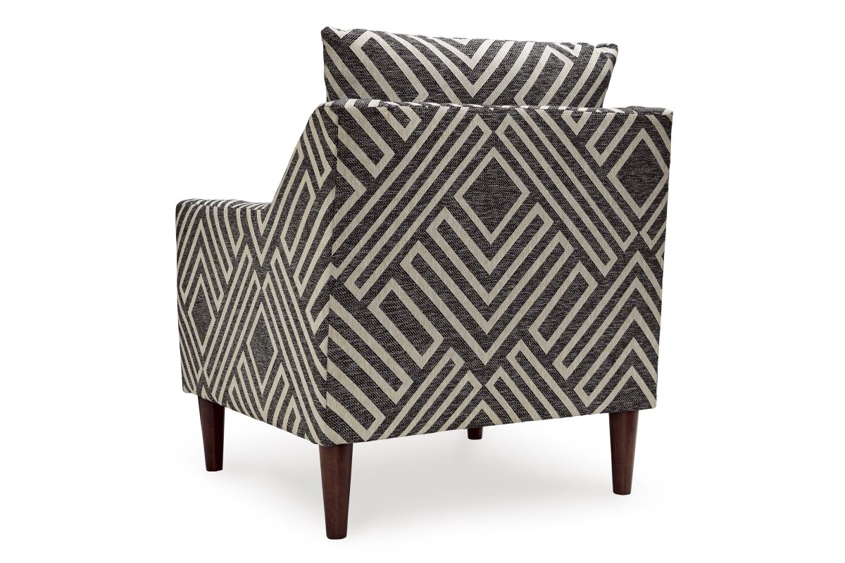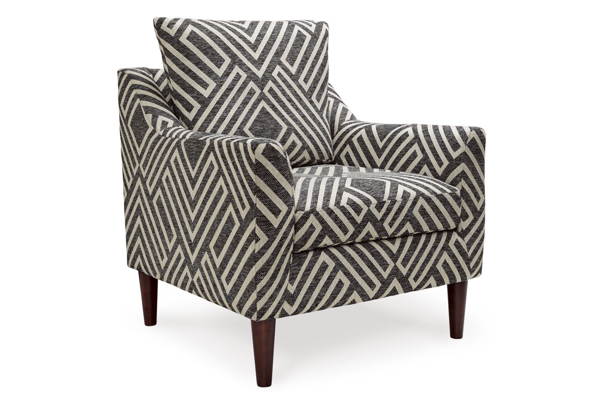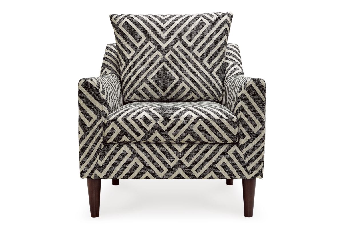- Upholstered in natural and charcoal geometric patterned polyester Next-Gen Nuvella fabric