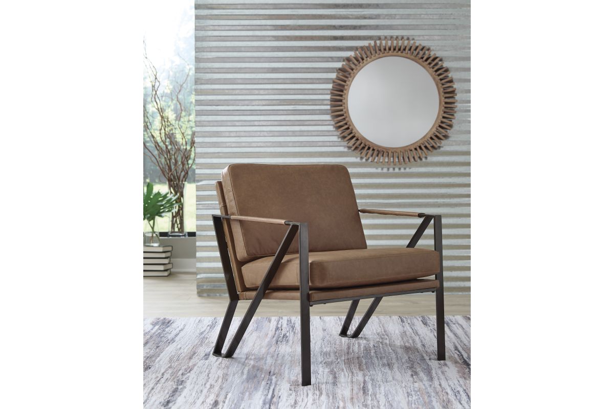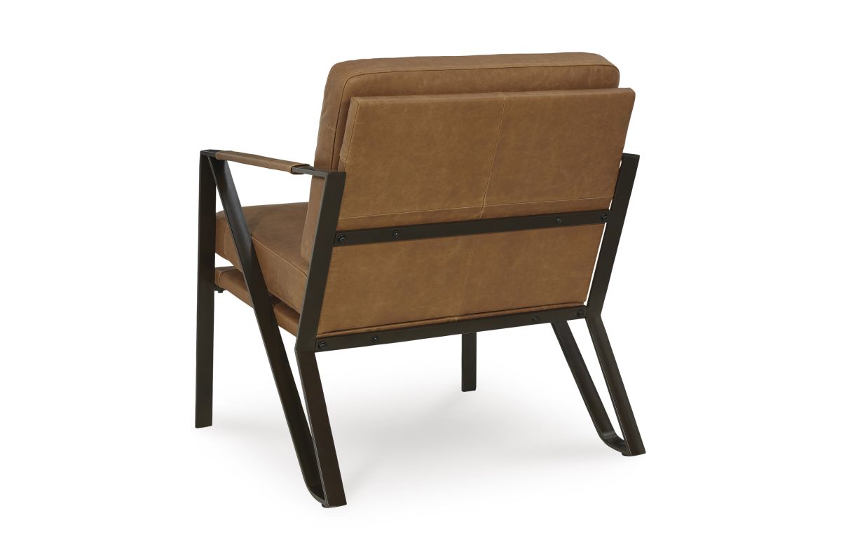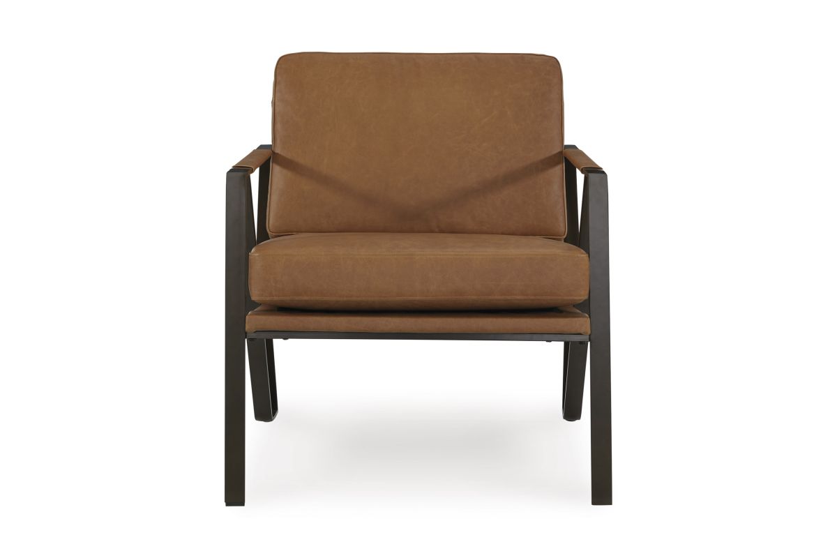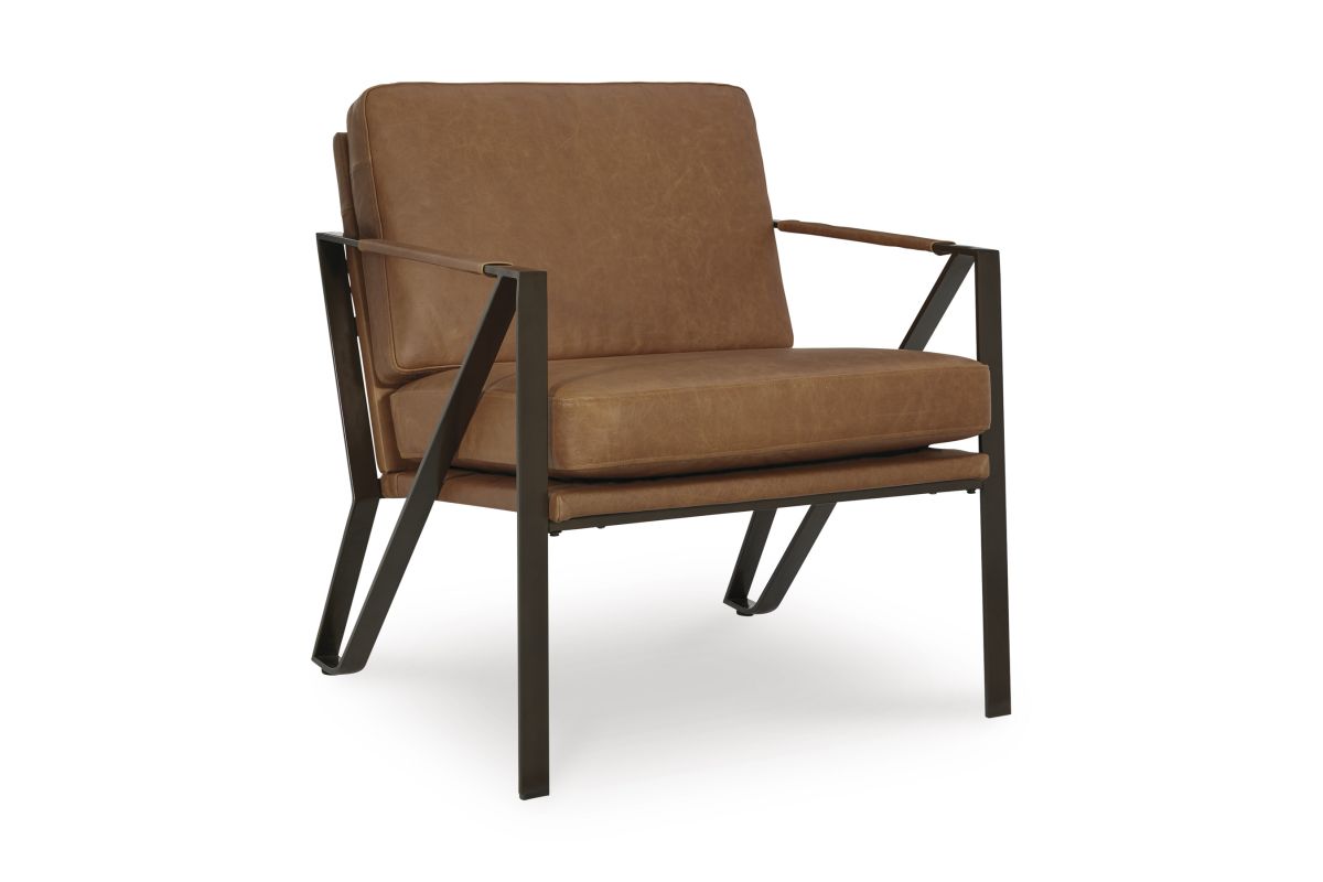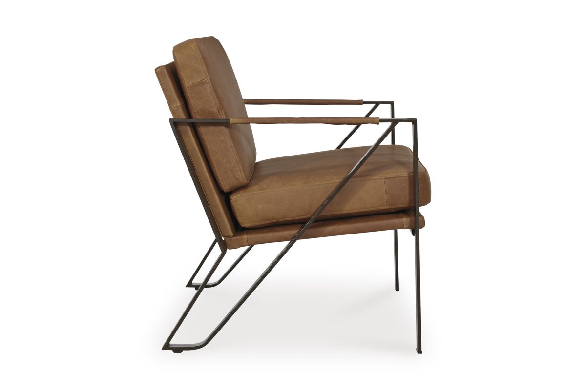 Work an ultra-cool look with this accent chair. A linear metal frame in a bronze-tone finish lets your love of contemporary style shine. Tailored cushions and armrests wrapped in sumptuous caramel-colored leather enhance this piece's feel-good touch. No assembly required.