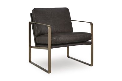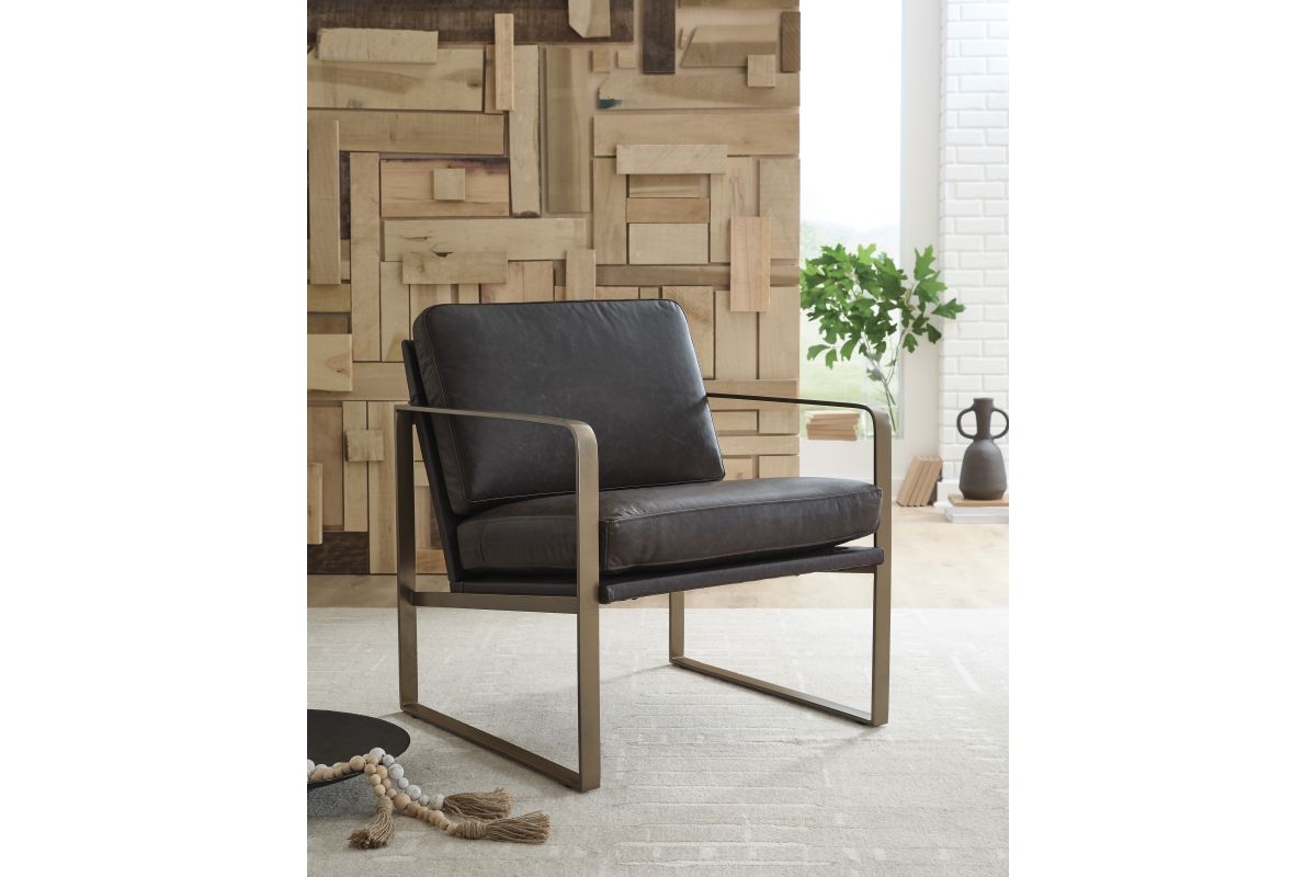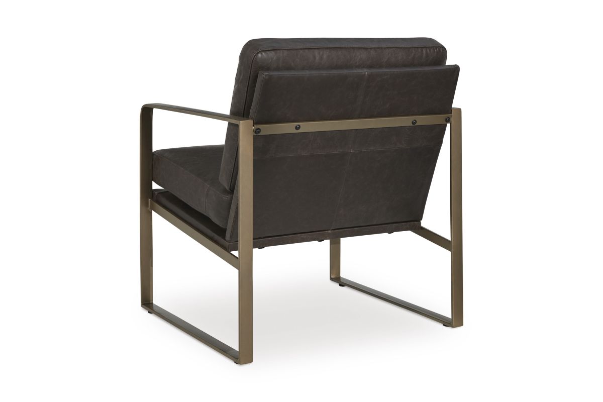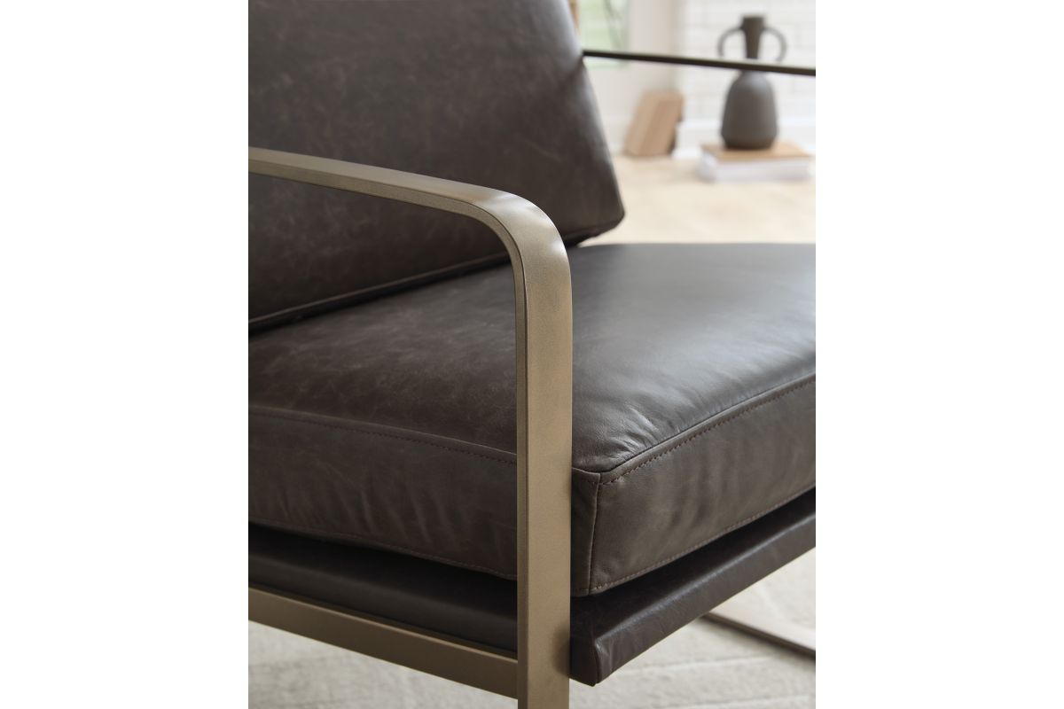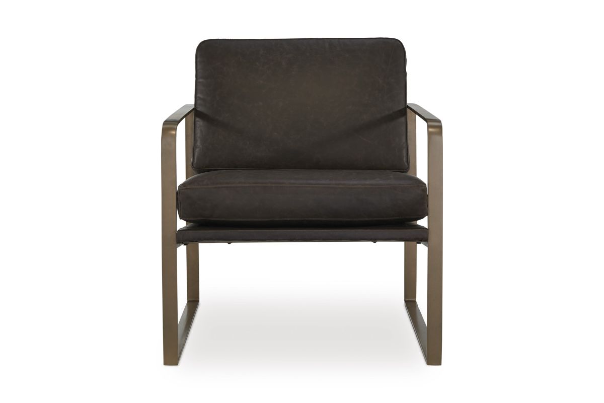 Wowing with supple dark brown leather and a metal frame in a soft goldtone, this accent chair brings an element of modern sophistication. An ultra-cool base gives so much urban industrial appeal. No assembly required.