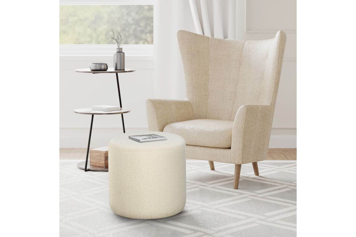 Studio Living's line of stylish ottomans adds a warm and inviting feel to any room in the house. The Garber ottoman comes in a cylinder shape, making it perfect for sofas, loveseats or lounges. Place with chairs and existing furniture or use on its own as extra seating. It makes a great accent in living rooms, bedrooms, and homes offices alike. The Garber is upholstered in an ivory boucle fabric. Ottoman is ready to use, no assembly required.