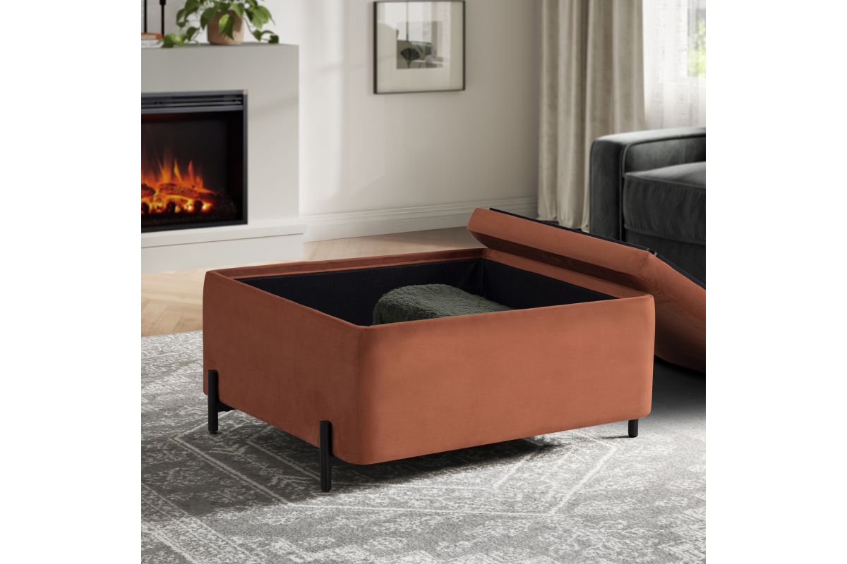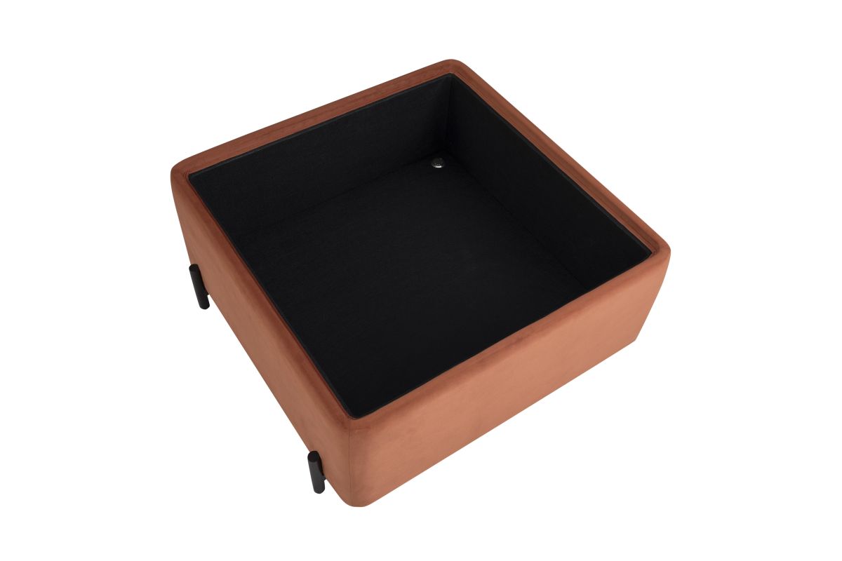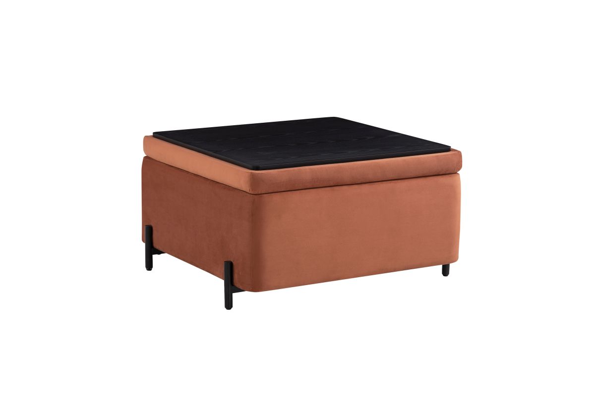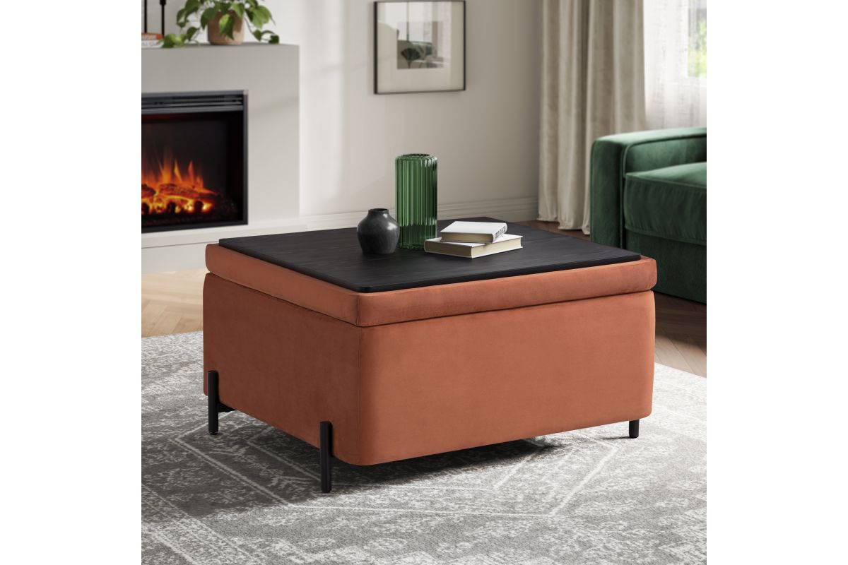 - Reversible storage lid effortlessly flips to transform from a plush velvet seat to a functional coffee table surface.