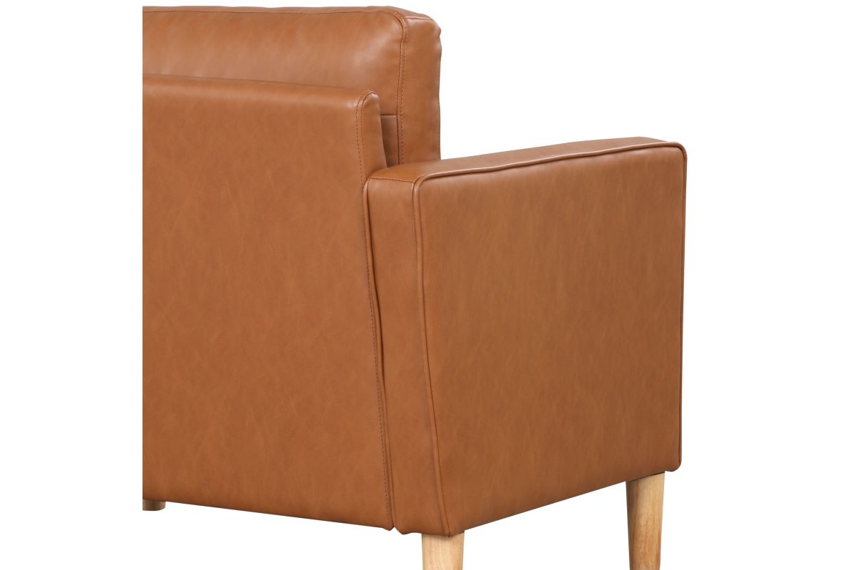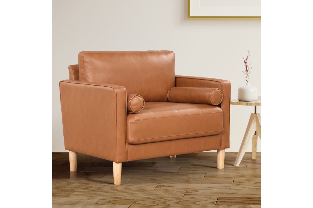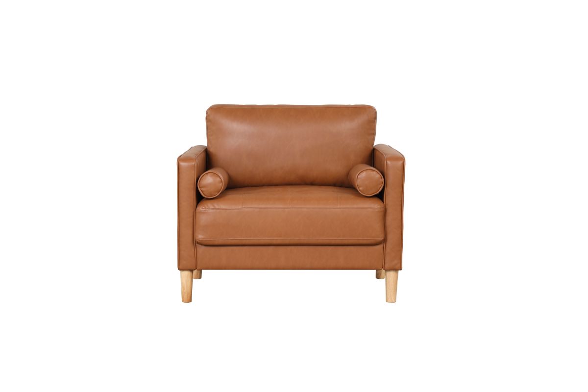 Style has never been so sweet! The Langdon Sofa Set's rich caramel-colored Vegan Leather upholstery instantly draws the eye, and the simple assembly ensures that you can start enjoying it right away. The cushions are packed with high density foam and pocket coils, while the cylindrical throw pillows provide flair as well as added support. The light wood legs support a solid hardwood frame, creating a durable set to serve as the centerpiece of your living space. Asembly is required upon delivery.