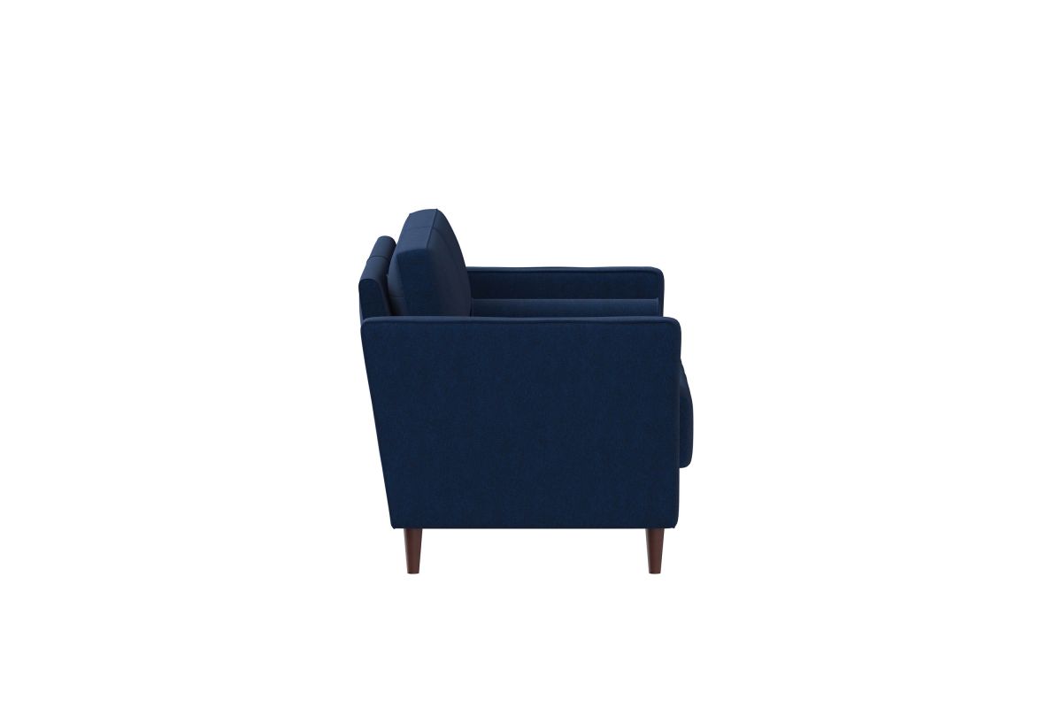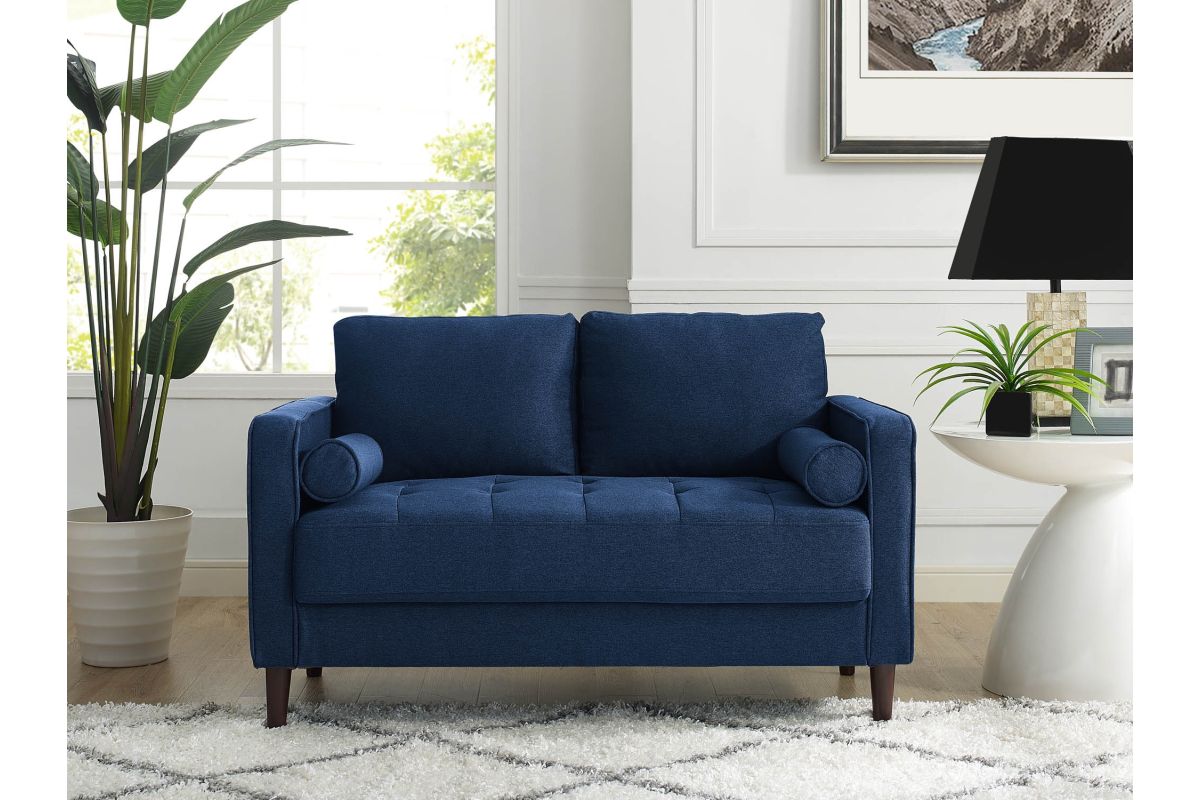 The Langdon Loveseat brings together minimalistic style and functionality in this beautifully designed collection. The Langdon’s compact profile makes it ideal for small spaces, constructed with solid hardwood frame and black finished wood legs. Additionally, the Langdon is fitted with tufted high density foam seat cushions with pocket Dream Coils construction, removable back cushions and high performance upholstery. This inviting loveseat epitomizes lasting quality and comfort, upholstered in highly durable navy blue fabric this stunning piece is the focal point of any room big or small. Easy to clean, the Langdon will keep secret any spills from game night and last for years. Made to be lived-in, you will love this Loveseat from first sight but in time it is sure to become the family’s "comfy place" to relax and lounge. Asembly is required upon delivery.