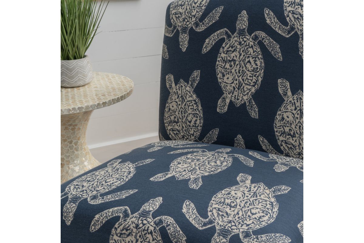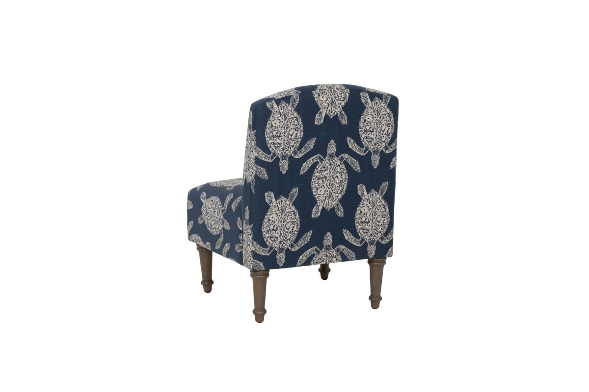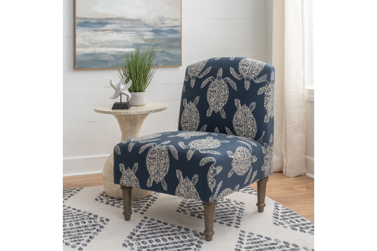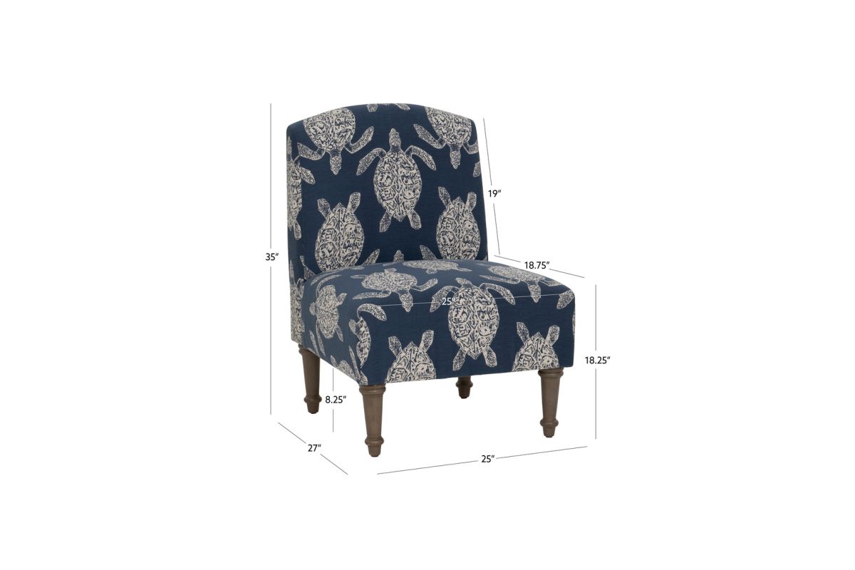 Add a splash of personality and coastal charm to any space with this beautifully upholstered accent chair. The navy jacquard fabric features a subtle turtle motif, bringing a breezy, nature-inspired touch to your living room, bedroom, or entryway. Built on a sturdy rubberwood and plywood frame with gently tapered legs in a greywash lacquer stain, this chair is as durable as it is eye-catching. With a roomy seat height of 18.25" and a weight capacity of up to 350 lbs., it blends comfort and style for everyday lounging. Assembly required.