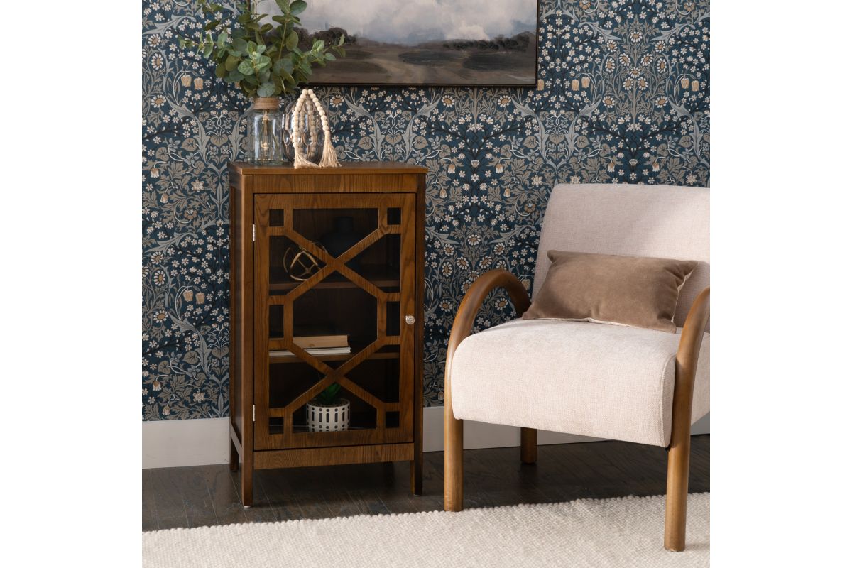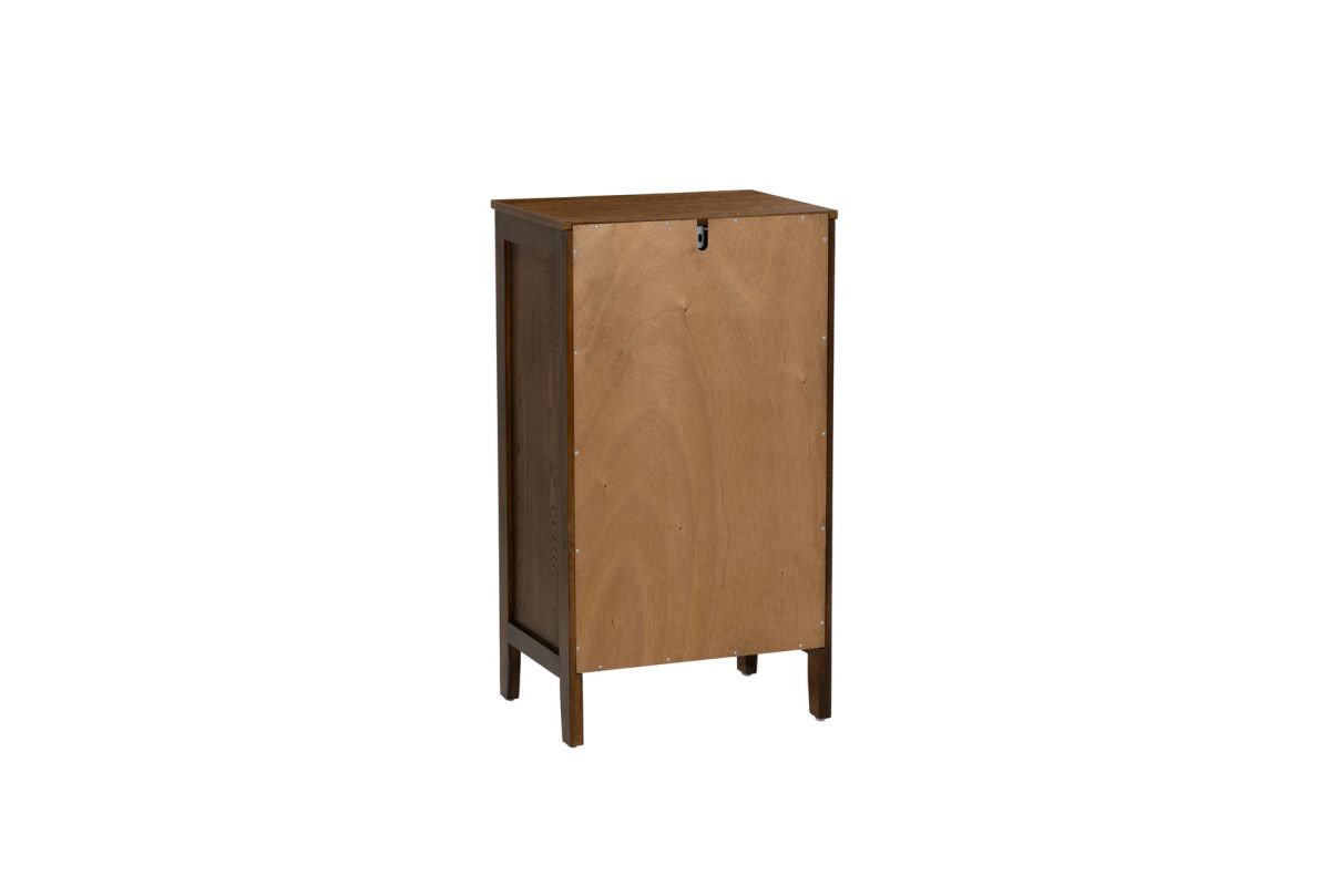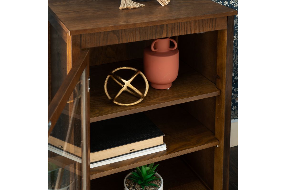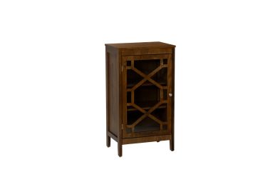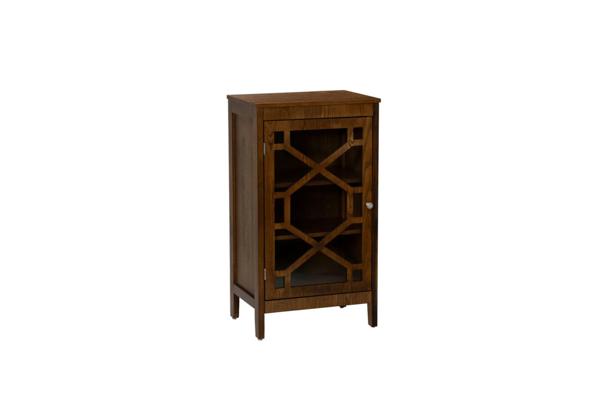 This beautifully designed small brown cabinet adds charm and functionality to your home. Measuring 20.13" L x 15" D x 36.25" H, it's the perfect size for compact spaces, offering style without compromising practicality. Crafted from durable MDF, this cabinet features a rich brown stain that adds warmth and sophistication to your decor. The front is adorned with an intricate design and tempered glass, creating a visually stunning piece that's as elegant as it is functional. Whether placed in your entryway, living room, or bedroom, this cabinet provides versatile storage with a touch of refinement. Use it to organize your essentials or showcase decor for a space that's both tidy and inviting.
