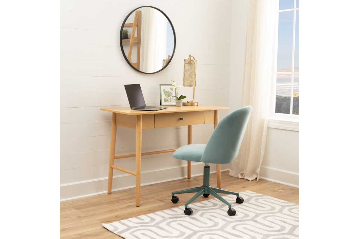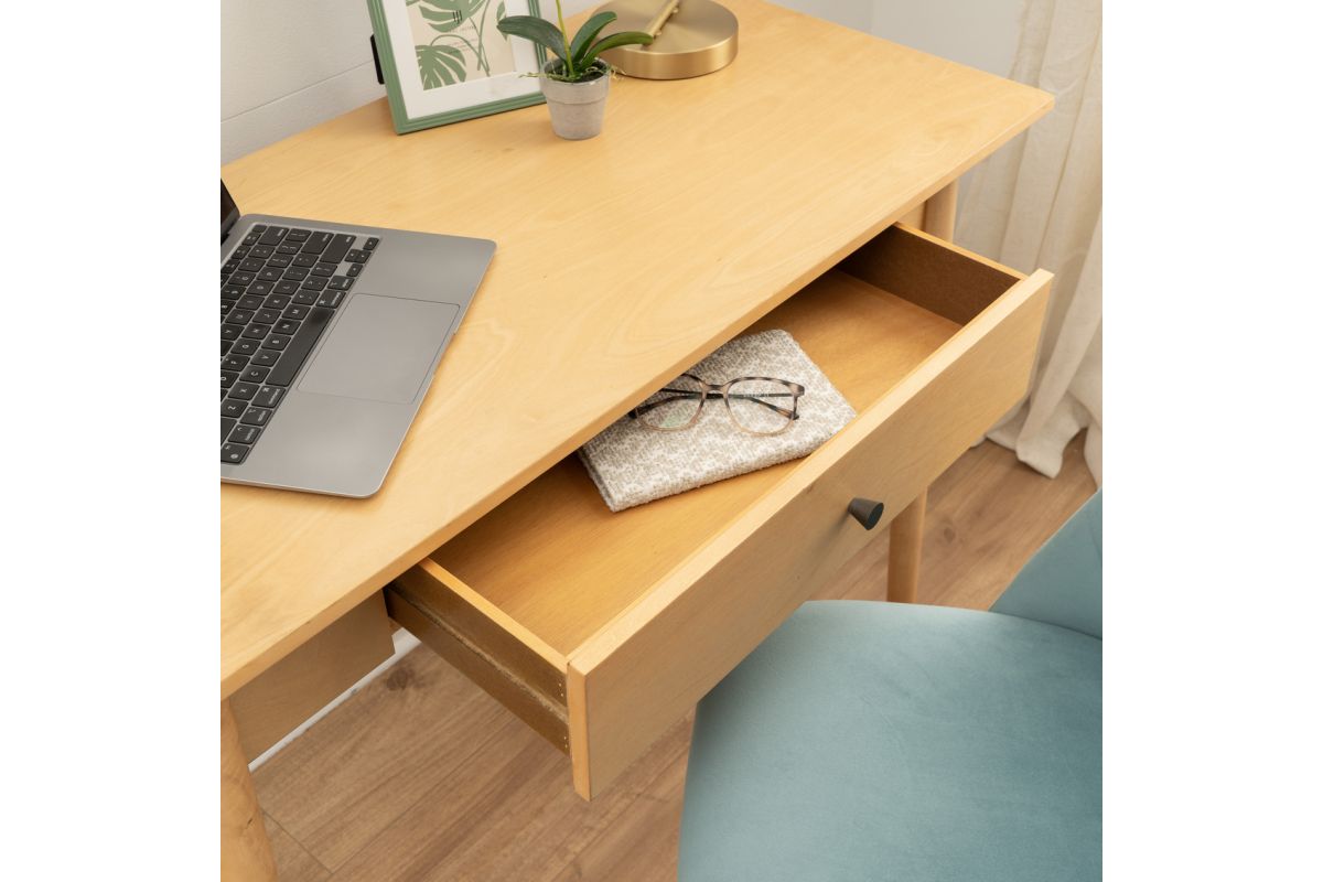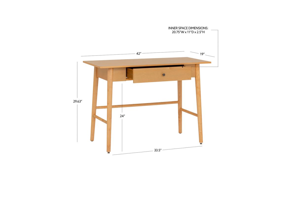 Elevate your workspace with this stylish natural stain desk, designed to bring warmth and modern sophistication to any room. Measuring 42" L x 19" D x 29.63" H, this desk features a sleek mid-century silhouette that effortlessly complements contemporary and traditional interiors. Constructed from a durable solid and engineered wood blend, it offers a sturdy 100 lb weight capacity on the tabletop, perfect for your computer, books, or decor. The smooth natural stain finish highlights the wood's beauty, adding a welcoming, earthy tone to your space. With a single drawer for convenient storage, your essentials stay organized and within reach. Easy to assemble and built to last, this desk combines style, functionality, and durability for a workspace you'll love.