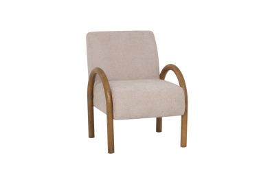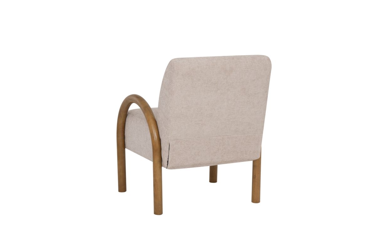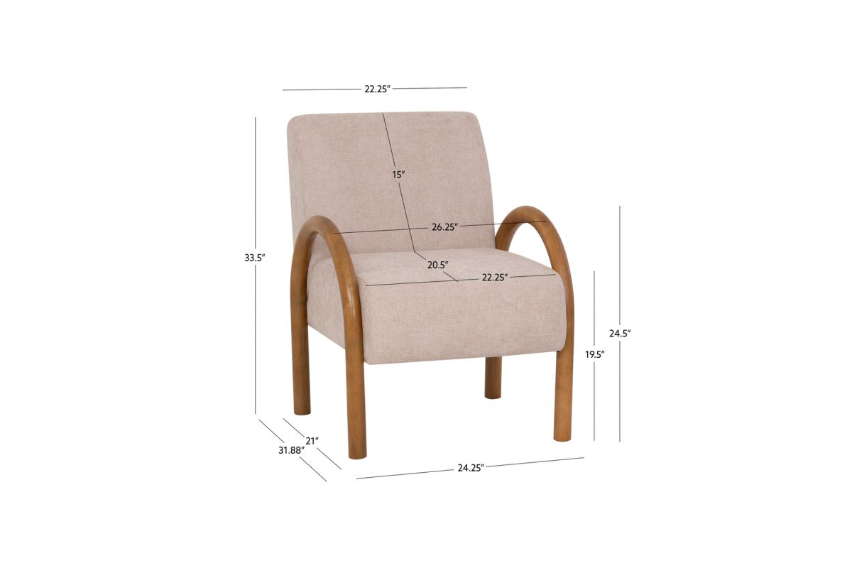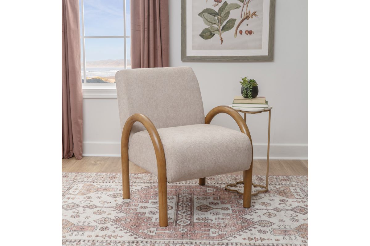 Sink into the soft sophistication of this beige accent chair, designed to bring comfort and charm to any corner. Featuring a curved rubberwood frame finished in a rich walnut stain, this piece blends cozy woven upholstery with sculptural style. The 100% woven polyester fabric adds warmth and texture, while the sturdy inner plywood frame supports up to 350 lbs. Finished with brown levelers for added stability, this chair effortlessly combines mid-century design with everyday comfort. Assembly required.