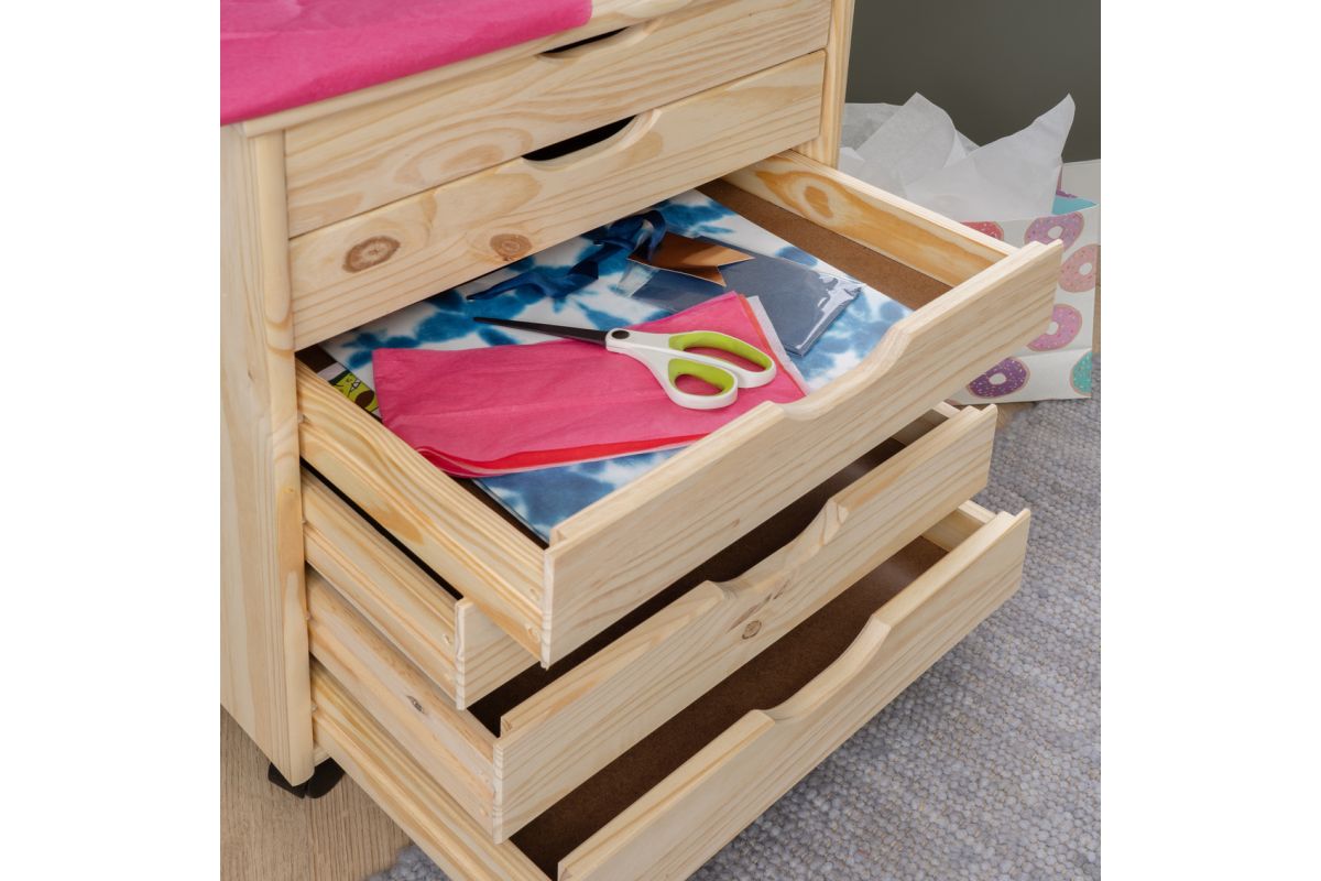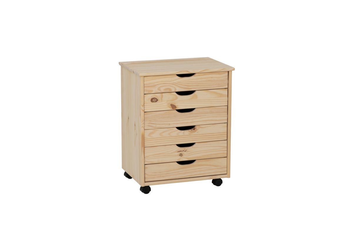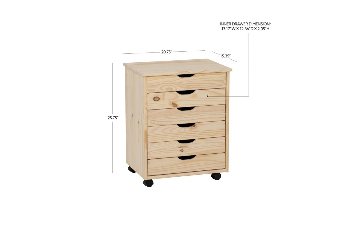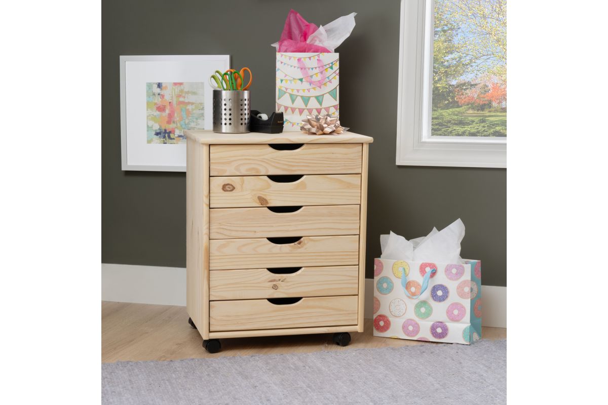 From cluttered to coordinated: this stylish rolling storage cart brings organization and charm to your space. Crafted from durable, unfinished pinewood, it offers a versatile and customizable storage solution. Six spacious drawers measuring 17.2” W x 12.4” D x 2.05” H provide ample room for office supplies, craft materials, clothing, or household essentials. The cutout handles and smooth-glide drawers ensure easy access, while maintaining a sleek, minimalist appearance. Caster wheels ensure easy and smooth mobility. Assembly required.