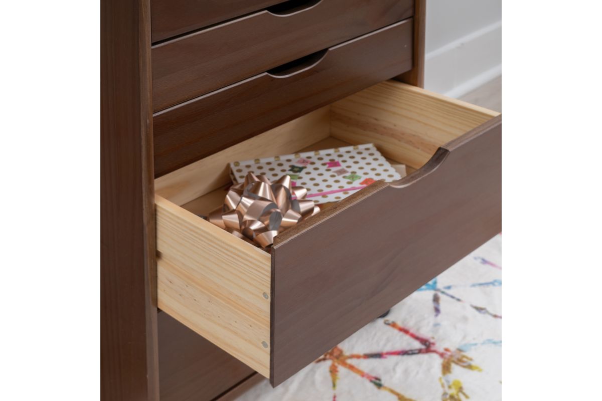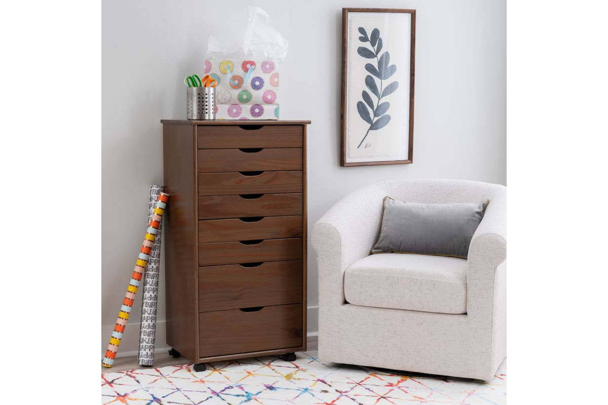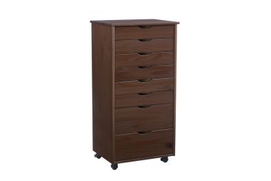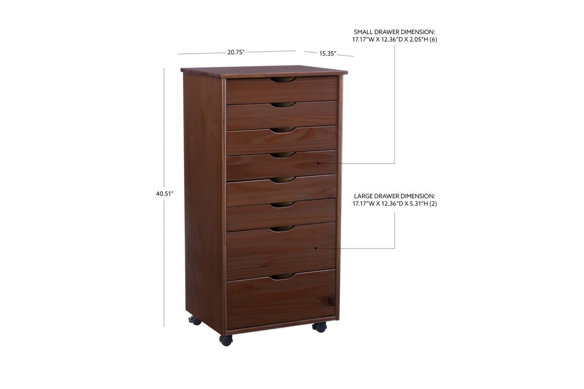 This 8-drawer rolling cart in a warm walnut finish is a stylish and practical storage solution for any room in your home. Featuring 2 large compartments and 6 smaller drawers, it provides ample space for organizing office supplies, clothing, toiletries, and household items. The removable drawers double as modular storage, offering added versatility. Crafted from sturdy pinewood, the walnut finish complements a variety of decor styles. Smooth-glide drawers with cutout handles ensure effortless access, while the caster wheels ensure easy and smooth mobility. Perfect for offices, kitchens, bedrooms, or bathrooms.