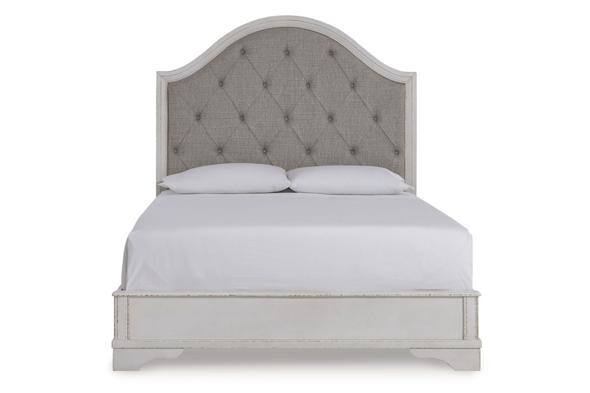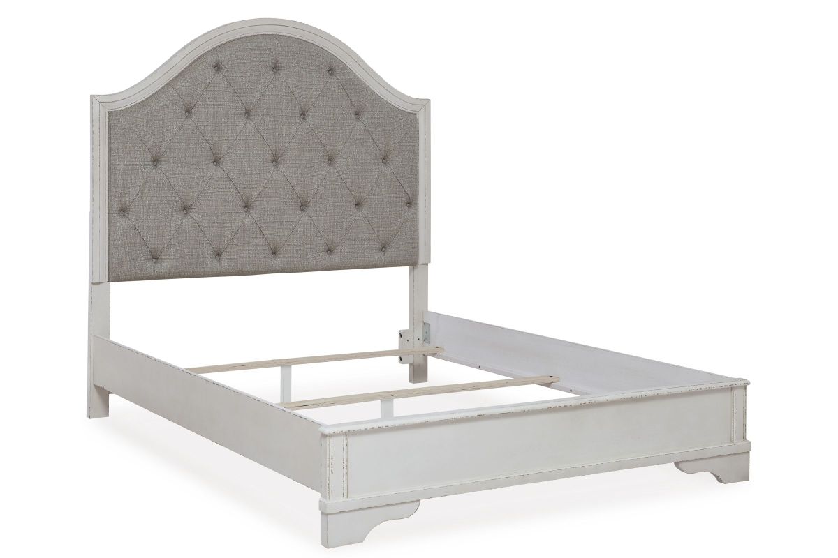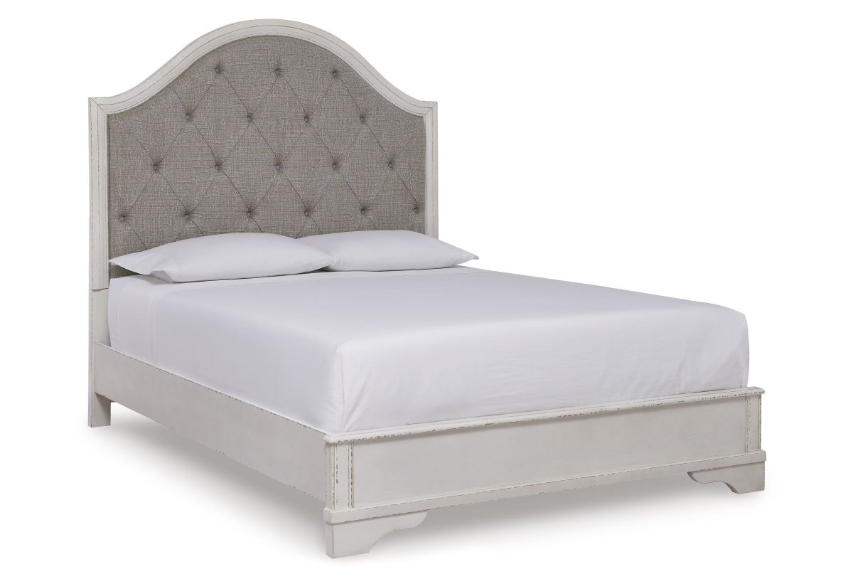 Traditional design. Casual appeal. You can have it all with this queen upholstered panel bed. A relaxed chipped white finish and an inset headboard cushion with classic button tufting give the distinctive piece an allure all its own. And the low-profile side rails and footboard are on trend for today's laid-back lifestyles. Assembly Required.