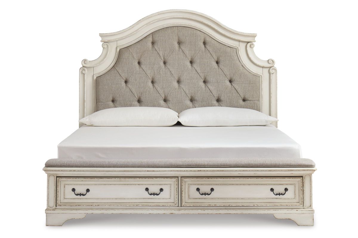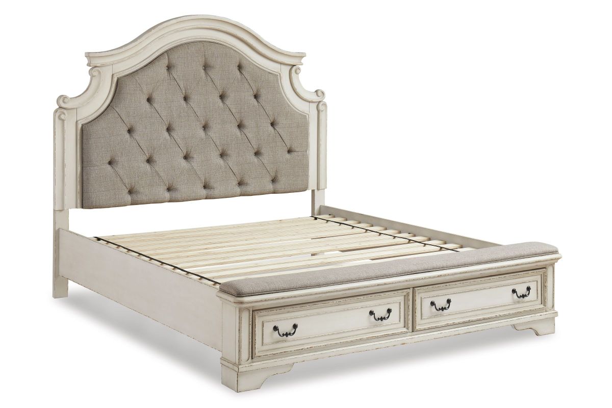 Redefining the art of traditional cottage styling, this California king upholstered bed is your dream bedroom retreat realized. The ornately shaped headboard with inset upholstered cushion brings cozy charm. Framed drawer fronts on the footboard add refinement, while drawer pulls in a dark bronze-tone finish lend a classic touch. A cushioned top rail elevates this stylish addition to a functional favorite. Assembly required.