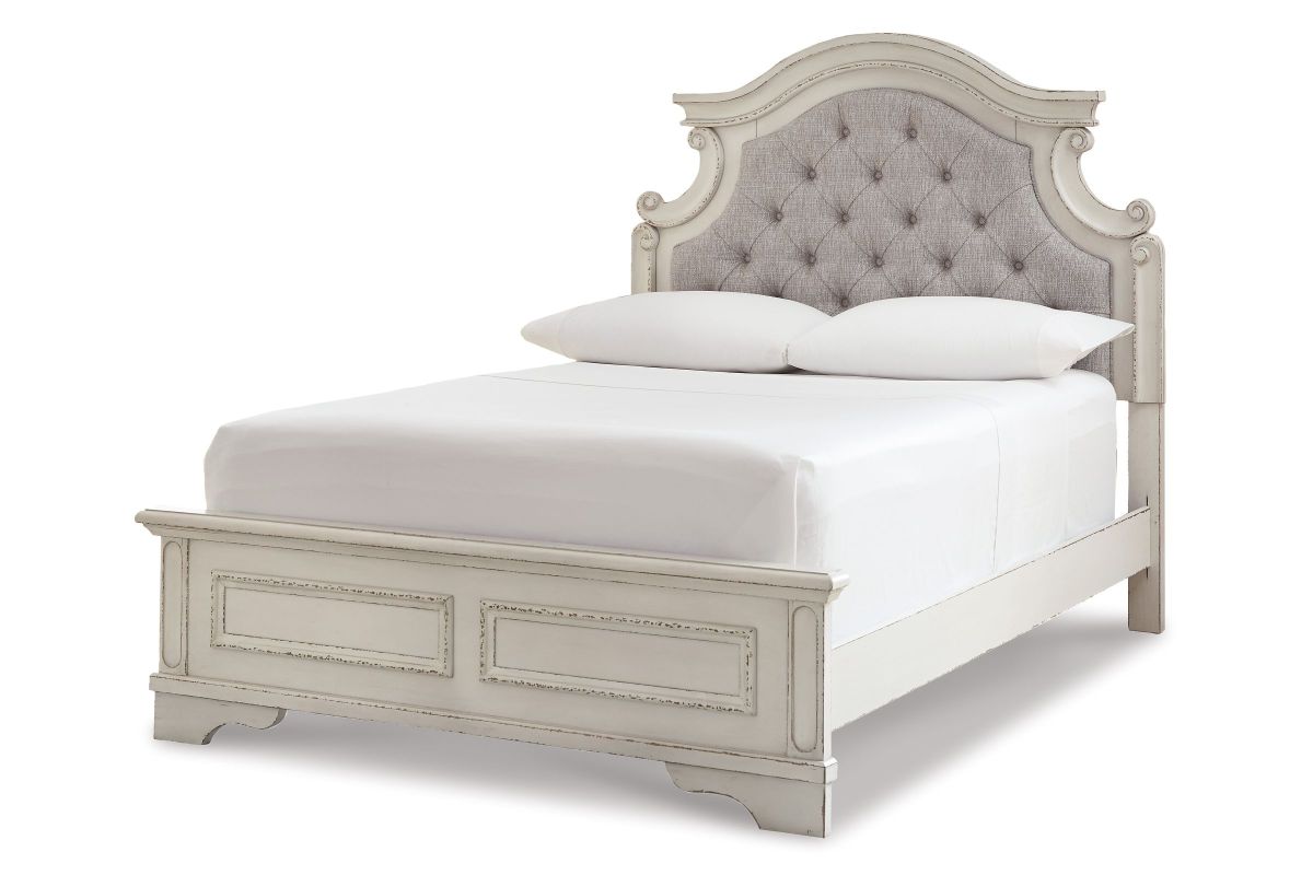 Elevating the art of traditional cottage styling, this full upholstered bed is your dream bedroom retreat realized. A curvaceous beauty, this brilliant upholstered bed wows with dramatic scalloped details and fanciful trim work. The distressed chipped white finish charms with its heirloom appeal. Deep tufting on the cushioned upholstered headboard adds such a cozy element sure to please. Mattress and foundation/box spring available, sold separately. Assembly required.