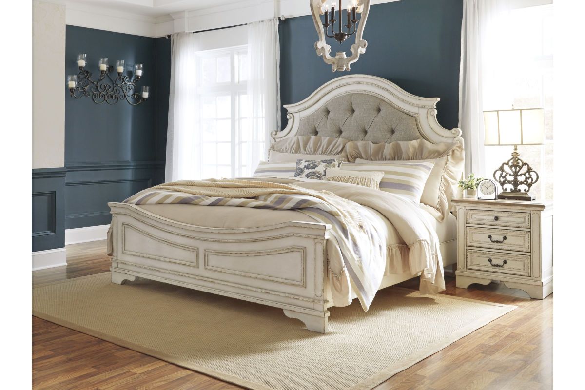 Elevating the art of traditional cottage styling, this king upholstered bed is your dream bedroom retreat realized. A curvaceous beauty, this brilliant upholstered bed wows with dramatic scalloped details and fanciful trim work. The distressed chipped white finish charms with its heirloom appeal. Deep tufting on the cushioned upholstered headboard adds such a cozy element sure to put you at ease. Mattress and foundation/box spring available, sold separately. Assembly required.