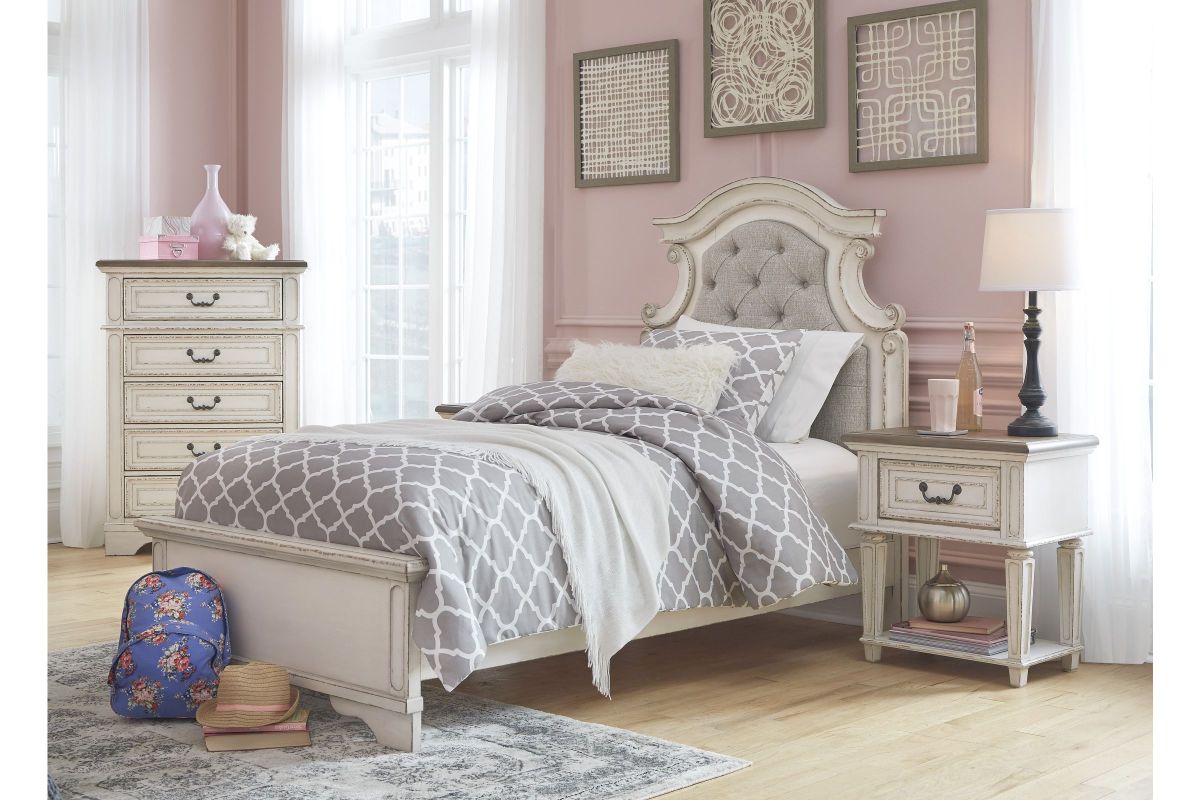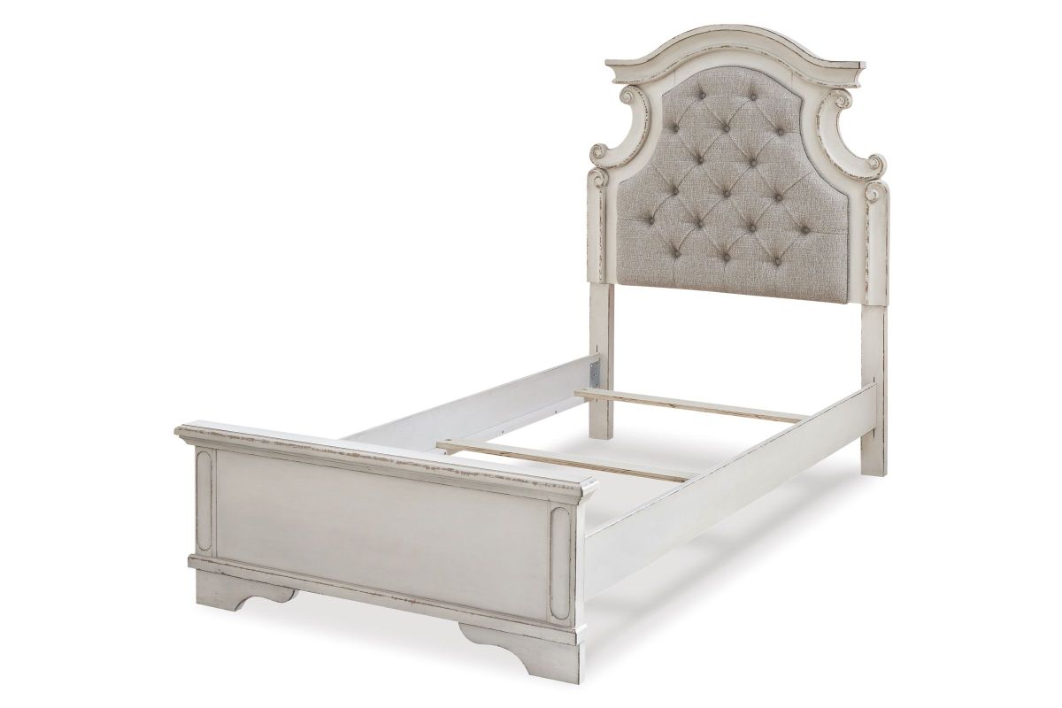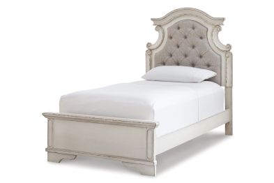 Elevating the art of traditional cottage styling, this twin upholstered bed is your dream bedroom retreat realized. A curvaceous beauty, this brilliant upholstered bed wows with dramatic scalloped details and fanciful trim work. The distressed chipped white finish charms with its heirloom appeal. Deep tufting on the cushioned upholstered headboard adds such a cozy element sure to please. Mattress and foundation/box spring available, sold separately.