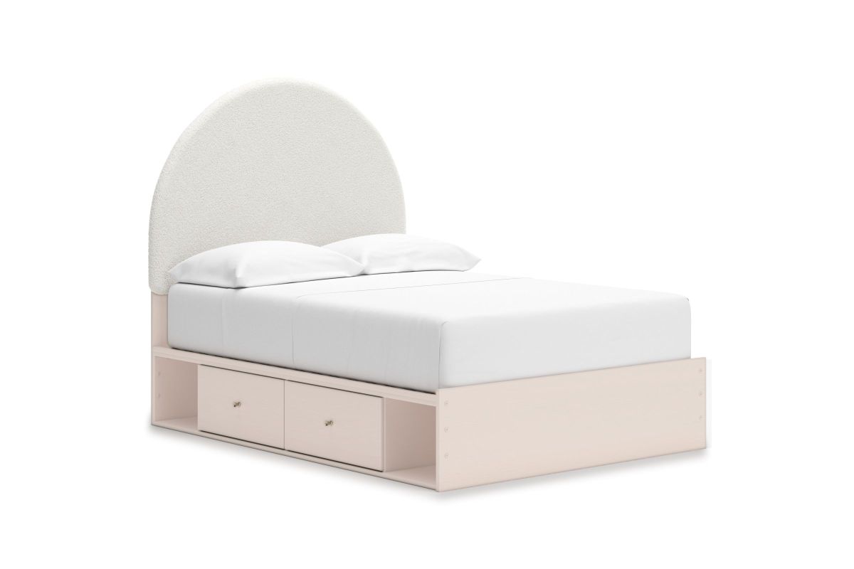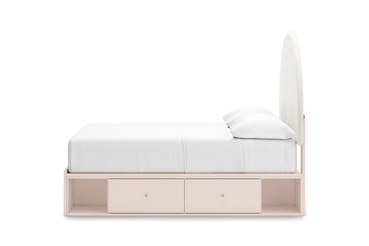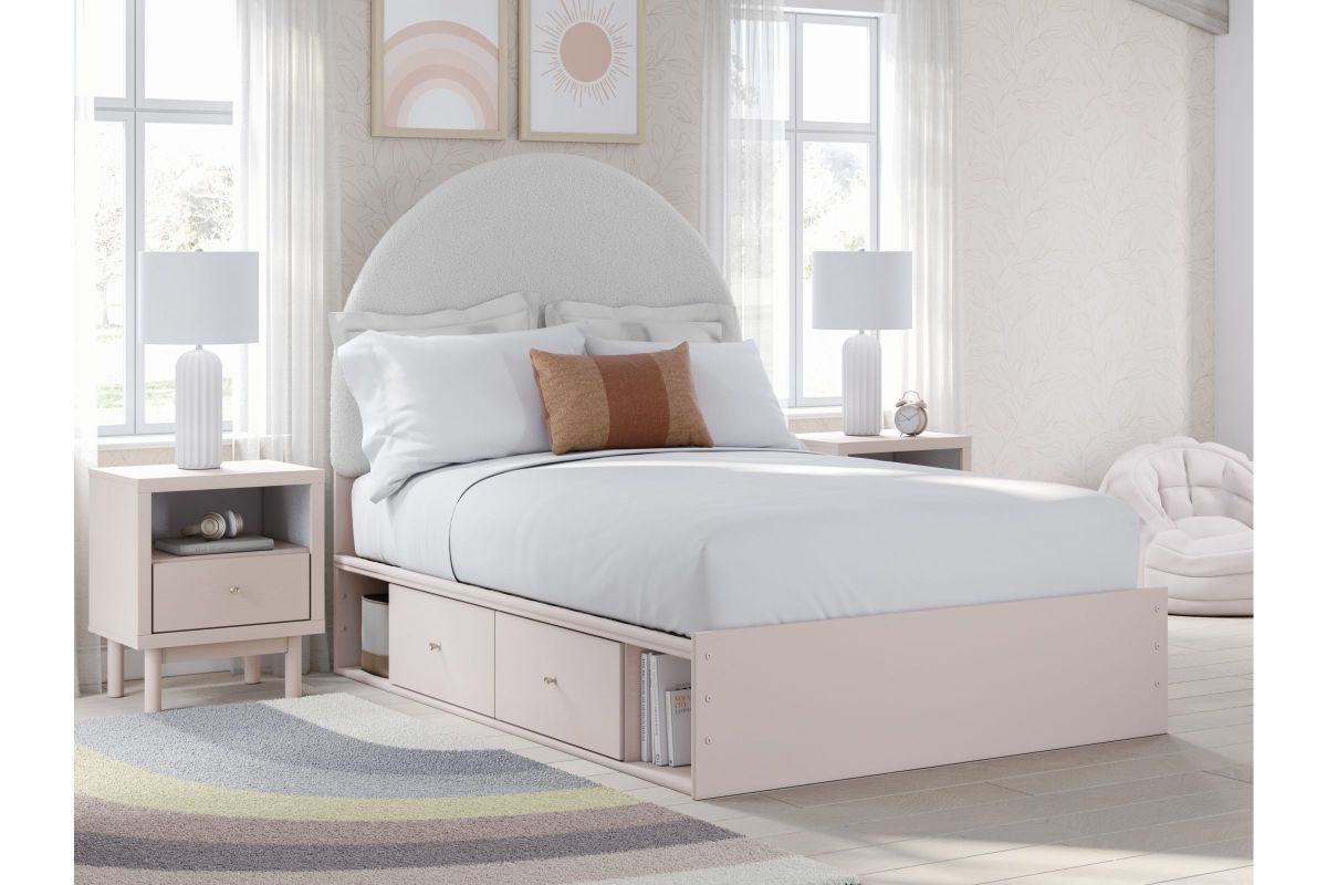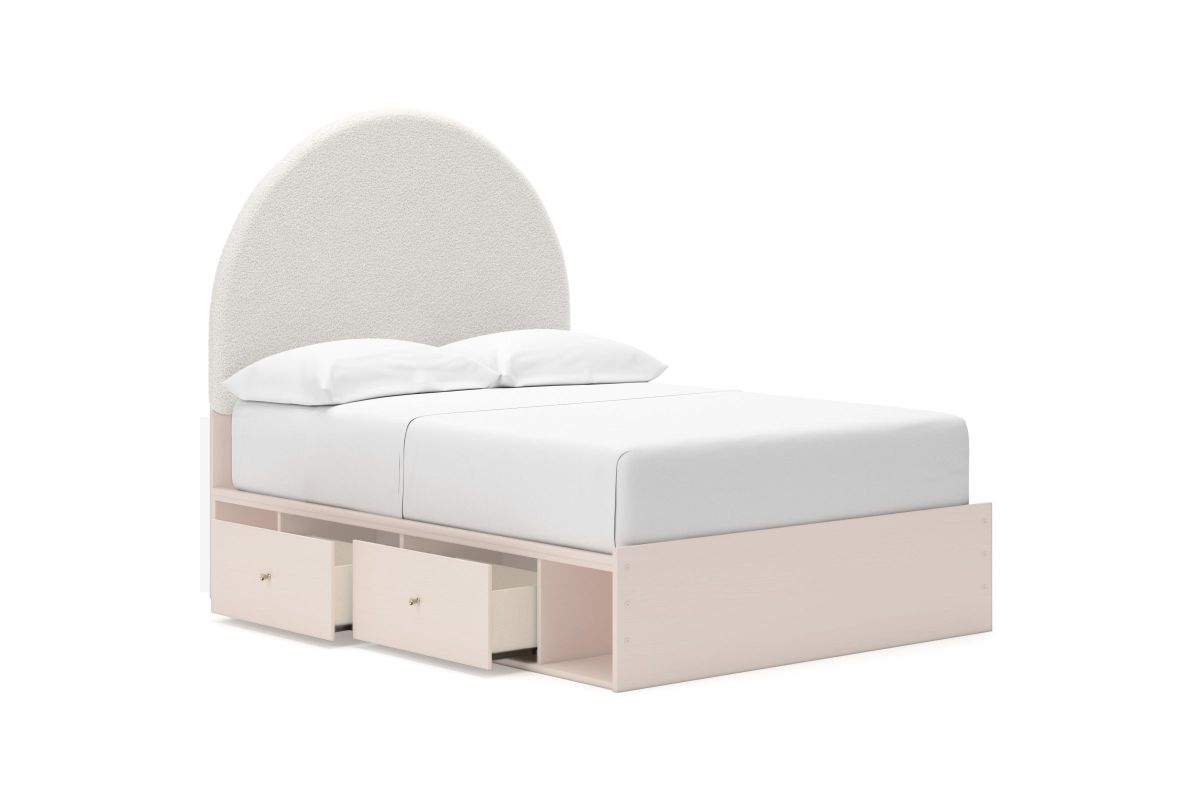 Pretty in pink. This full upholstered panel bed with storage keeps the spirit of your home’s modern aesthetic while suiting all your young one’s needs. Its cozy-cute upholstery and subtle blush finish bring a playful, charming vibe to bedtime. Made for her and styled for you, it’s a lovely addition to a beautifully chic child’s bedroom. Assembly required.