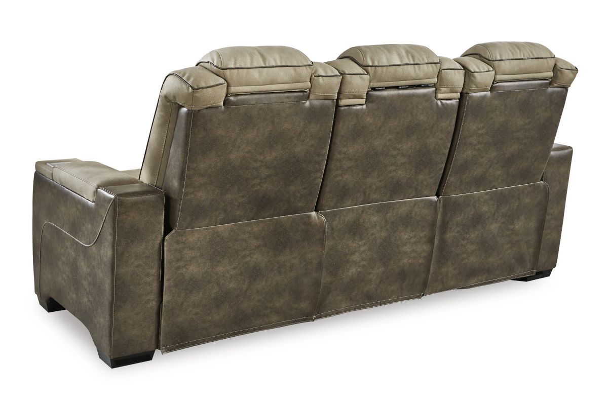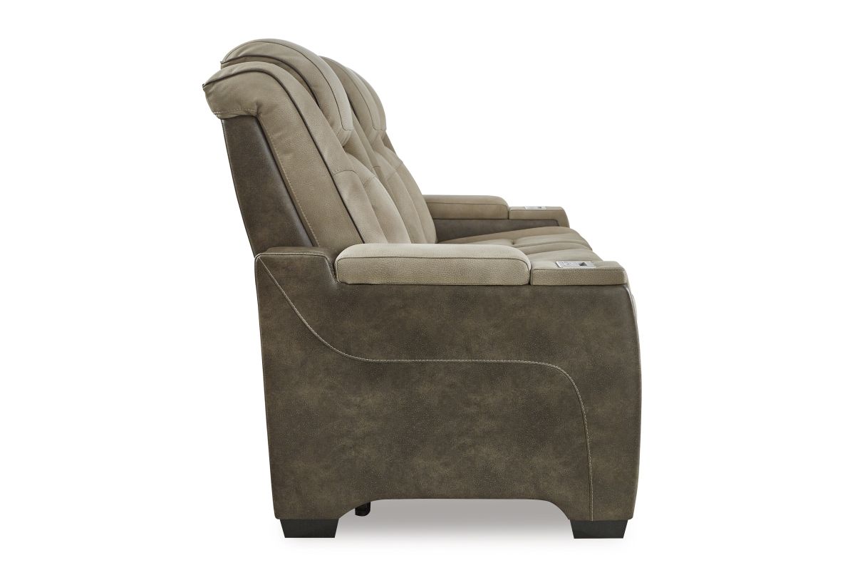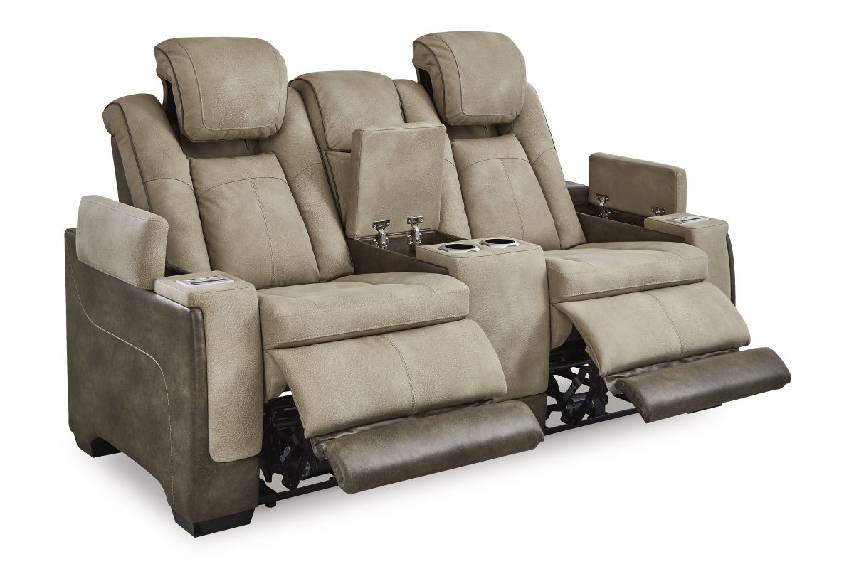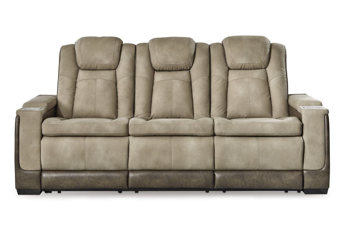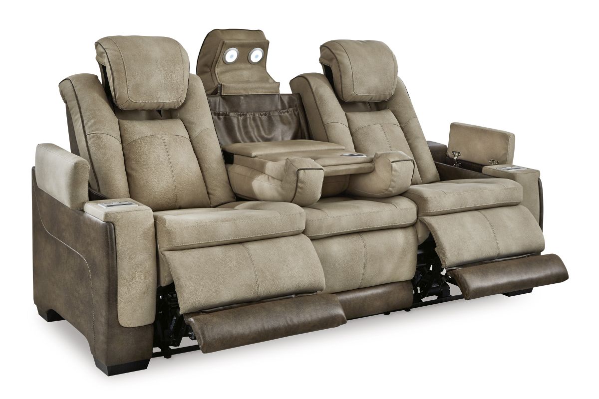 This sleek, ultra-modern power reclining sofa with drop-down table has it all. With designer style and head-to-toe comfort, it has the upscale look of leather at a scaled-down faux leather price. Its two-tone upholstery is more durable and water-repellent than regular leather, an added bonus for families. Features including wireless and USB charging, an adjustable headrest and an extended ottoman make this the next generation of power recliners. Assembly required.
