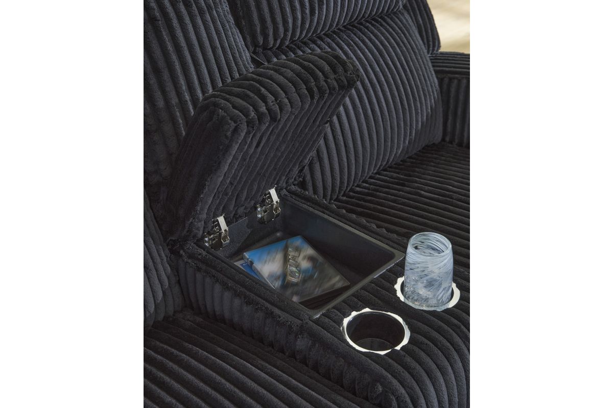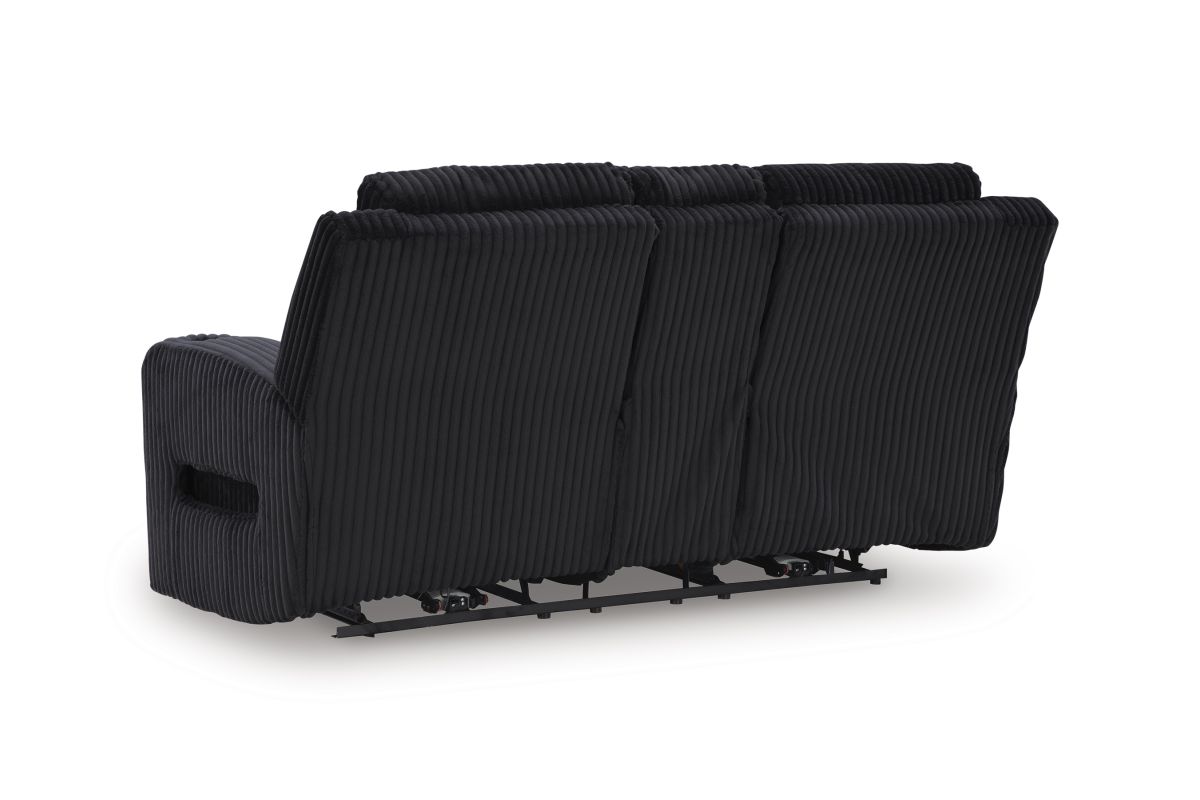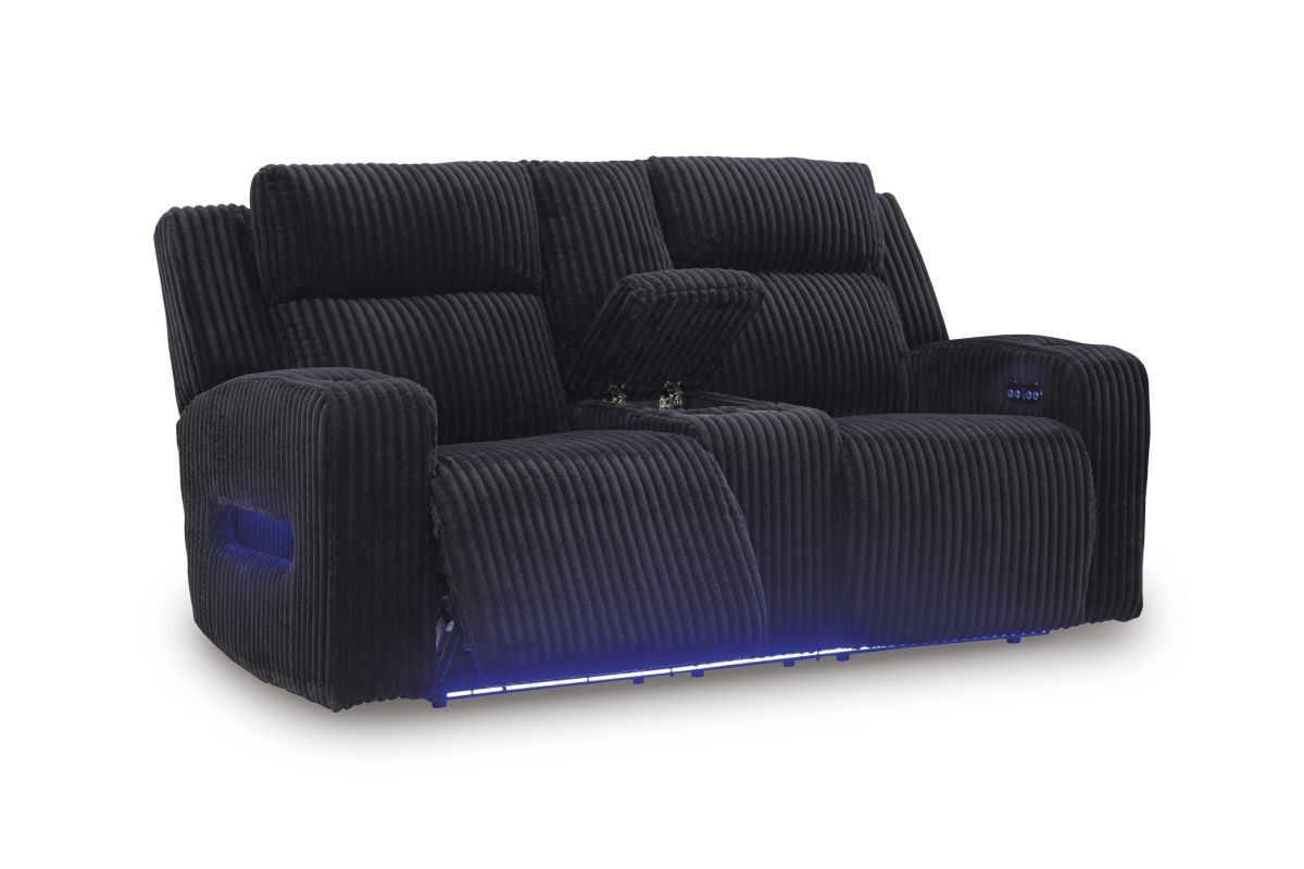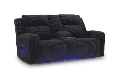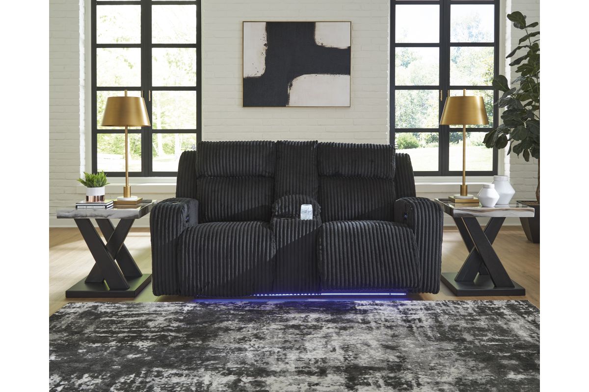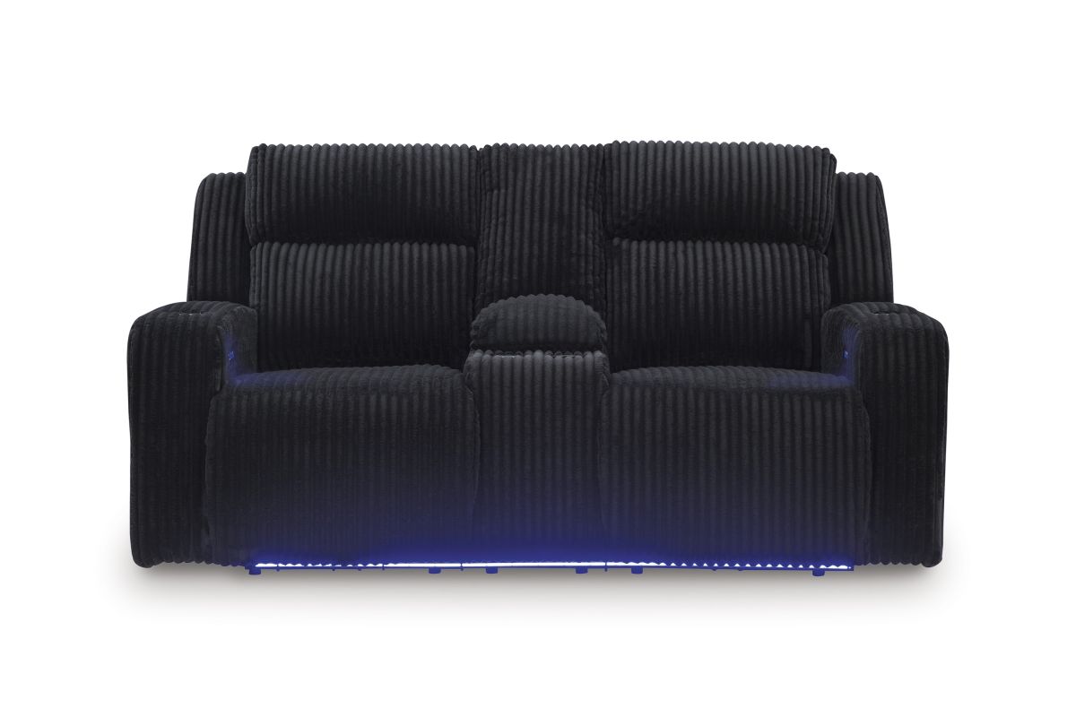 Trend-right style, meet irresistible modern function. Your living room gets a cozy-cool upgrade with the TwinBrooke power reclining loveseat. Curl up in its ultra-chic corded upholstery and recline with one-touch controls. Is it movie night or game time? With ambient LED lighting, this loveseat transforms from a serene relaxation spot to an entertainment hub. No assembly required.