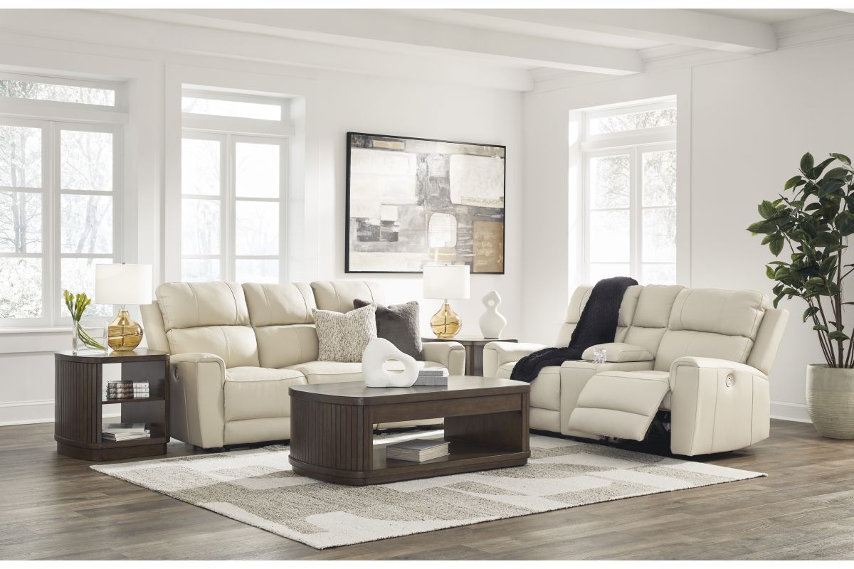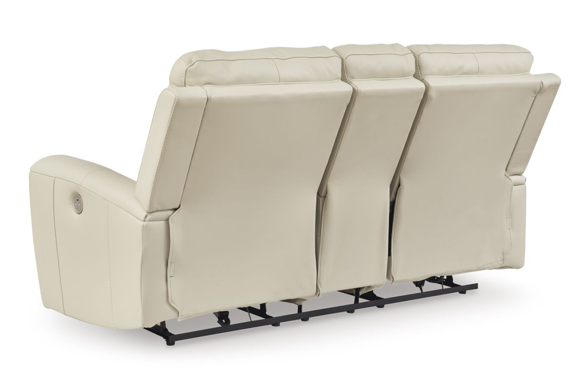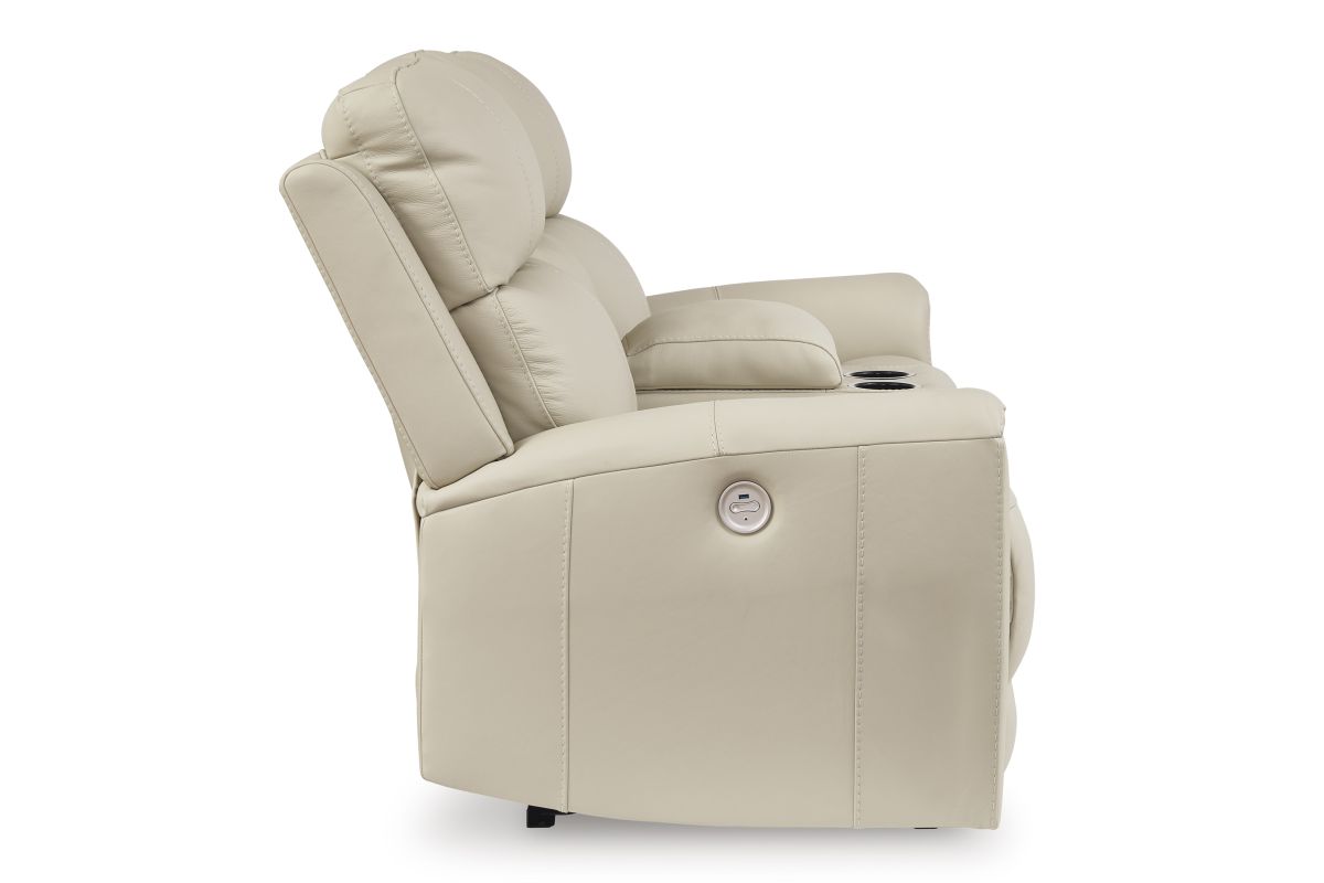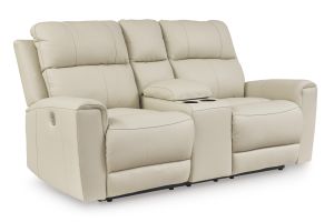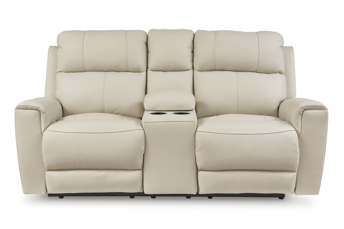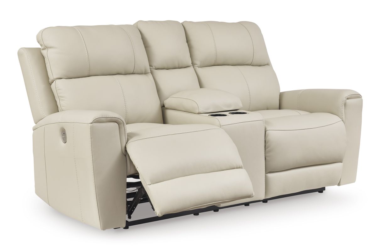 Focus on function. This practical power reclining loveseat with console balances contemporary character and irresistible comfort. Its affordable, expertly matched leather and faux leather upholstery keeps your style up to speed without breaking the bank. Reclining at the touch of a button, the loveseat plays well in relaxed, luxe seating areas made for quality time. No assembly required.