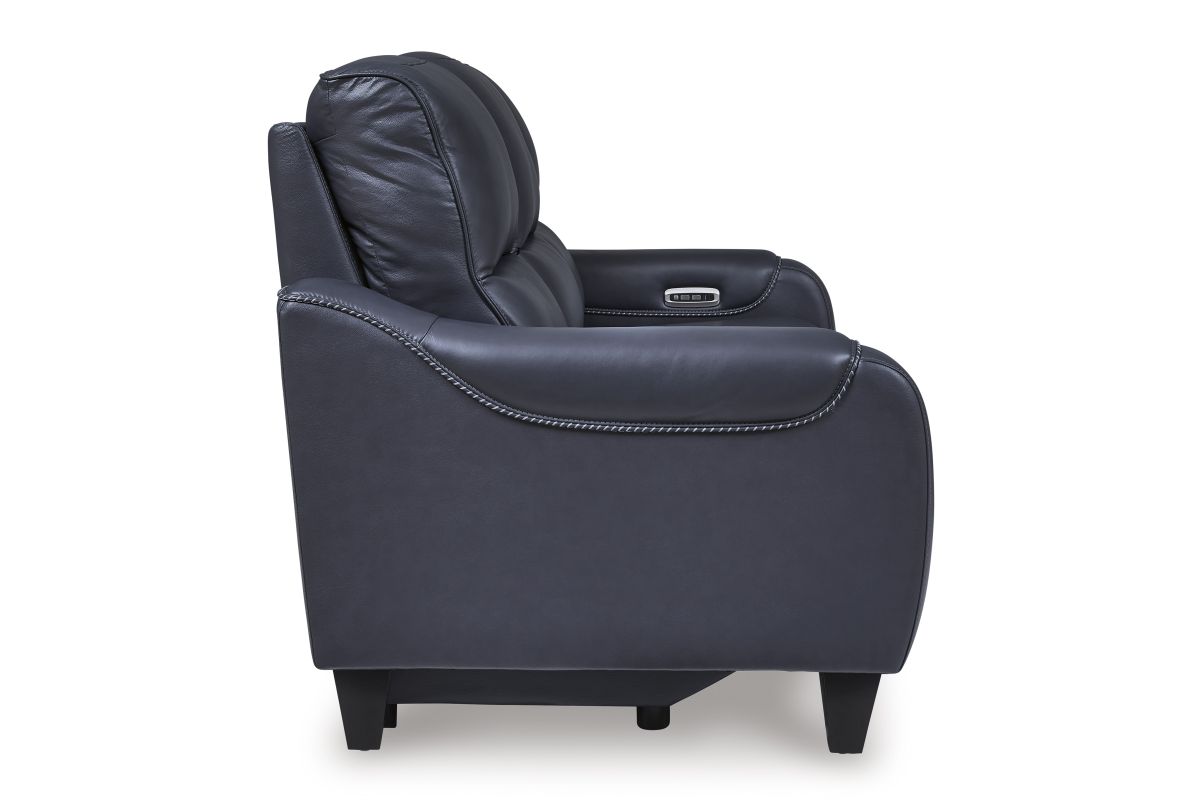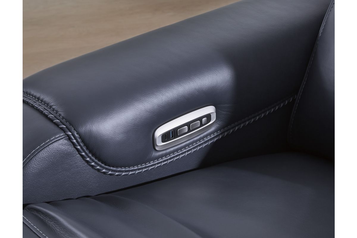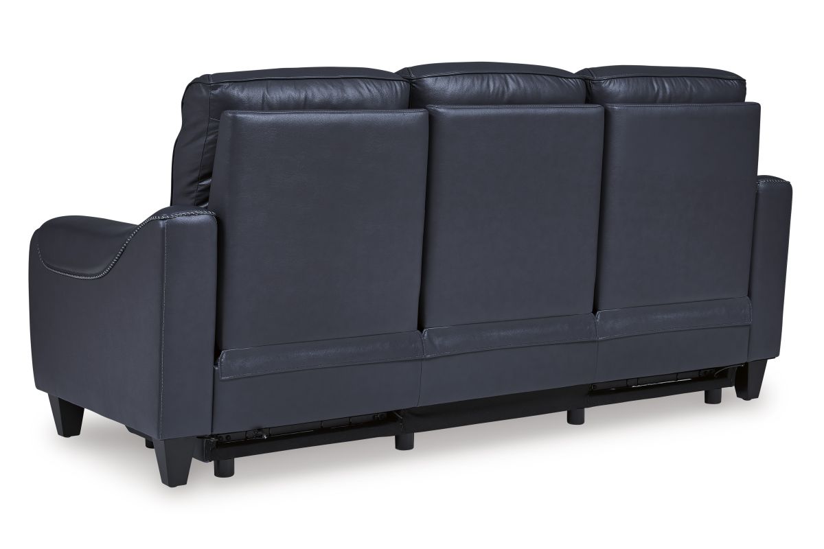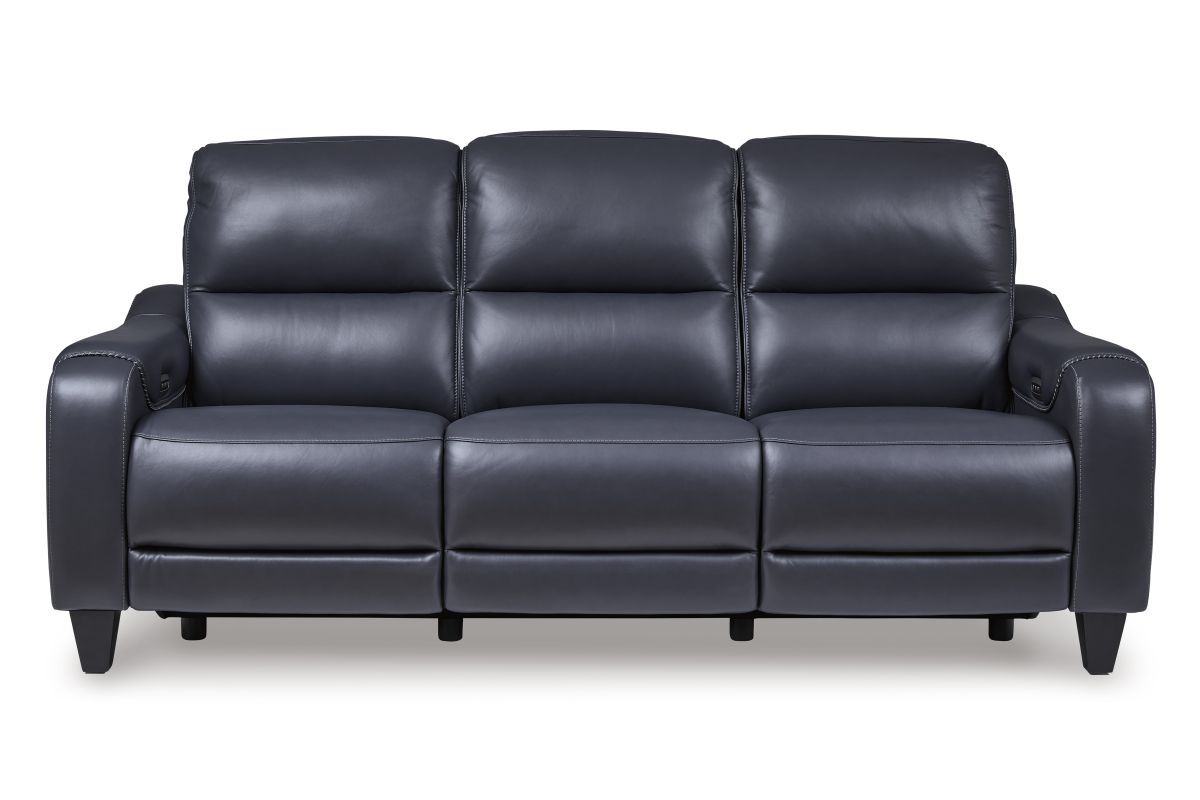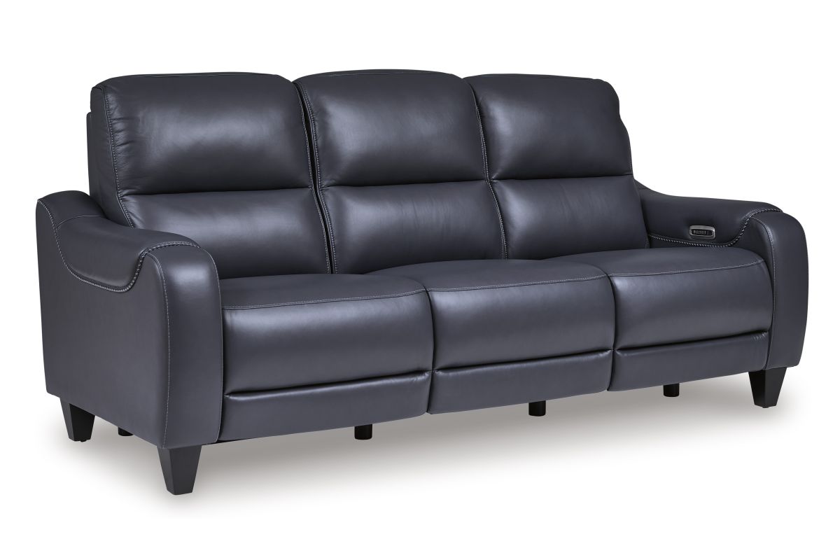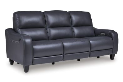 This power reclining sofa puts a sleek twist on laid-back living. It satisfies your desire for comfort without being bulky in design, thanks to subtly incorporated one-touch reclining and adjustable headrests. With chic exposed legs and stunning stitching details elevating the look from the bottom up, this sofa strikes the perfect balance between practical and posh. Assembly required.