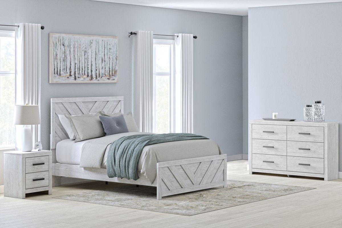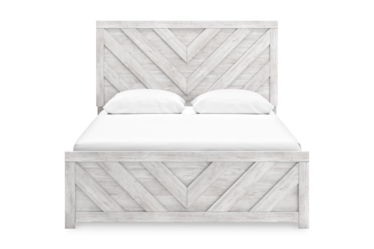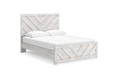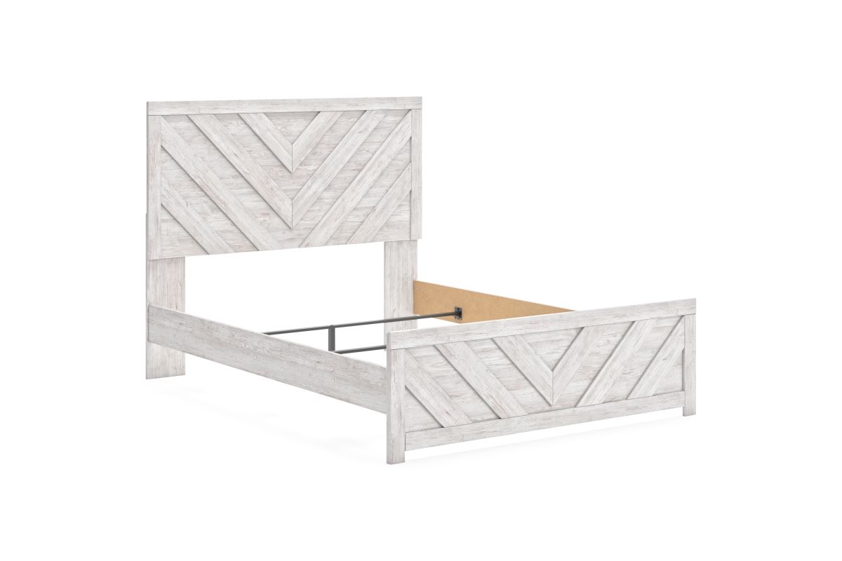Charmingly designed, this queen panel bed embraces the aesthetics of countryside living and repurposes them for modern settings. Its whitewash paint, replicating the wear and tear of time, appeals to your love of vintage character. And a chic chevron pattern on the headboard and footboard keeps your bedroom effortlessly on trend. Assembly required.