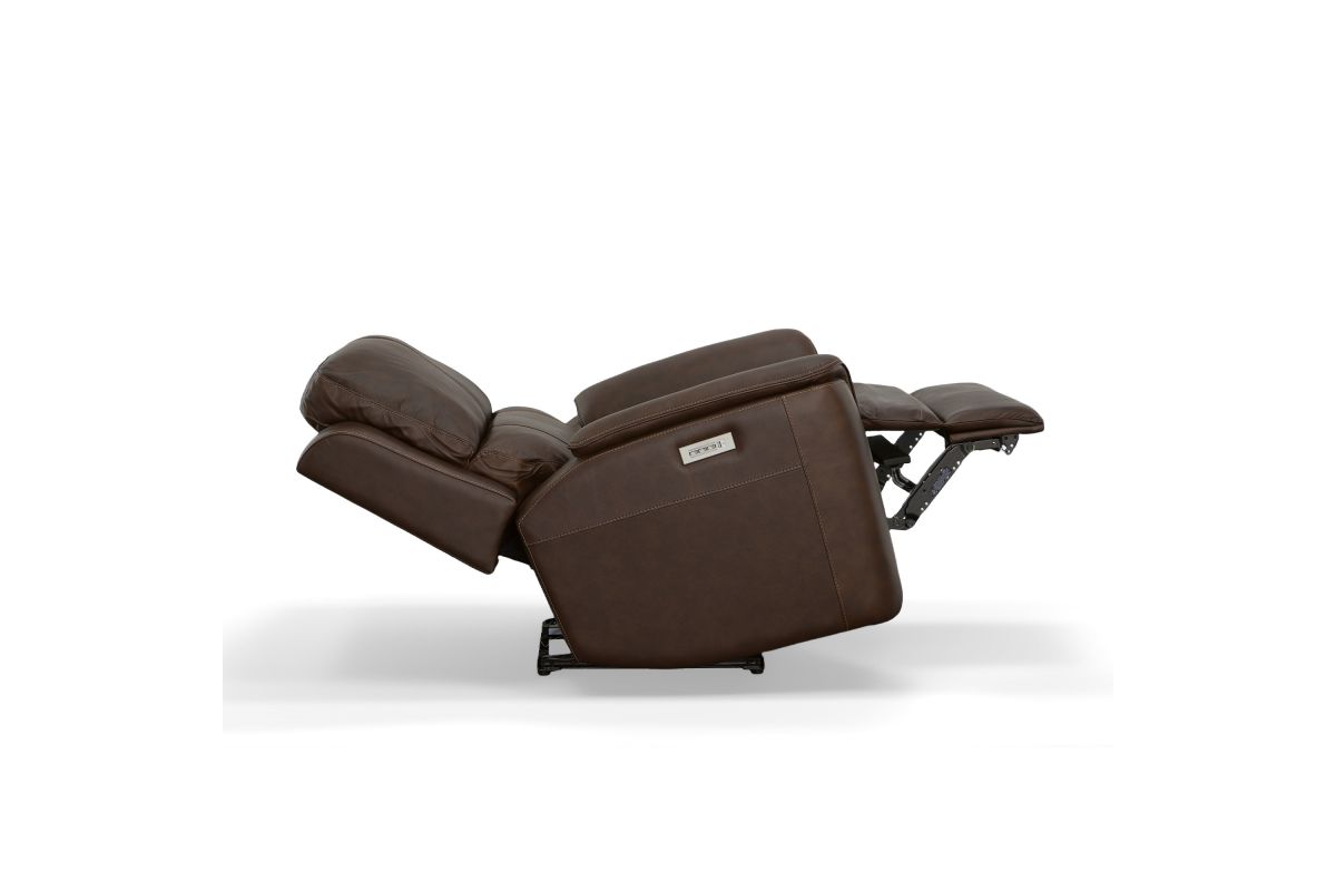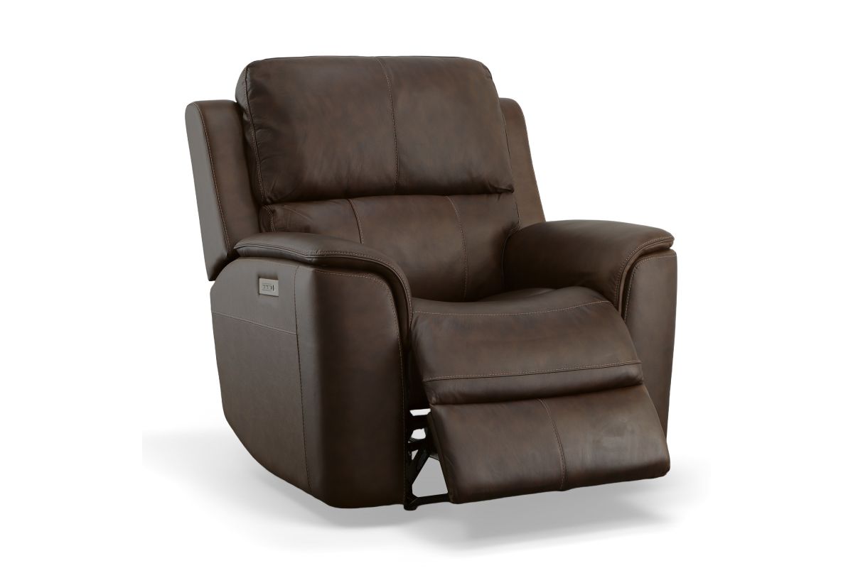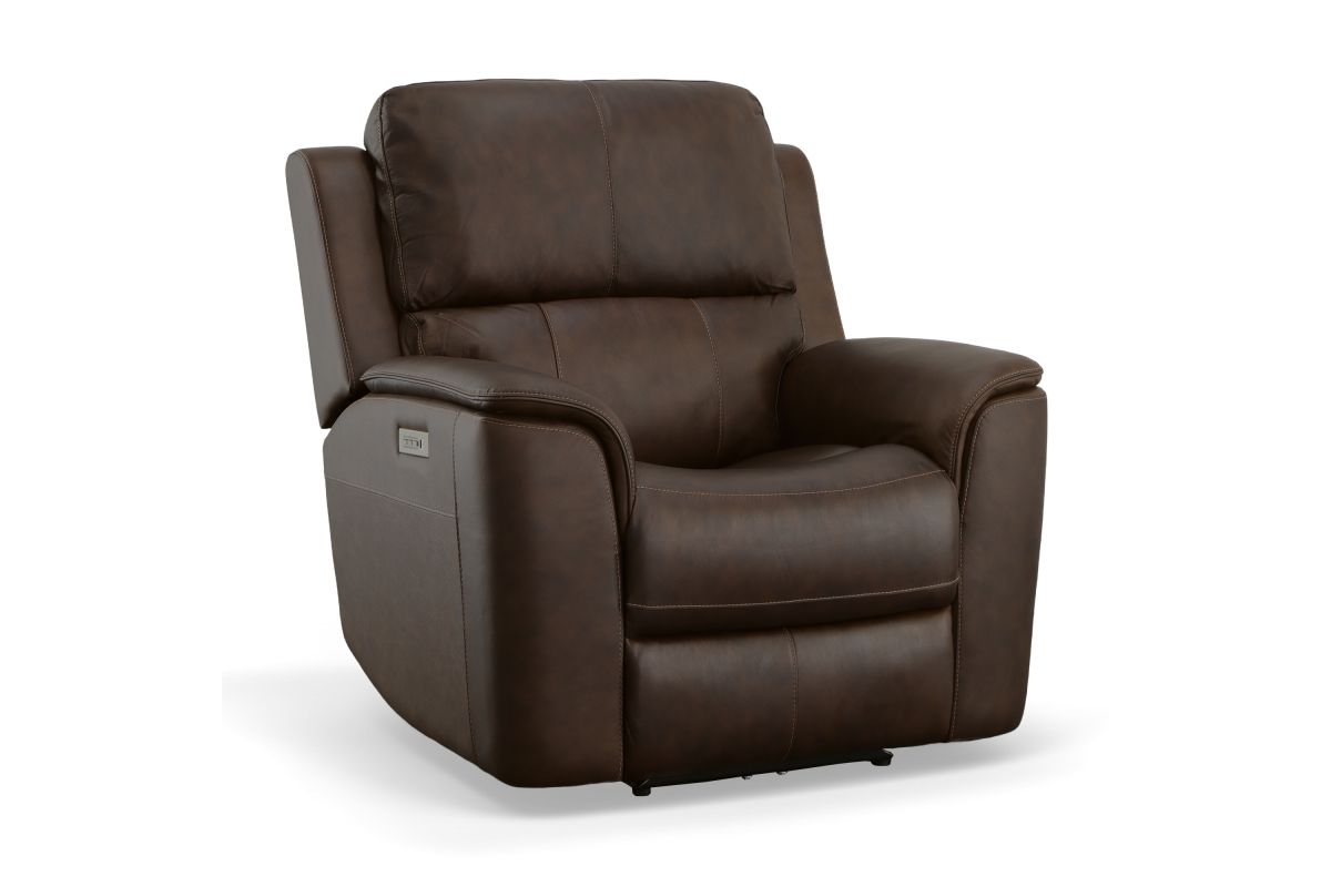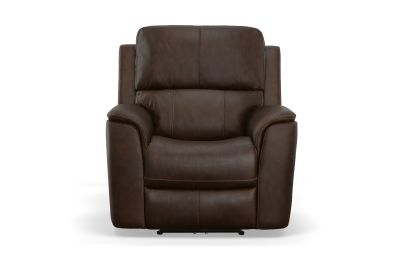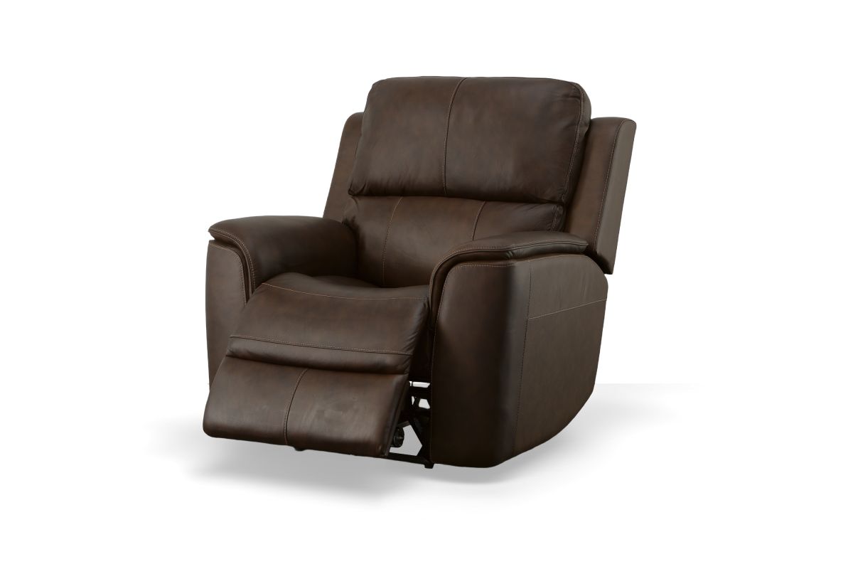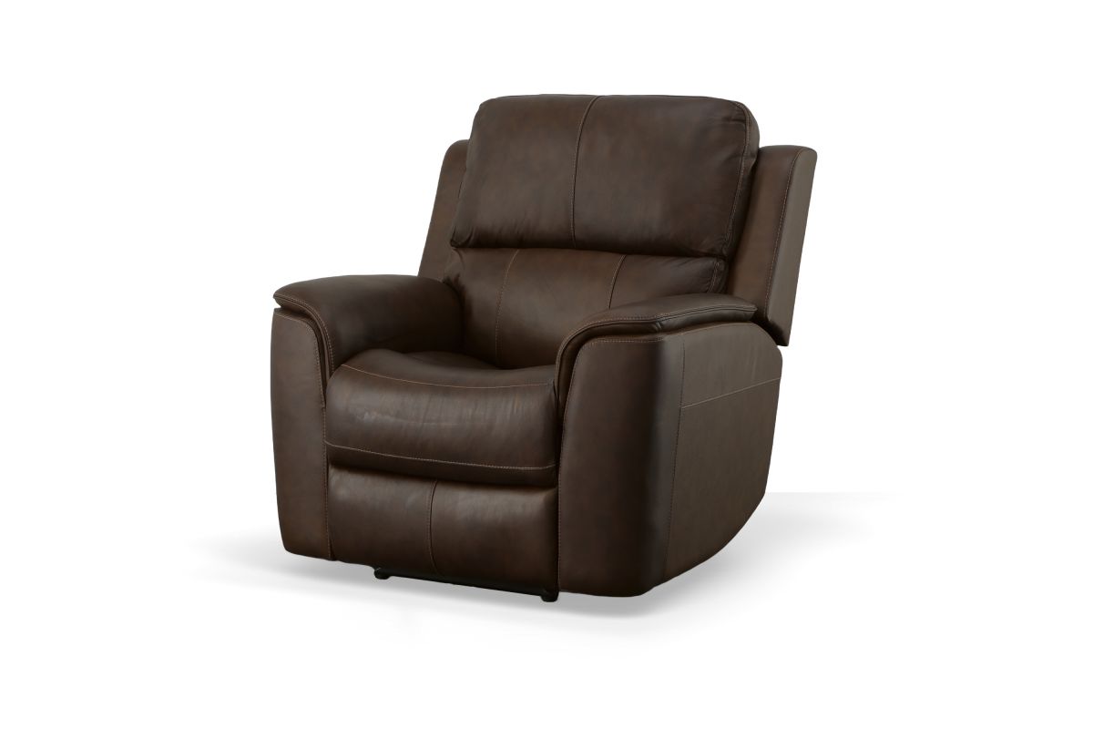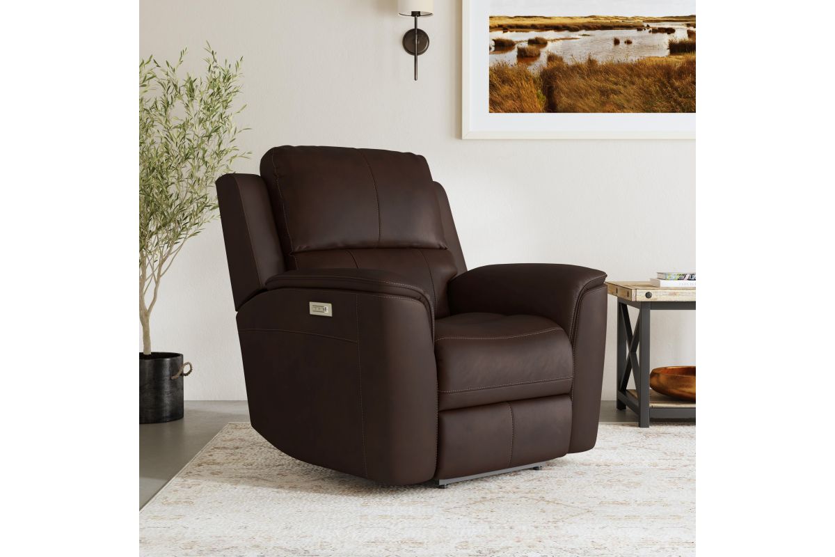 Treat yourself to a comfortable yet refined sitting experience with the Oliver leather power swivel recliner with power headrest and lumbar. This generously scaled frame is upholstered in a durable, sumptuous leather, and features a contoured seat and padded arms with a unique sculptural shape and welt trim. Power recline, headrest and lumbar control on the right side allows for customized comfort, and an included USB port provides convenient device charging. The Zero Gravity recline technology gives the feeling of weightlessness while Flexsteel's patented Blue Steel Spring™ provides lasting seat support.