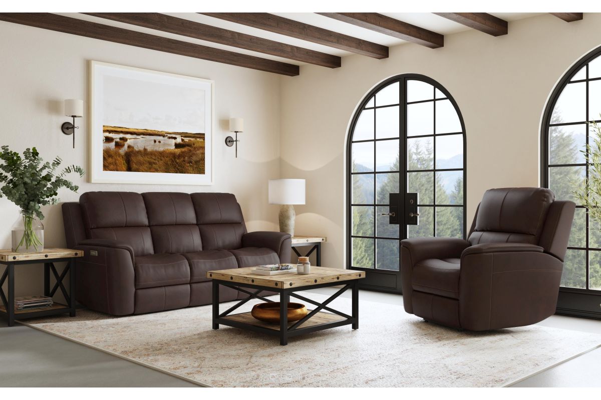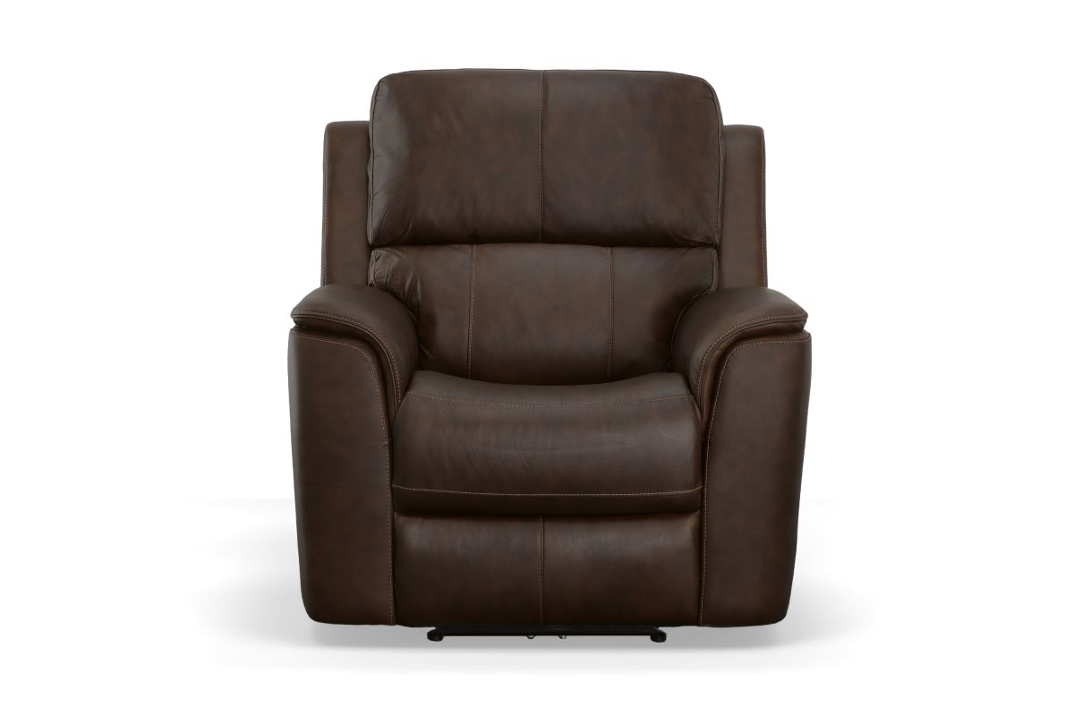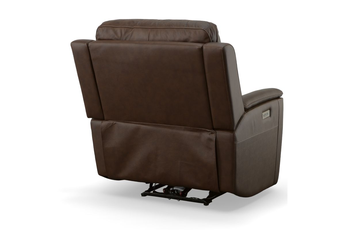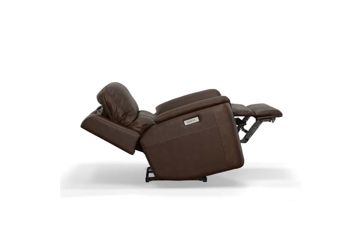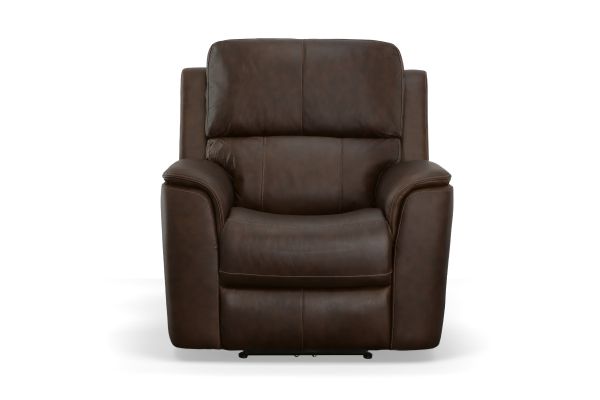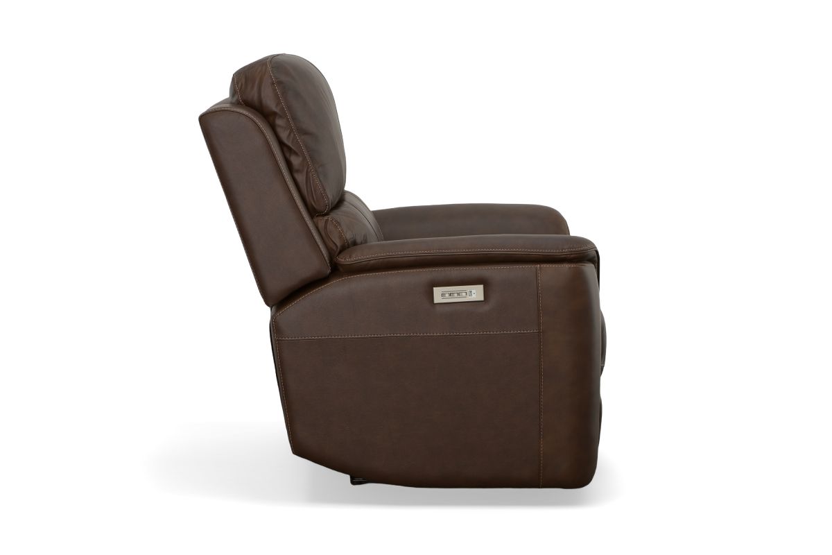 Treat yourself to a comfortable yet refined sitting experience with the Oliver leather power swivel recliner with power headrest and lumbar. This generously scaled frame is upholstered in a durable, sumptuous leather, and features a contoured seat and padded arms with a unique sculptural shape and welt trim. Power recline, headrest and lumbar control on the right side allows for customized comfort, and an included USB port provides convenient device charging. The Zero Gravity recline technology gives the feeling of weightlessness while Flexsteel's patented Blue Steel Spring™ provides lasting seat support.
