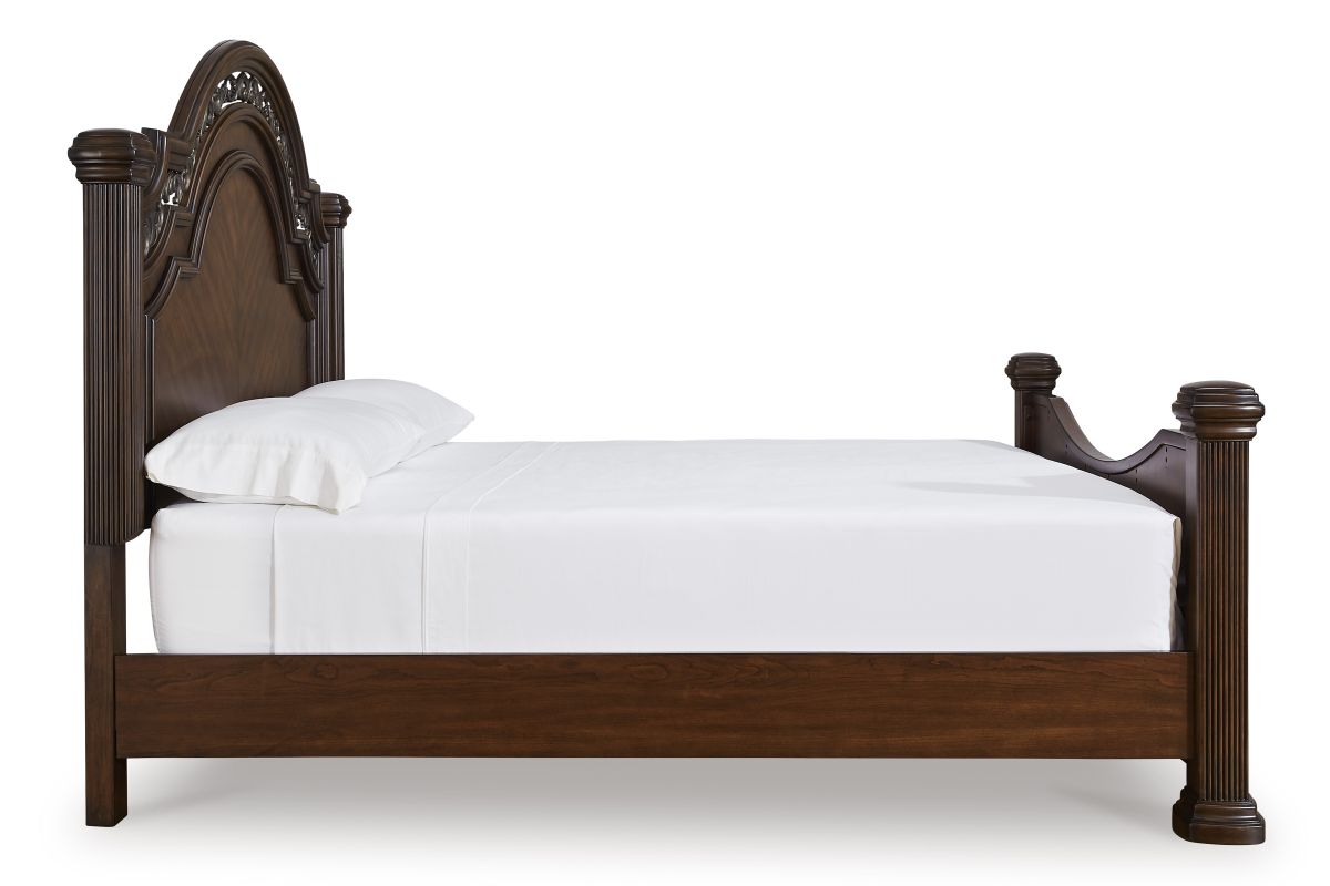Take inspiration from the traditional luxury of this California king poster bed. Classic with a rich cherry brown finish, its stately presence graces your room with an air of opulence. Your taste for exquisite details is satisfied with the headboard's ornate accent filigree. With an elegantly crafted footboard completing the look, your restful retreat has never been so refined. Assembly required.