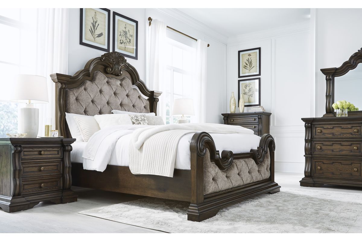 From its ornamental appliques to its large scale, this queen upholstered bed makes a bold statement. Showcasing sculptural ornate details and button tufting, this opulent bed wows with stunning style. The look is timeless. The feel? Right at home. Assembly required.