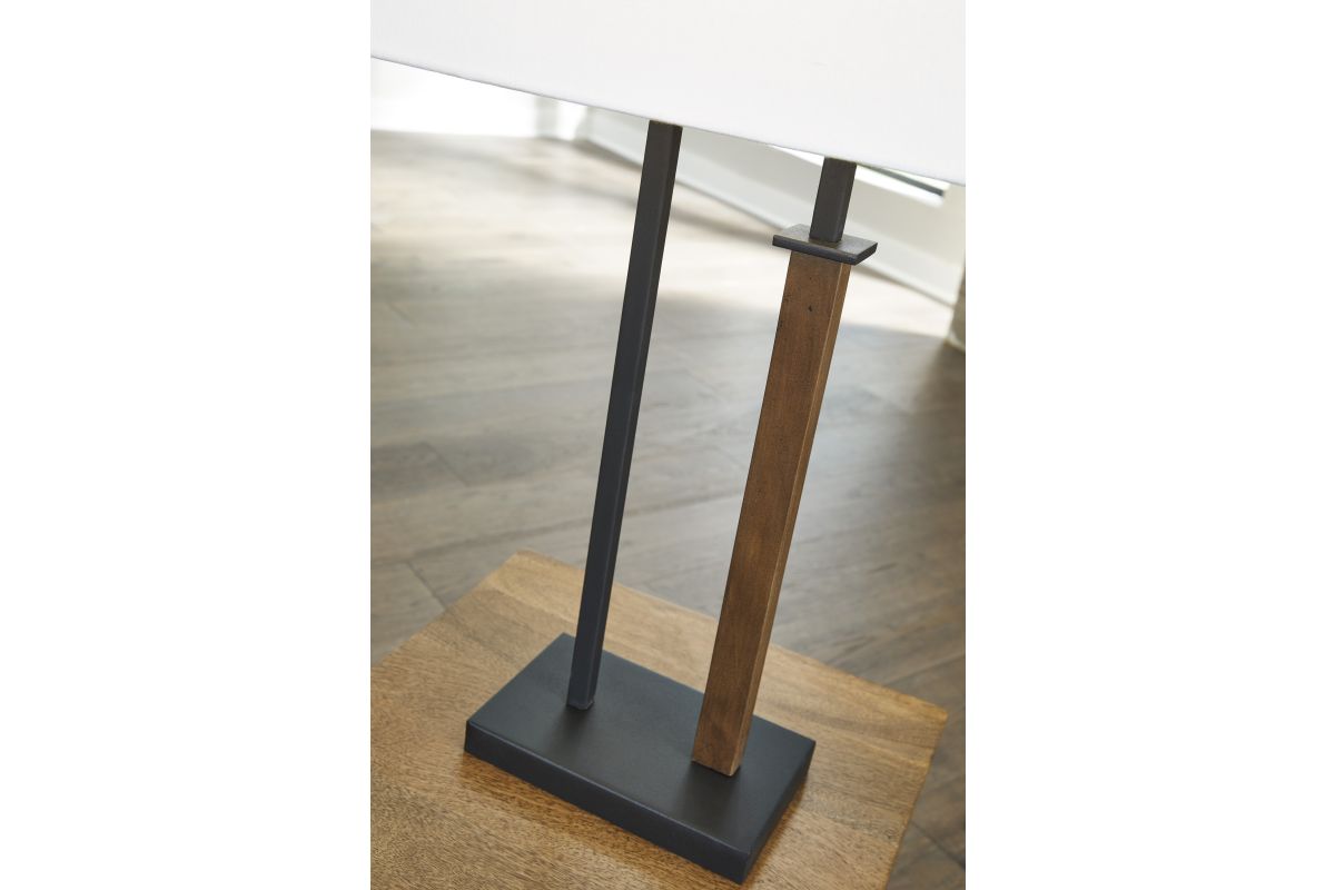 Illuminate your style with this table lamp. Its sleek geometric design, finished in black and brown, adds a designer touch to your abode. The contrasting white shade diffuses light for a soft artistic ambiance.