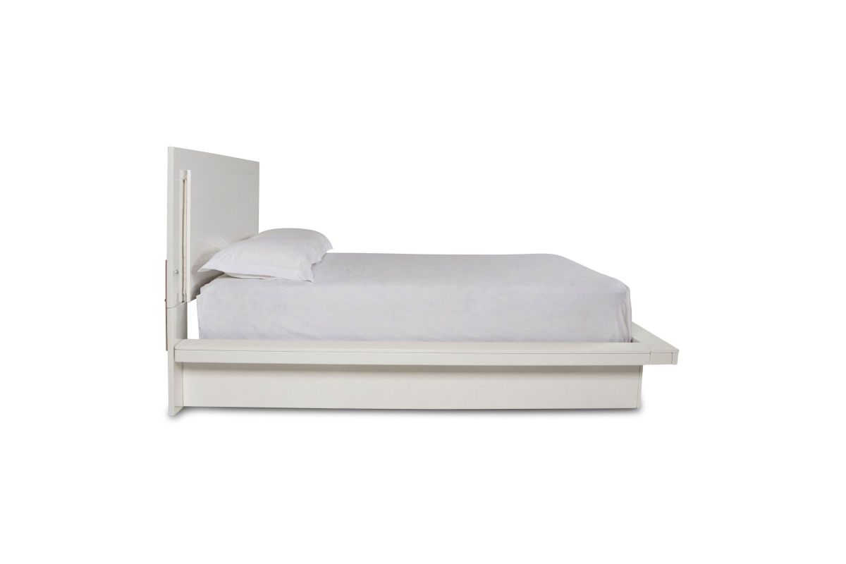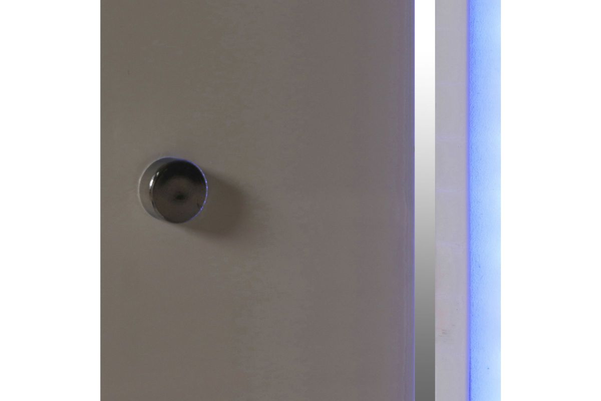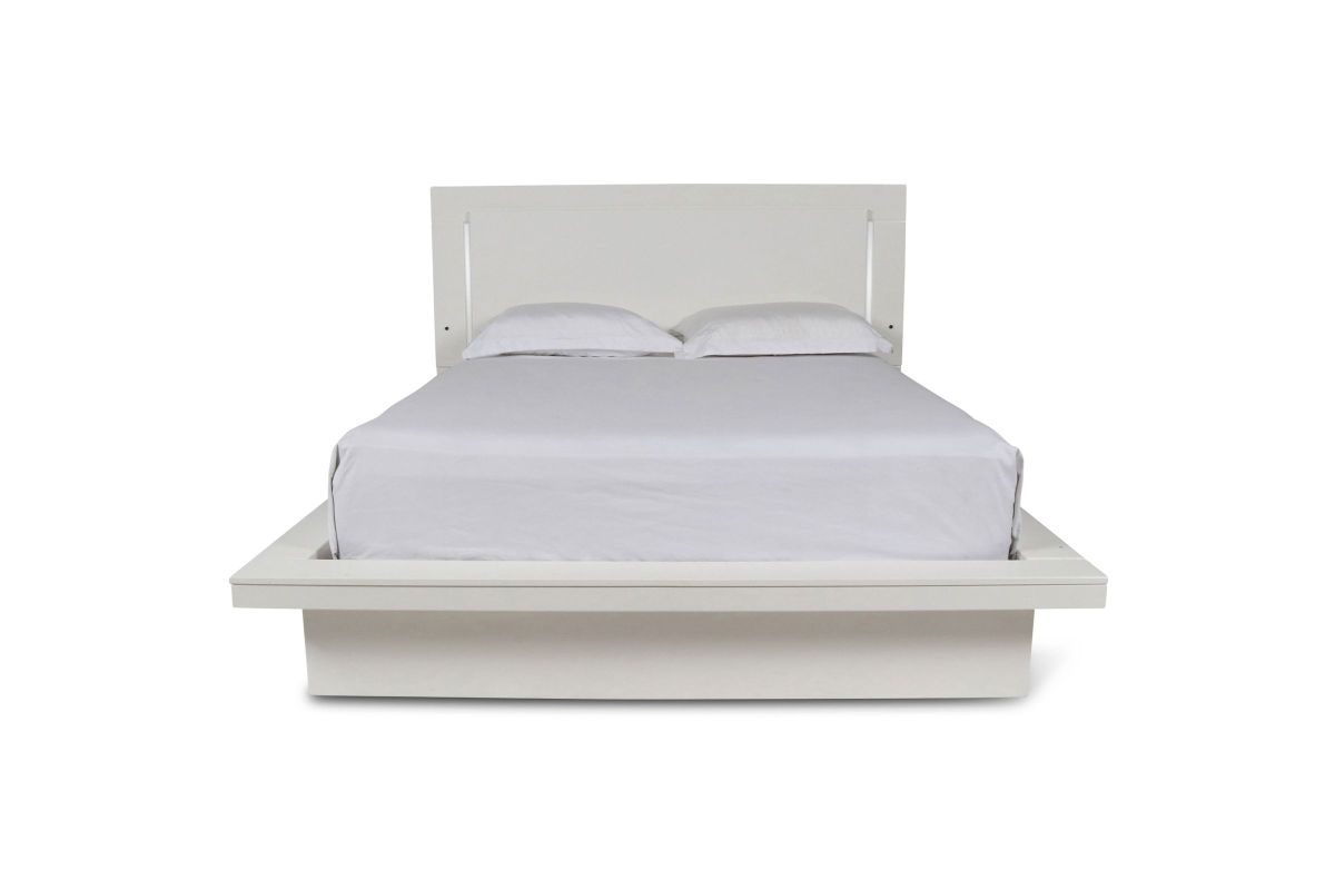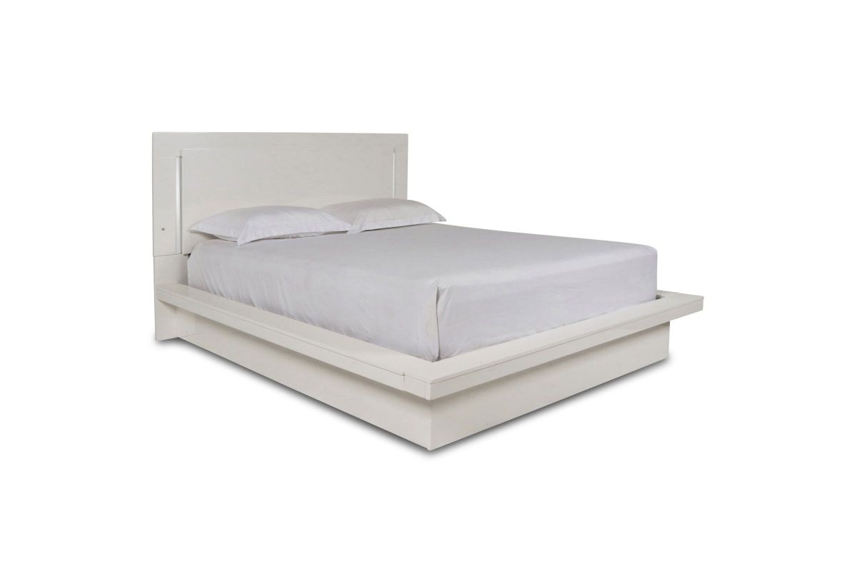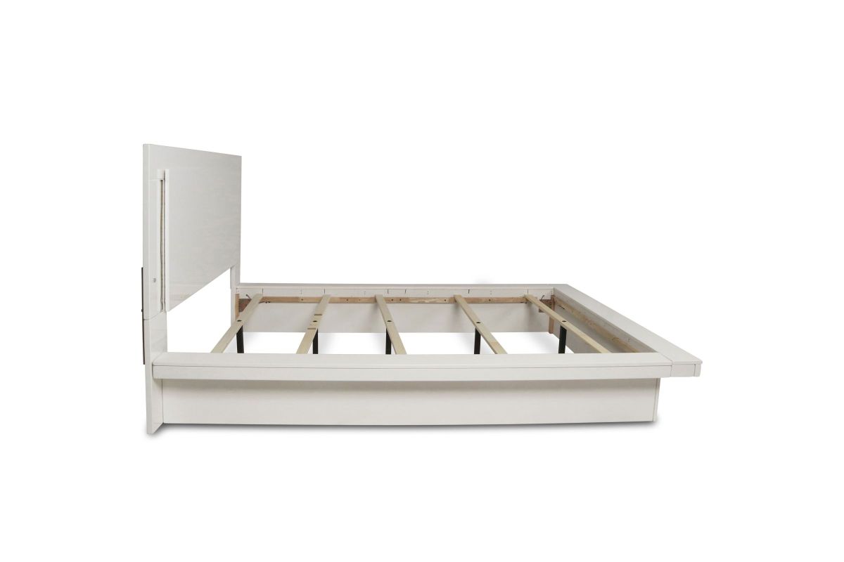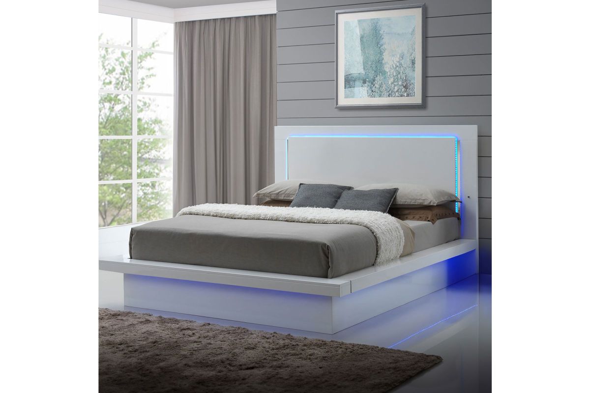 Upgrade your bedroom with the Sapphire Lighted Panel Bed in high gloss white. Constructed from high-quality manufactured wood, this bed features a flawlessly smooth, ripple-free surface and a sleek white laminate finish that adds a contemporary touch. The integrated blue LED lighting in the headboard and frame perimeter creates a captivating, glamorous effect that stands out in any modern interior. Combining elegant design with practical functionality, this bed is an ideal choice for those seeking to enhance their space with a touch of sophistication. Requires assembly.