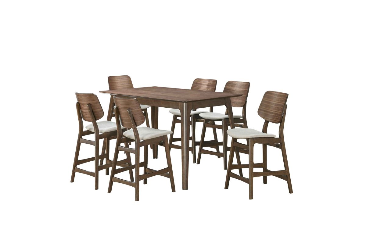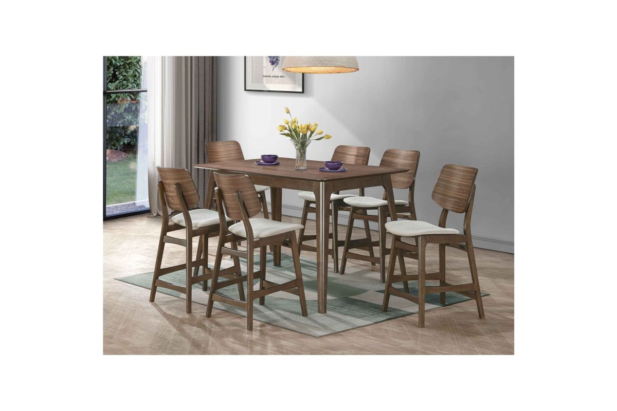 The Oscar Mid-Century Modern Wood 7 Piece Counter Height Dining Set offers a sophisticated blend of style and functionality for your dining area. This set includes a 60-inch counter height table and six counter chairs, all crafted from solid Rubberwood and Walnut veneers to ensure durability and longevity. The counter table comfortably seats up to six people, making it perfect for both family meals and entertaining guests. The chairs are designed with reinforcing base stretchers for added stability and feature foam seat cushions wrapped in natural beige polyester fabric for enhanced comfort. The design of the Oscar Dining Collection emphasizes clean lines, organic curves, and a focus on practical function, reflecting the timeless appeal of mid-century modern style. The sleek, minimalist aesthetic, highlighted by a Walnut brown finish and natural grain patterns, adds warmth and sophistication to your kitchen nook, small dining space, or main dining room. The clear top coat finish enhances the natural beauty of the wood, creating an elegant yet functional dining set. Experience the perfect balance of form and function with the Oscar Mid-Century Modern Dining Collection, a choice that seamlessly integrates into any contemporary living space. Assembly required. What's Included: (1) Counter Table, (6) Counter Chairs
