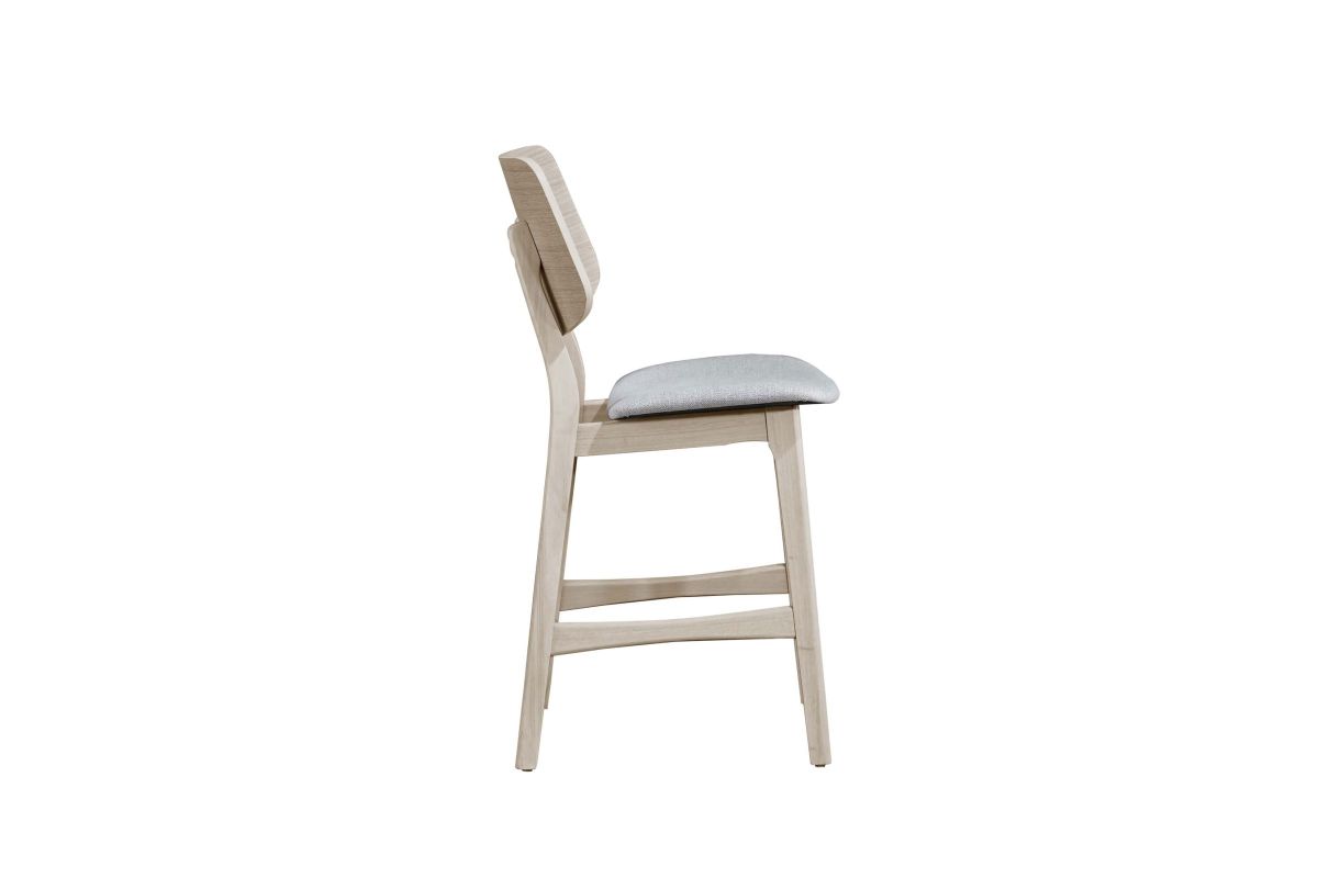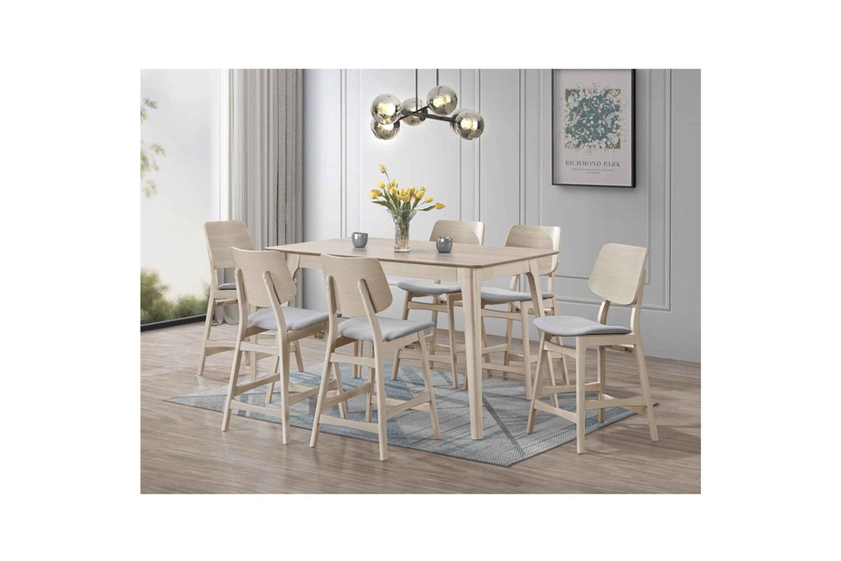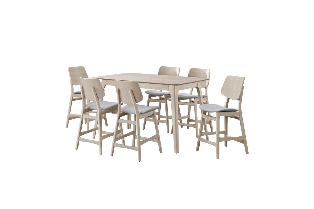 The Oscar Mid-Century Modern Wood 7 Piece Counter Height Dining Set offers a sophisticated blend of style and functionality for your dining area. This set includes a 60-inch counter height table and SIX counter chairs, all crafted from solid Rubberwood and Ash Veneers to ensure durability and longevity. The counter table comfortably seats up to six people, making it perfect for both family meals and entertaining guests. The chairs are designed with reinforcing base stretchers for added stability and feature foam seat cushions wrapped in natural beige polyester fabric for enhanced comfort. The design of the Oscar Dining Collection emphasizes clean lines, organic curves, and a focus on practical function, reflecting the timeless appeal of mid-century modern style. The sleek, minimalist aesthetic, highlighted by a White Ash finish and natural grain patterns, adds warmth and sophistication to your kitchen nook, small dining space, or main dining room. The subtle white wash top coat finish enhances the natural beauty of the wood, creating an elegant yet functional dining set. Experience the perfect balance of form and function with the Oscar Mid-Century Modern Dining Collection, a choice that seamlessly integrates into any contemporary living space. Assembly required. What's Included: (1) Counter Table, (6) Counter Chairs