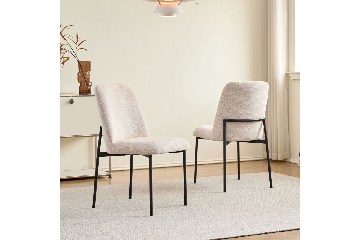 The Erik Side Chair set offers modern comfort and style, making it an ideal choice for any contemporary space. Each chair is fully upholstered, and has elegantly curved seats and backs, delivering both a sleek appearance and exceptional comfort. The natural beige woven fabric, made from 100% polyester, provides a soft and cozy feel while being easy to maintain, blending everyday practicality with a timeless look. The sturdy black iron tube legs ensure lasting stability and durability, resisting bending or breaking, while their sleek design contrasts beautifully with the fabric for a refined, modern aesthetic. With its combination of comfort, style, and durability, the Erik Side Chair is a smart addition to any home or dining setting. Assembly required.