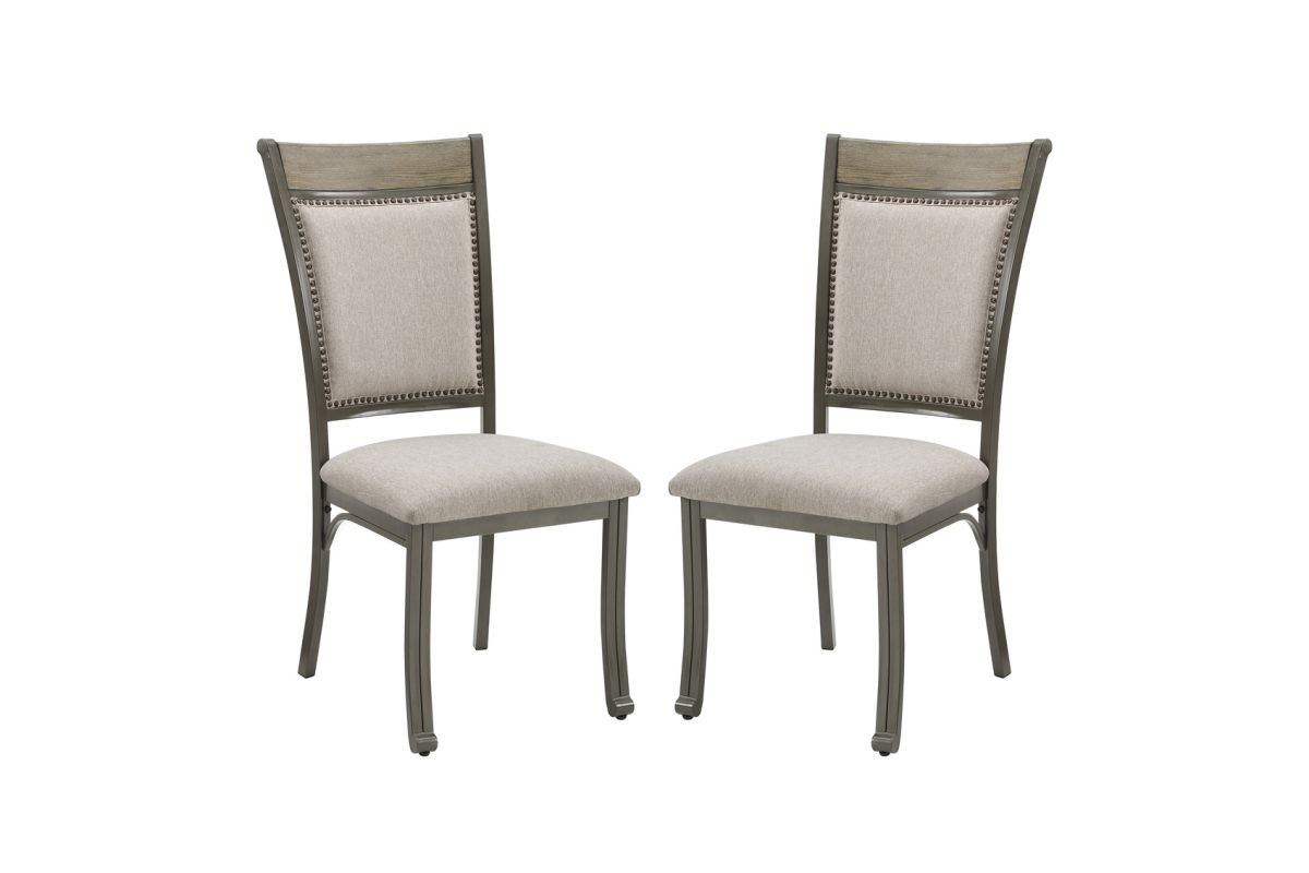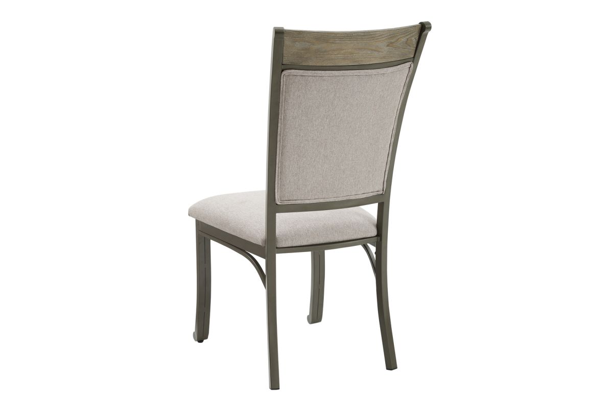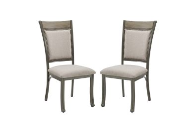Mixing metal, wood and performance fabric in an updated industrial style provides a unique addition to your home. Featuring a comfortable curved back with a padded support section that is upholstered with a grey fabric that resist stains and is easy to clean. Lined with nail heads and topped with a wood section that is in a grey finish. Padded seat in the same material make this a long lasting addition to any dining or extra seating situation. Created with a matching dining table. Sold as a pack of two. Assembly required.