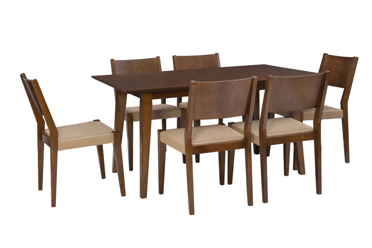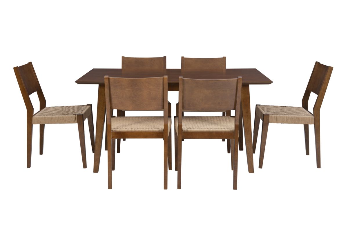 Transform your dining space into a haven of midcentury modern elegance with this exquisite dining set. Sleek silhouettes infused with an inviting rustic atmosphere from handwoven rope seats bring character to every meal. The set comprises a generously sized 36" x 60" table with a beautiful rubberwood veneer, comfortably seating six. Choose between four or six chairs, each featuring a luxuriously comfortable basketweave pattern. Finished in a rich brown stain, all pieces are meticulously crafted from solid wood, ensuring enduring durability and a lasting aesthetic appeal. Assembly required.