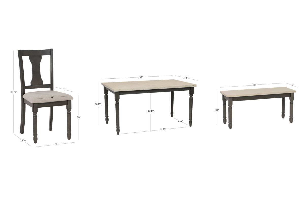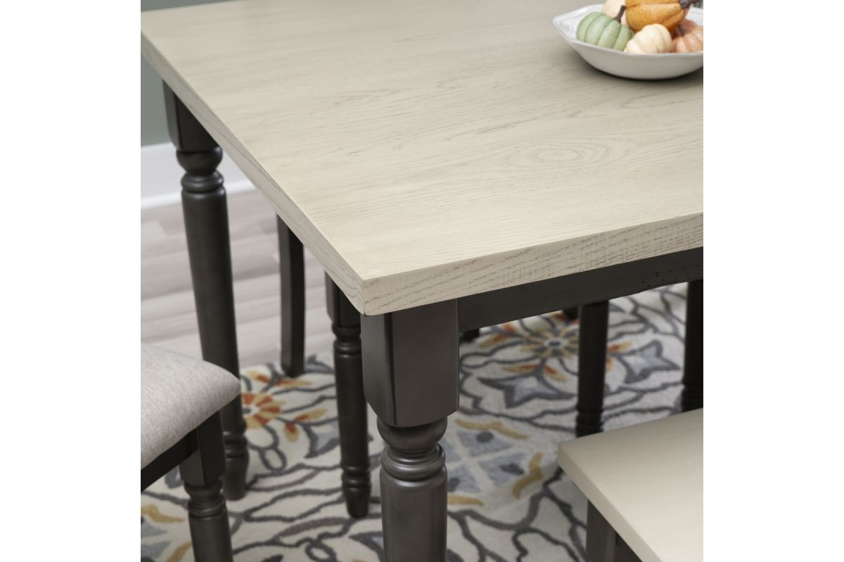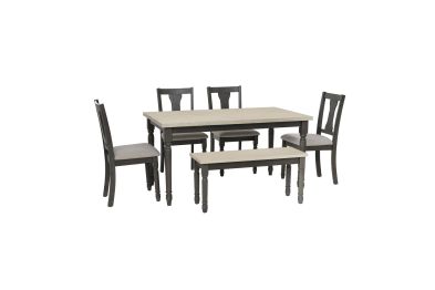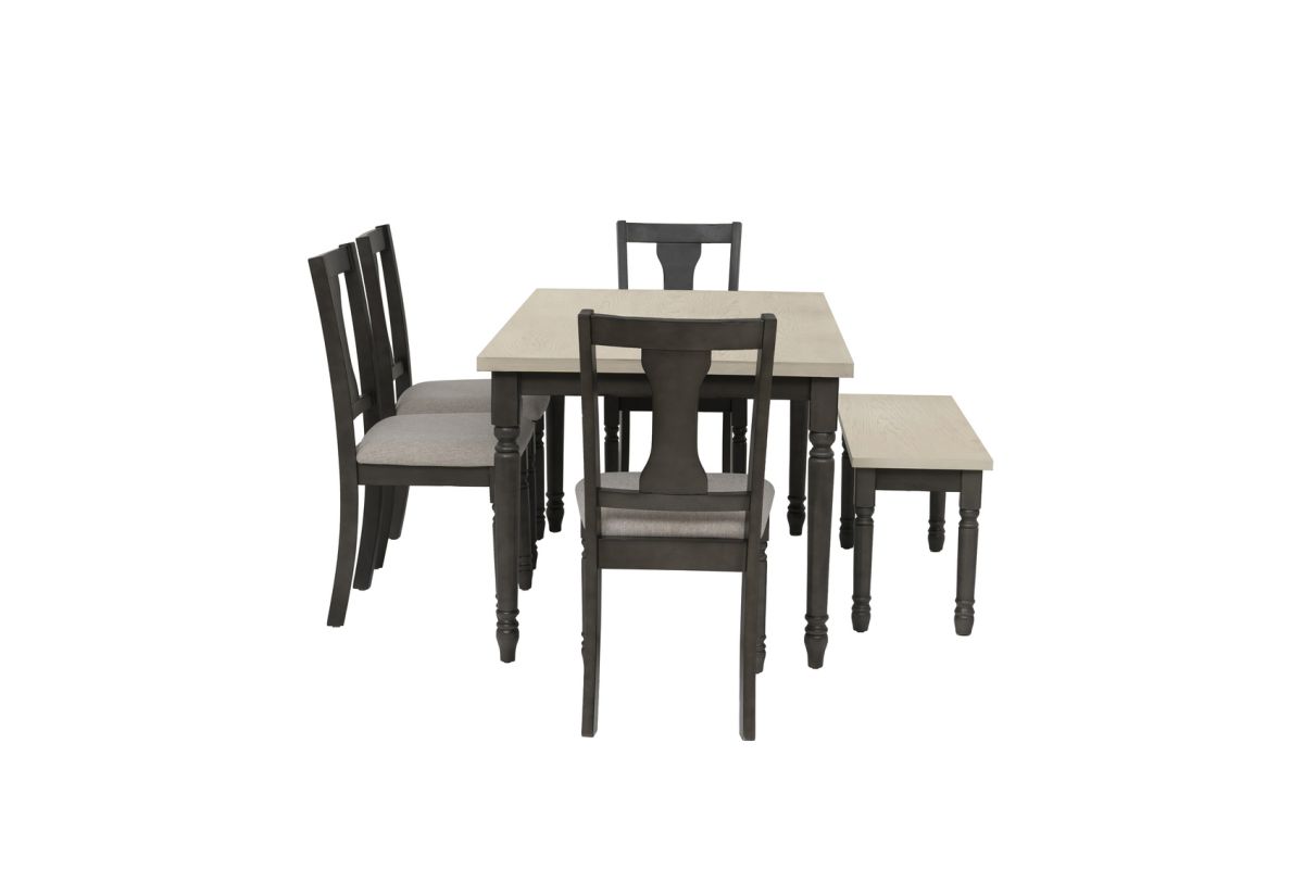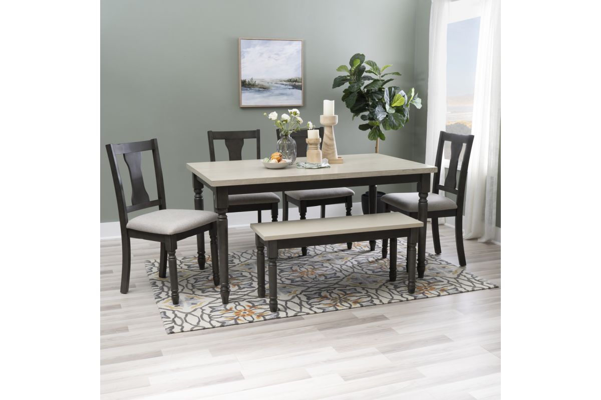 Gather around this striking six-piece dining set featuring a spacious dining table, four matching chairs and handy bench. Comfortably accommodates six adults. Constructed from solid rubberwood with an smokey white oak wood veneer top over a dark grey foundation, the table offers a farmhouse warmth complemented by the crisp chair utilizing stain resistant fabric. Neutral hues suit any color scheme while the padded upholstery ensures premium comfort. By balancing durability with style, this set offers long-lasting beauty for years to come. Assembly required.