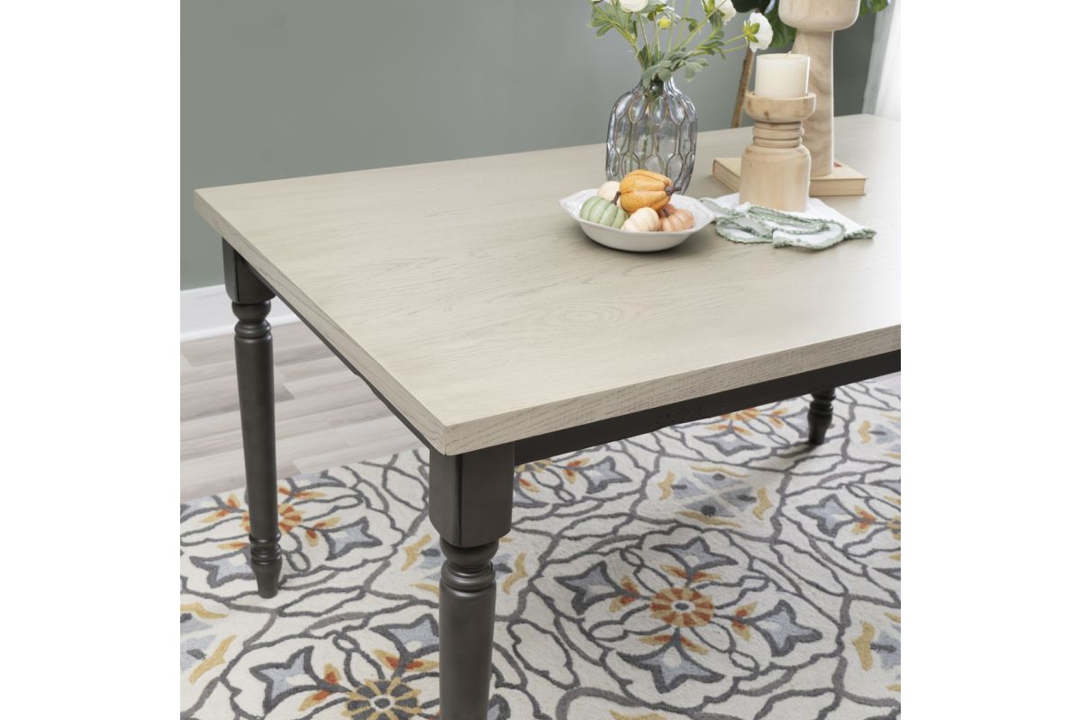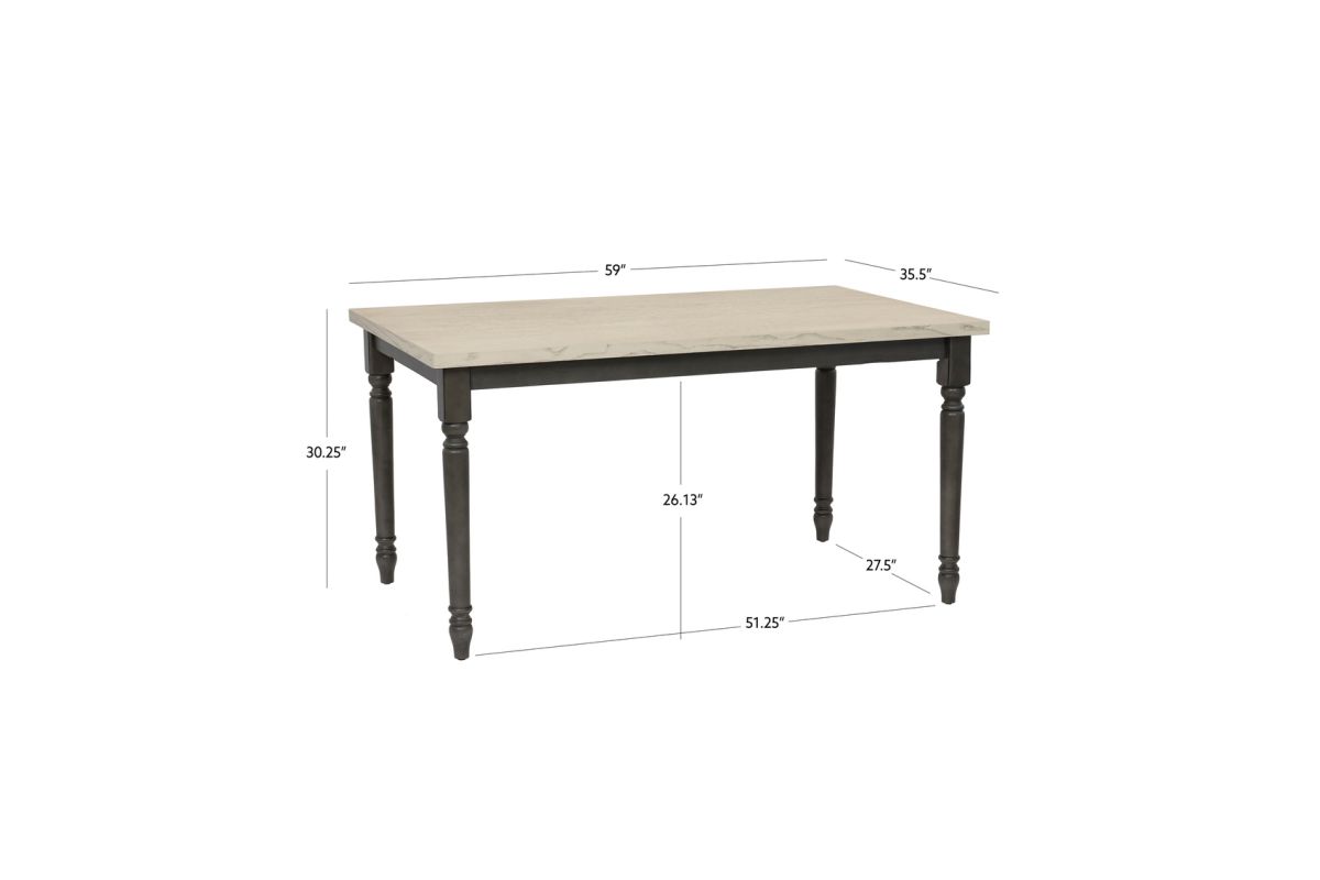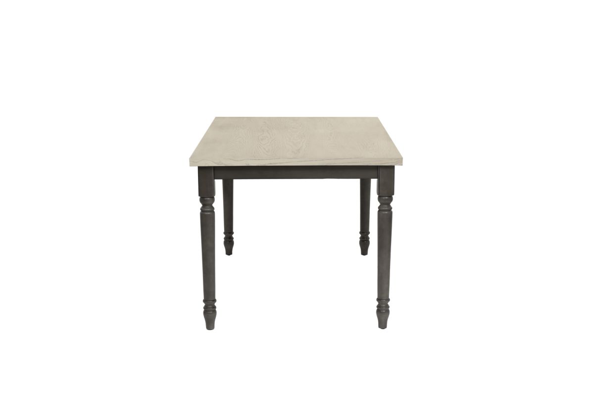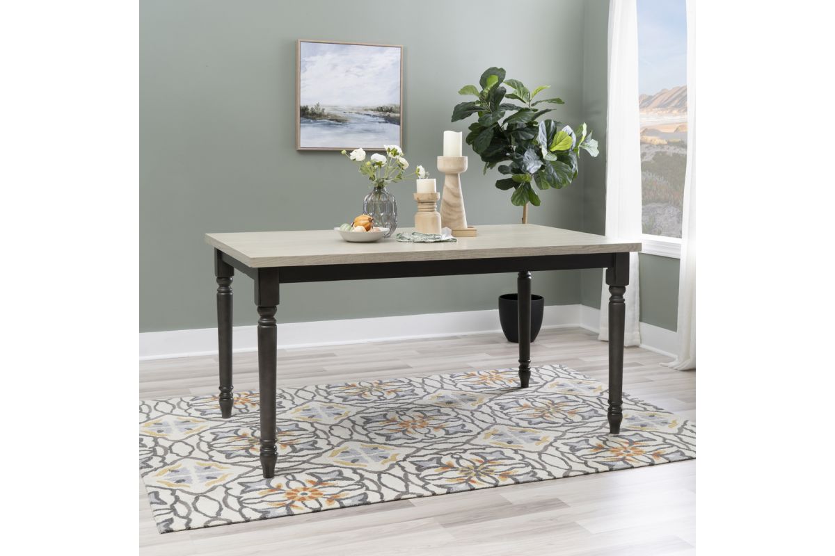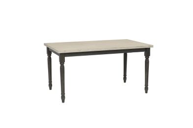 Striking combination of a smokey white top with dark grey foundation, this dining table will make a statement in your home. Multi-step brushed finish brings out the rich grain of the oak wood veneer. Sculpted, turned legs with glaze finish add a farmhouse touch. Solid wood construction that is built to last. Comfortably accommodates 4 to 6 for dining or game night. Assembly required.