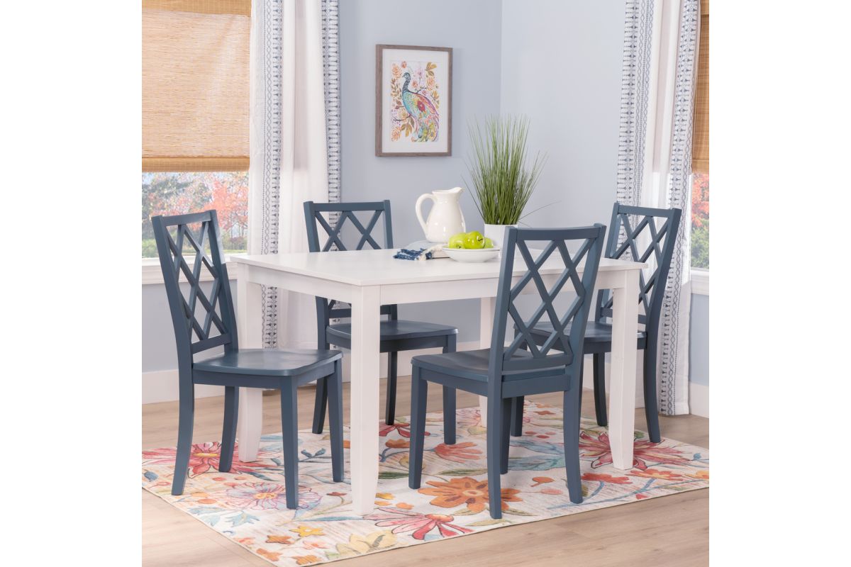 Create a charming, welcoming atmosphere in your dining space with this elegant 5-piece set. Featuring a sturdy rectangular table in pure white, this set is accented by 4 chairs in a striking graphite finish, offering a bold yet sophisticated contrast. The lattice-back design on each chair adds a classic farmhouse touch while maintaining an open and airy look for contemporary appeal. Constructed from durable wood and MDF, this ensemble is built to endure everyday meals, gatherings, and heartfelt conversations. Ideal for kitchens, dining rooms, or breakfast nooks, this set effortlessly blends into both modern and traditional interiors. Assembly required.