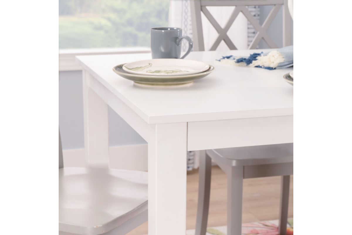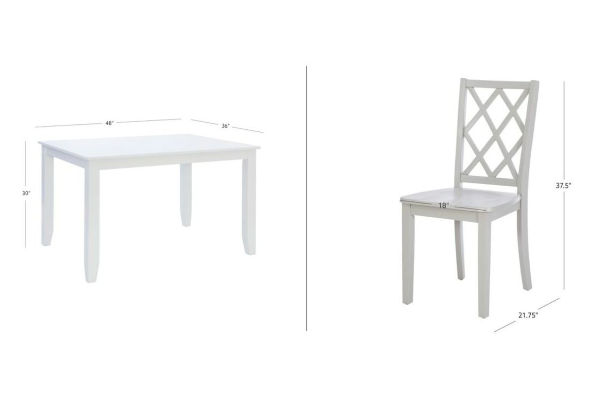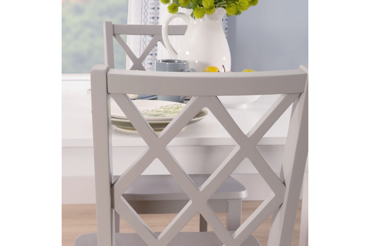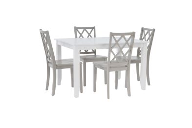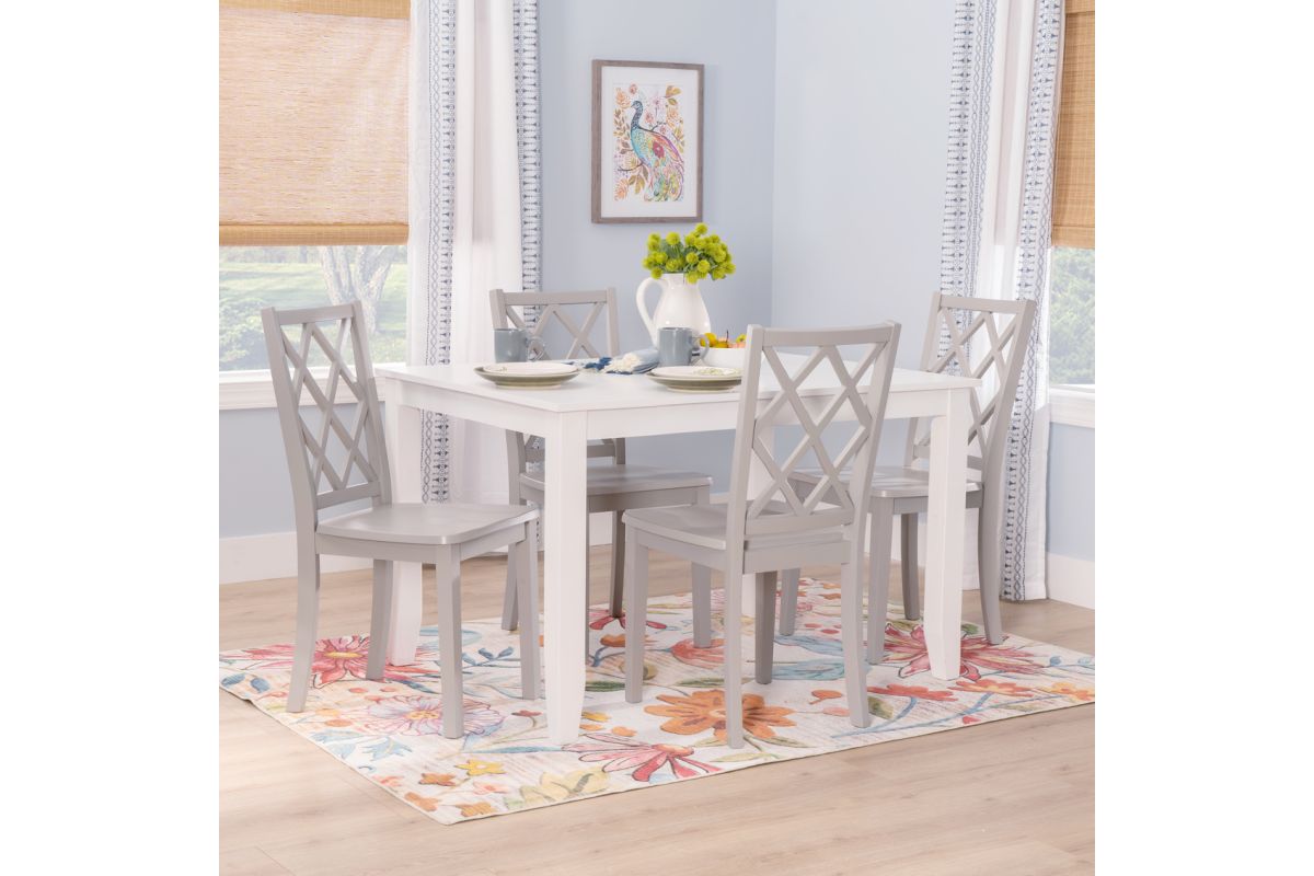 Bring warmth and sophistication to your dining area with this charming 5-piece set. The sturdy rectangular table, finished in pure white, pairs beautifully with 4 chairs in a soft grey tone, creating a serene and versatile palette. The lattice-back chairs lend an air of classic elegance with open silhouettes that keep the space feeling light and inviting. Crafted from durable wood and MDF, this set is built for the daily rhythms of meals, family gatherings, and moments of relaxation. Perfect for kitchens, dining rooms, or breakfast nooks, it complements both traditional and contemporary interiors effortlessly. Assembly required.