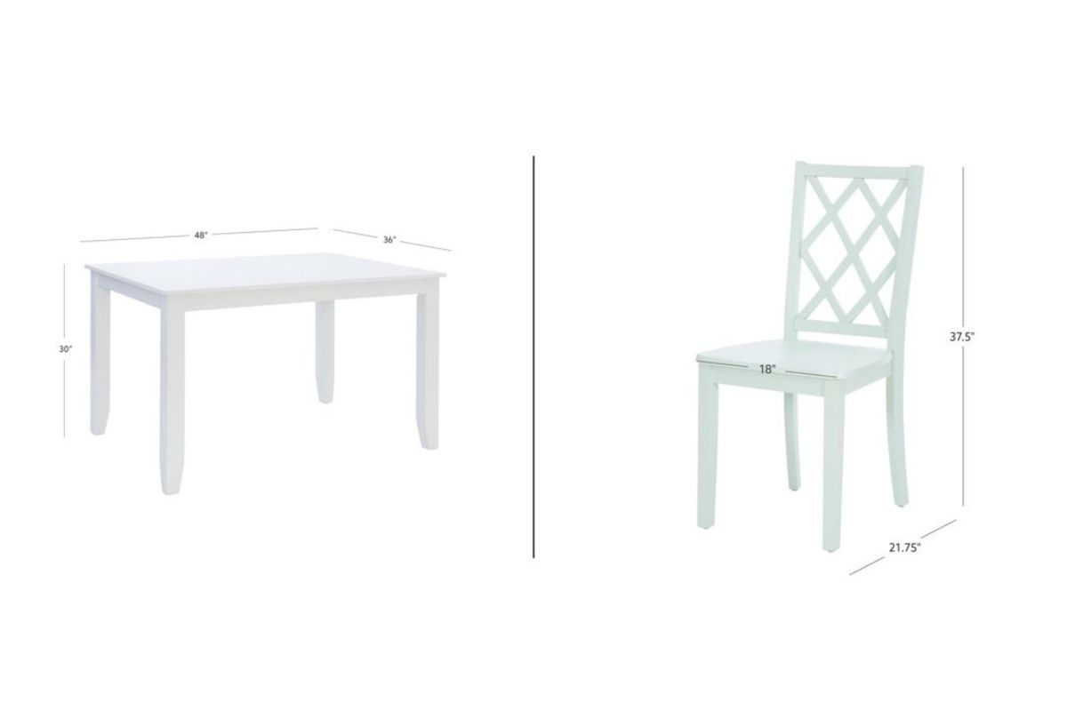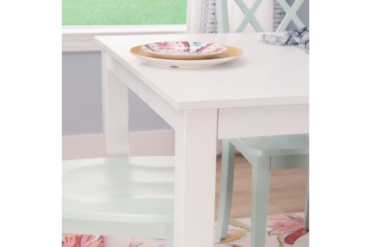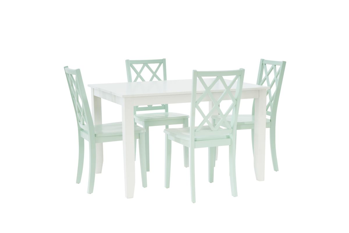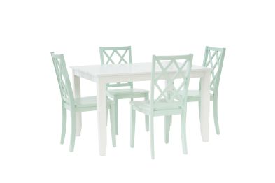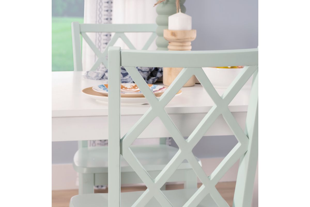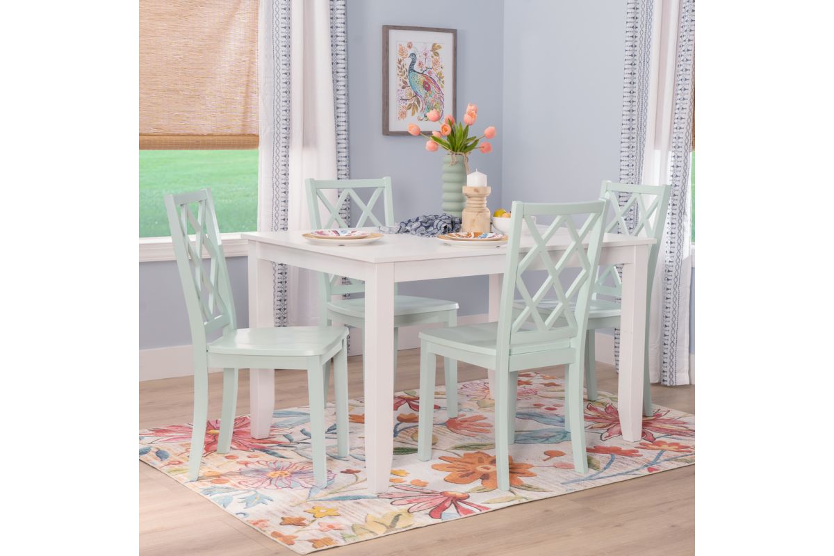 Create a charming, welcoming atmosphere in your dining space with this elegant 5-piece set. Featuring a sturdy rectangular table in a crisp white finish, the set is beautifully complemented by 4 chairs in a soft mint green, bringing a playful pop of color to the room. The chairs showcase a lattice-back design that adds a touch of timeless sophistication while keeping the look light and open. Crafted from durable wood and MDF, this set is designed to withstand daily meals, gatherings, and cozy conversations. Perfect for kitchens, dining rooms, or breakfast nooks, this set serves as a cohesive foundation for traditional and contemporary homes. Assembly required.