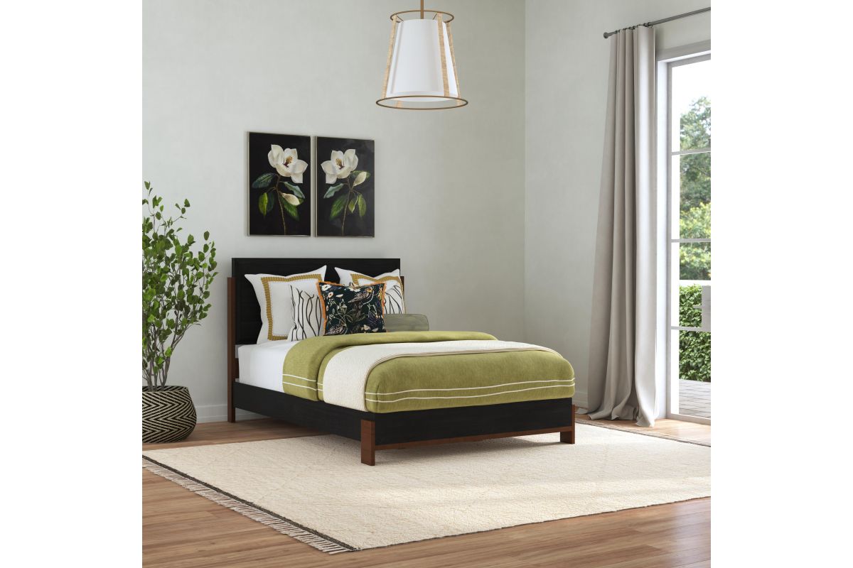 Add effortless style and architectural appeal to your bedroom with the Waterfall Queen panel bed. This platform-style bed features a timeless silhouette defined by clean lines and simple geometric shapes. Dark brown-finished base accents add a striking contrast to the deep ebony finish, while the clean, rich headboard brings an element of softness to the aesthetic. Expertly crafted from solid rubberwood and oak veneers, the Waterfall Queen bed offers lasting beauty you can feel good about. Assembly is required upon delivery.