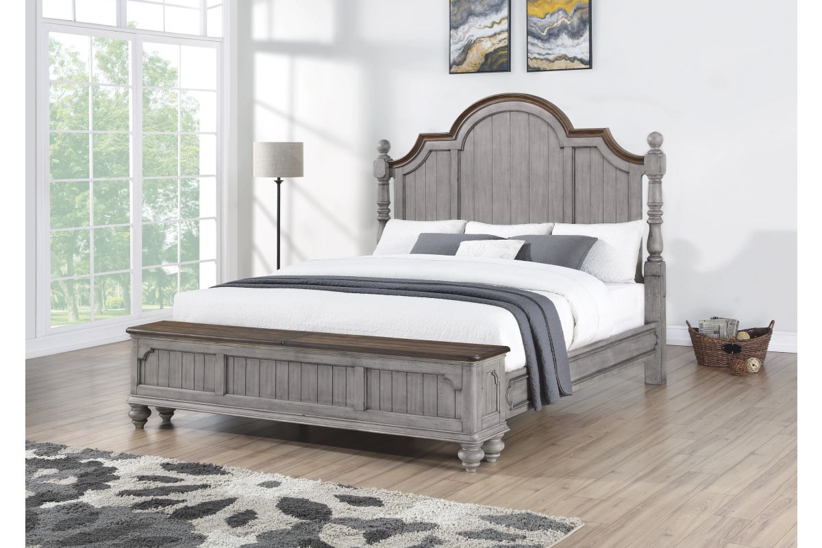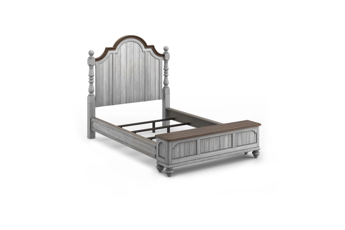 Drift off to sleep in the cozy, cottage-style Plymouth Poster Storage Bed, featuring charming, paneled accents and detailed molding on the headboard and footboard. Available in Queen size as well as King and California King sizes, this bed is crafted with high-quality construction, ensuring it can be enjoyed for generations to come. The graceful, scalloped profile of the headboard and intricately carved posts make this bed a statement piece. The paneled footboard offers concealed, roomy storage for blankets, pillows or clothes, and provides a convenient place to perch while you put on your shoes. Finished in a distressed graywash highlighted by contrasting medium brown accents, the Plymouth poster bed brings warmth and character to any bedroom. Assembly is required upon delivery.