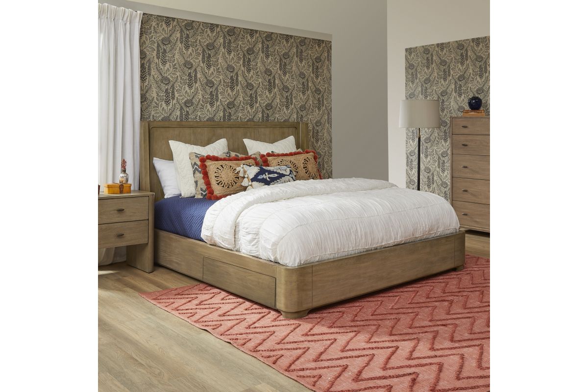 Simple geometry creates a look of timeless elegance for your bedroom with the Normandy King Panel Storage Bed. Inspired by European architecture, this panel storage bed offers a minimalist silhouette featuring an inviting, warm driftwood finish. Standing on a dignified, strong frame, this piece is sure to be a conversation starter. With added storage, the Normandy brings style and function in a regal frame to suit any space. Assembly is required upon delivery.