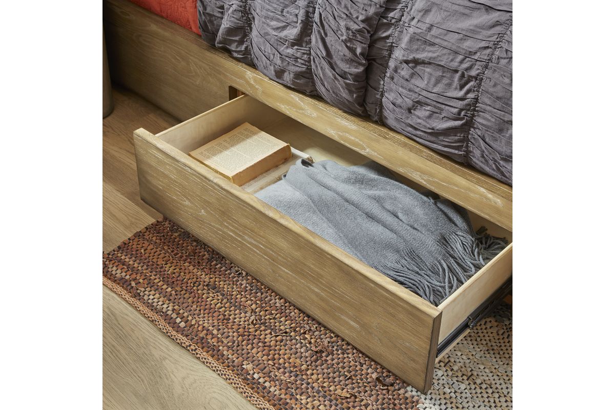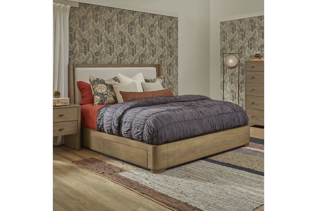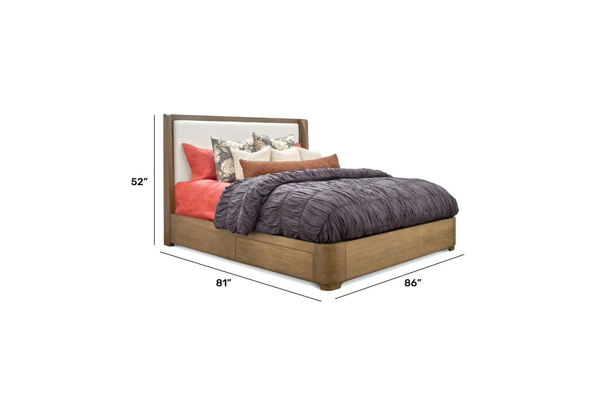 Simple geometry creates a look of timeless elegance for your bedroom with the Normandy King Upholstered Storage Bed. Inspired by European architecture, this storage bed offers a minimalist silhouette featuring an inviting, warm driftwood finish and plush, clean cream upholstery. Standing on a dignified, strong frame, this piece is sure to be a conversation starter. With added storage, the Normandy brings style and function in a regal frame to suit any space. Assembly is required upon delivery.