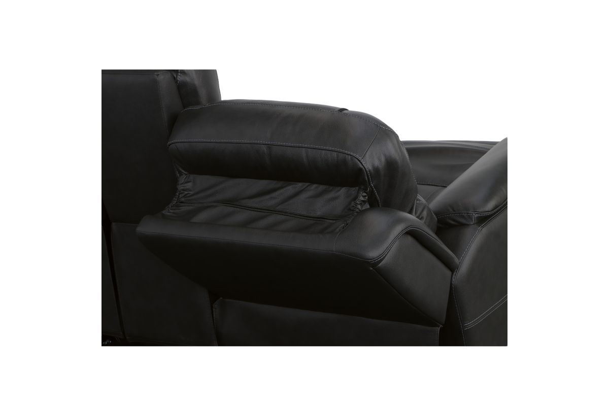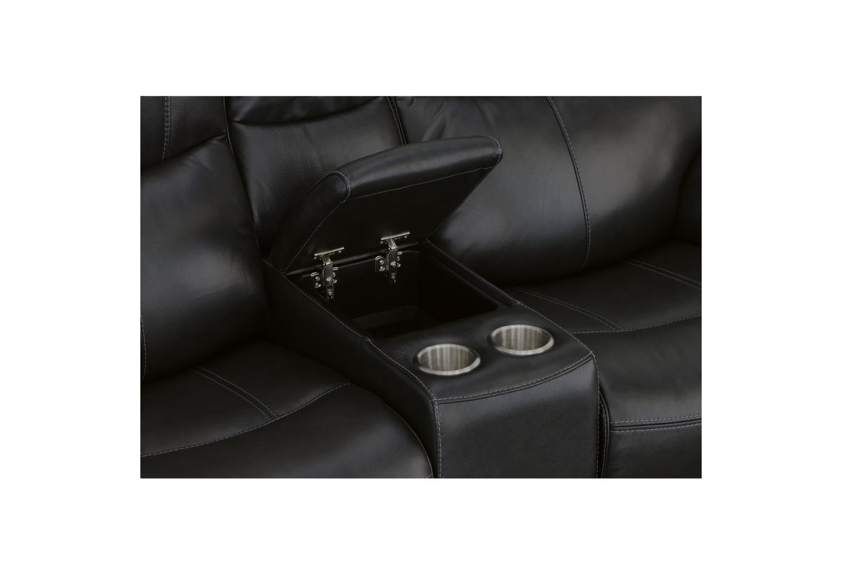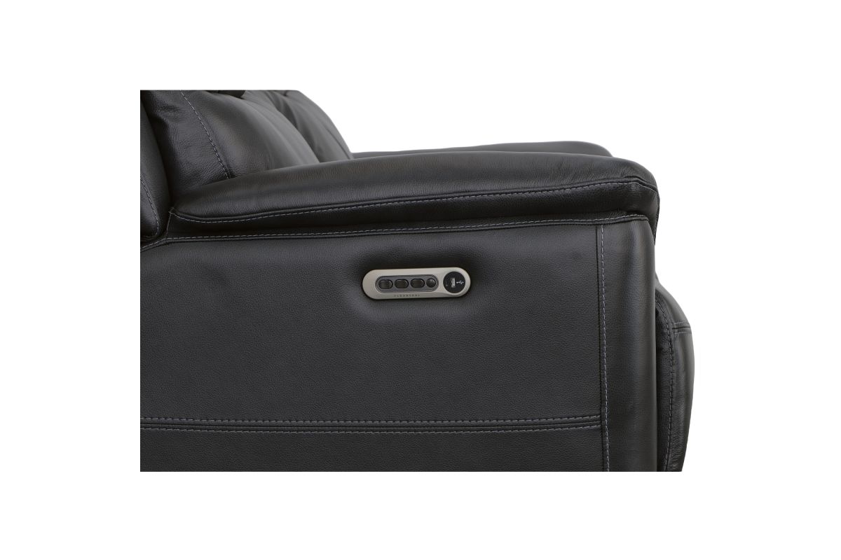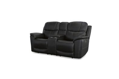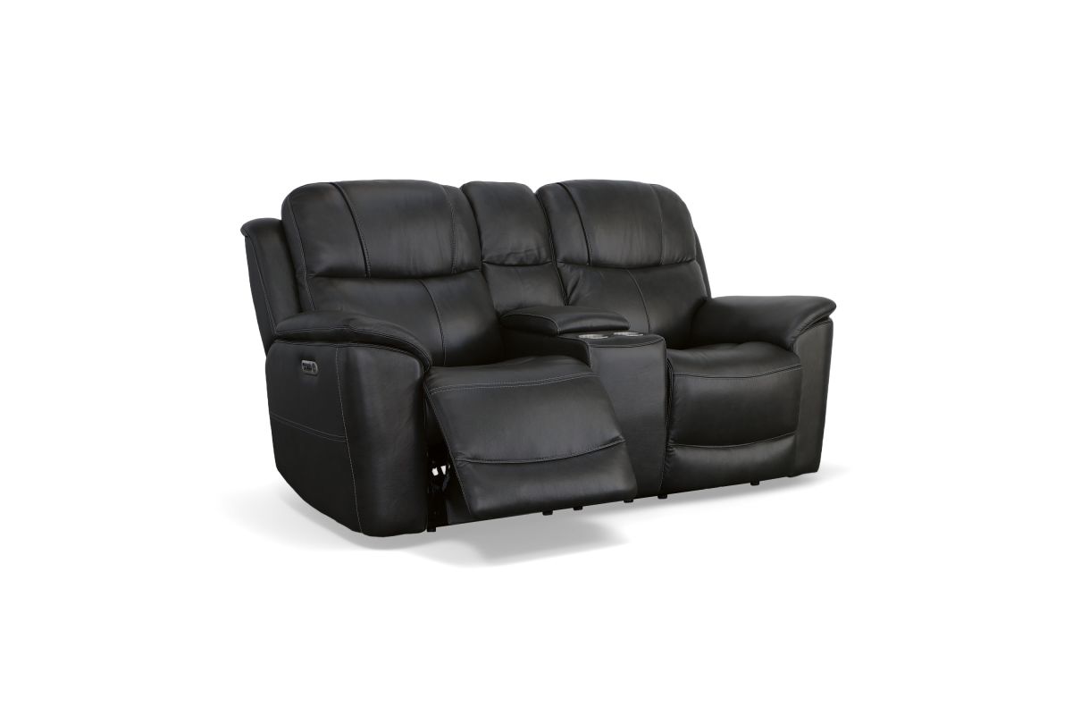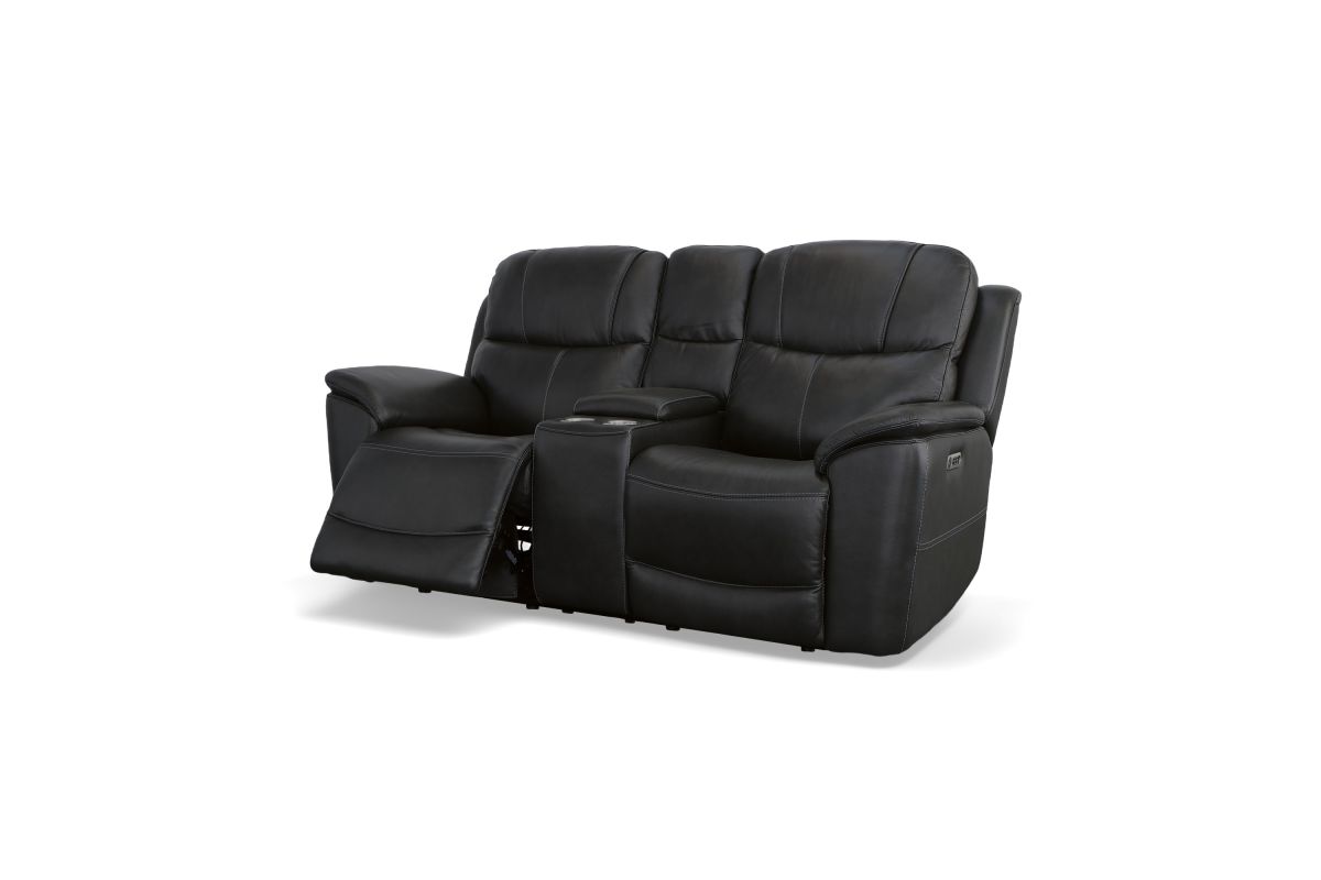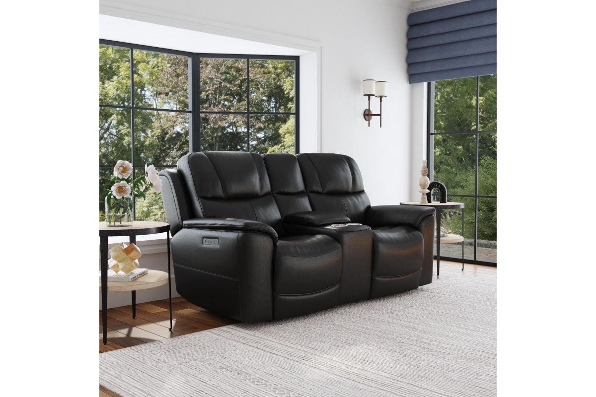Superior ergonomics combine with the plush comfort of the Crew leather power reclining loveseat with console. Featuring triple power functionality that allows for independent adjustment of the headrests, lumbar supports and recline, this loveseat also features Zero Gravity which reduces pressure and tension on the body. Enjoy reliable comfort all day, every day, with pad-over armrests, waterfall chaise footrests, thin layered headrests, and divided back cushions. Built-in USB ports conveniently charge mobile devices while a center storage console keeps remotes and beverages nearby so you can settle in for a marathon movie night. With Flexsteel's patented Blue Steel Spring™ at the heart of each seat, and high-quality raven black leather, the Crew power reclining loveseat brings exceptional beauty and durability to your home.