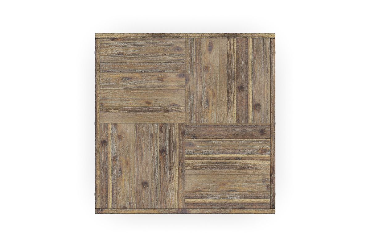 - Solid wood planks are distressed for a reclaimed wood look