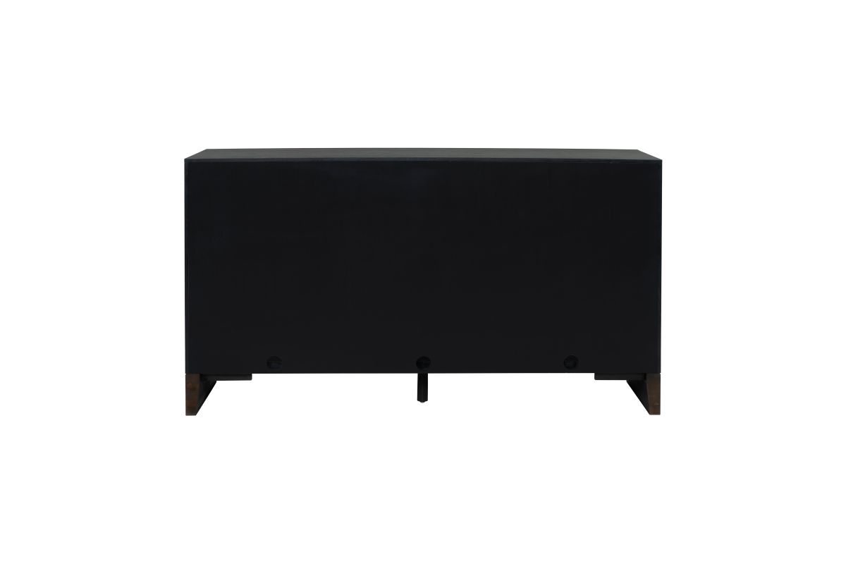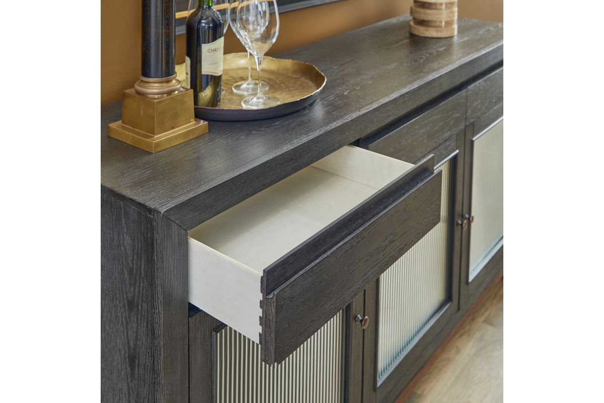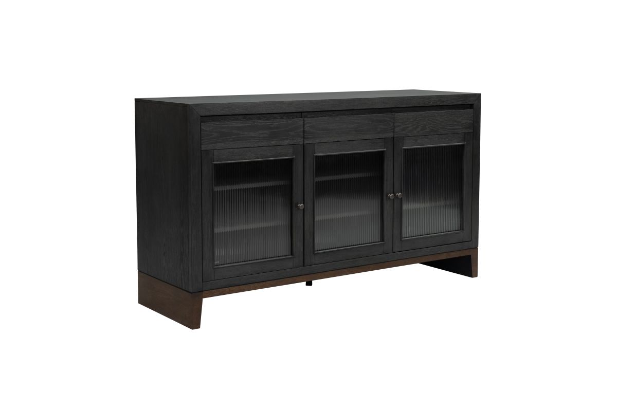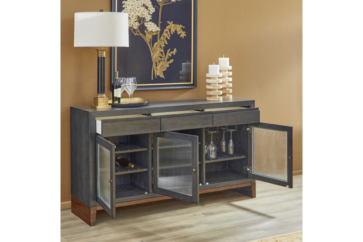 The perfect centerpiece for your transitional space, this gorgeous buffet piece packs all the style and storage you need. The deep ebony finish fits seamlessly with the rich brown base accents for an on-trend color combination. With three gorgeously receded glass front cabinets, adjustable shelves, and ample wine shelves, this piece delivers on style and storage. The decadent gleaming copper hardware brings an antique touch, making this buffet the showstopper in any space.
